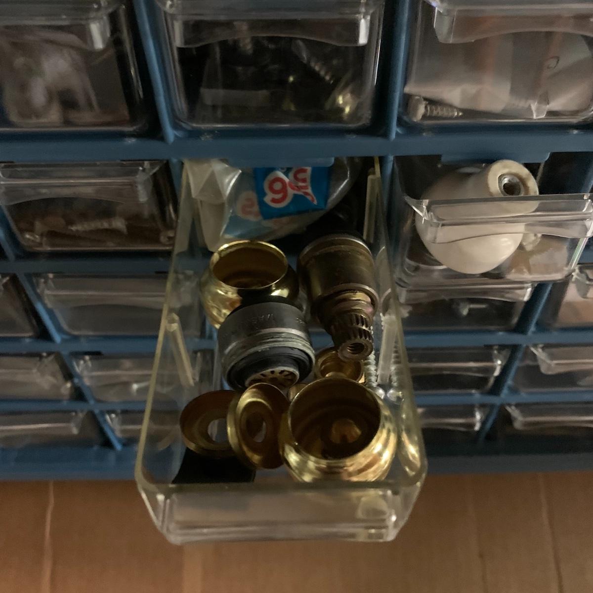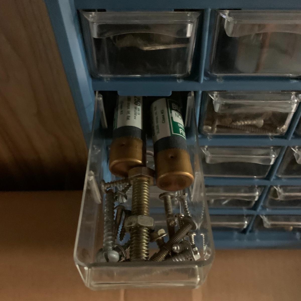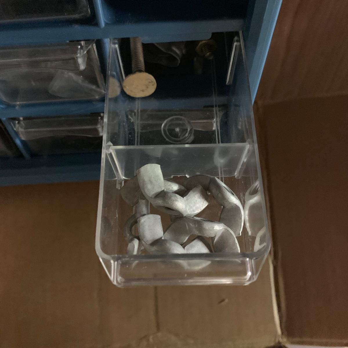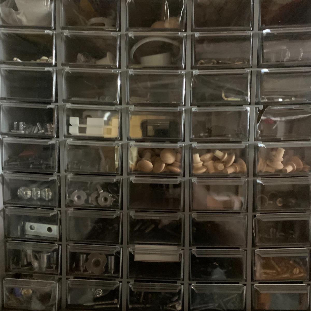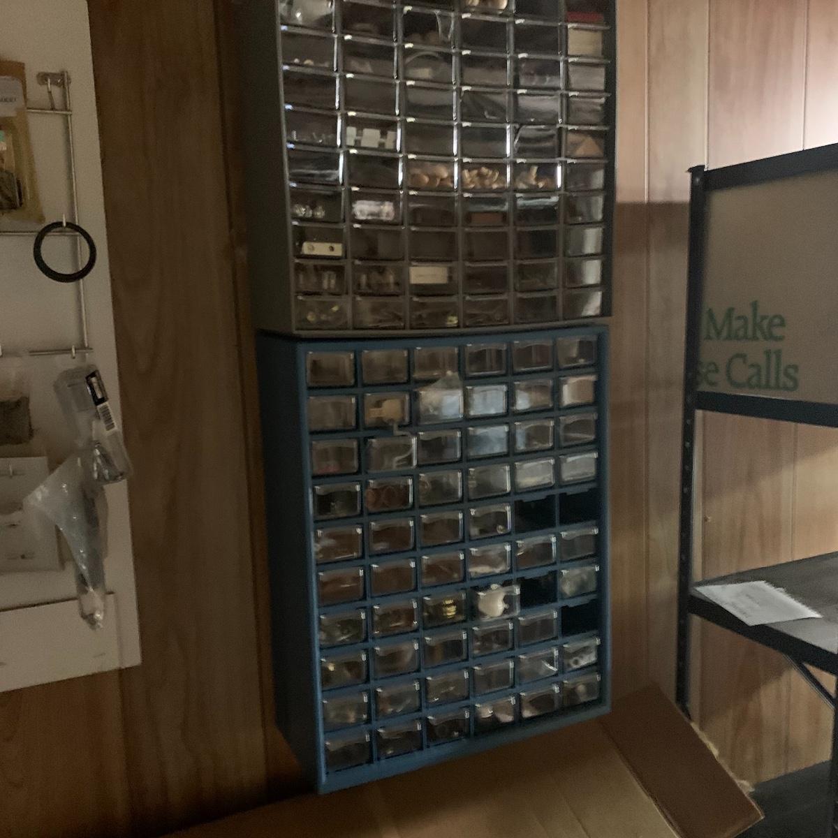 No more digging through drawers or emptying the tool box to find the right fastener! This lot features two large wall mounted organizers full of nuts, nails, screws and everything in between. The blue organizer measures 14.5” x 6.25” x 18” Also offered are three 39” retractable blinds that have never been opened. Last is everything hanging on the display rack, much of it new in boxes. Local pickup only.