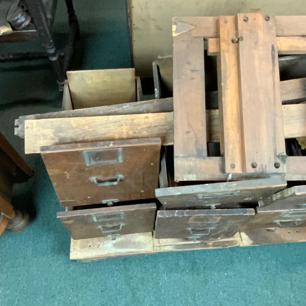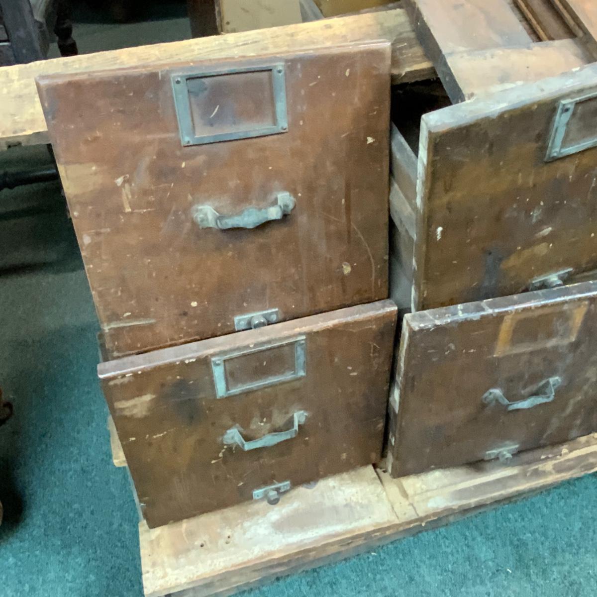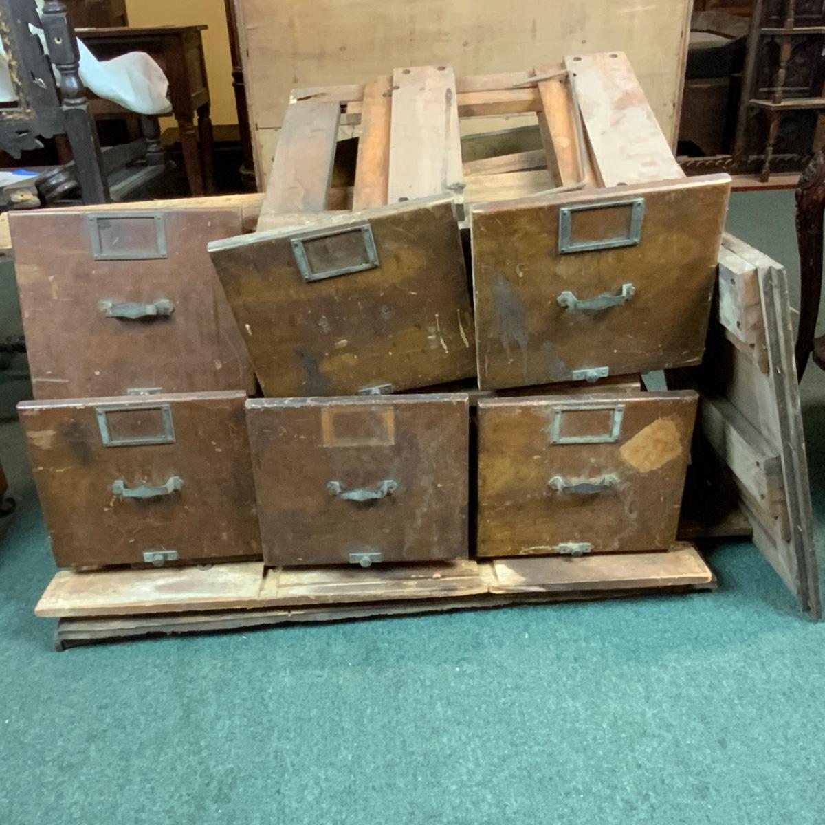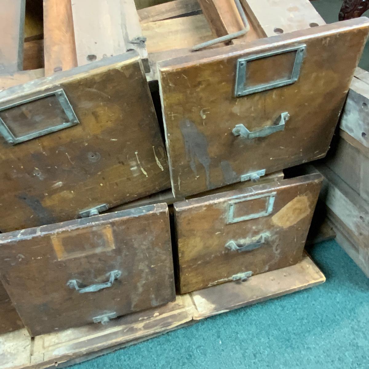 Industrial Salvage! Six drawers with original hardware and additional parts. You could make these into anything you want! //::\\ Please see photos for details and condition. No attempt has been made to hide any imperfections. All items listed in this auction are warehouse items, and need to be cleaned. A majority of the items need restoration as well. All items are sold AS IS and WITHOUT GUARANTEE. If you are uncertain about an item, DO NOT BID. Due to the nature of this online auction in-person inspection is HIGHLY recommended. All Sales are FINAL. Pick Up Times are FIRM. Please confirm with your own schedule that you can pick up in the scheduled times listed in the Terms and Conditions. Any questions please message the auctioneer. DO NOT Contact The Harp Gallery.