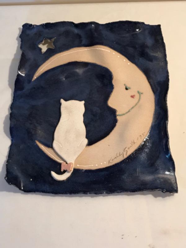 Kimberly Smith signed “Cat and The Moon “ ceramic wall hanging measuring 12”x10-1/2”