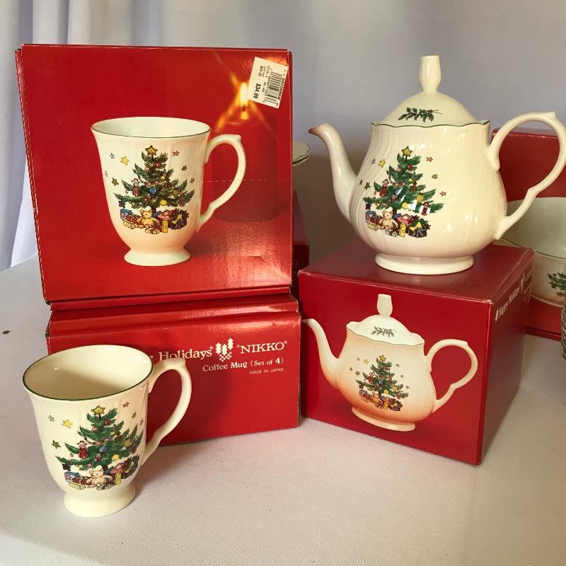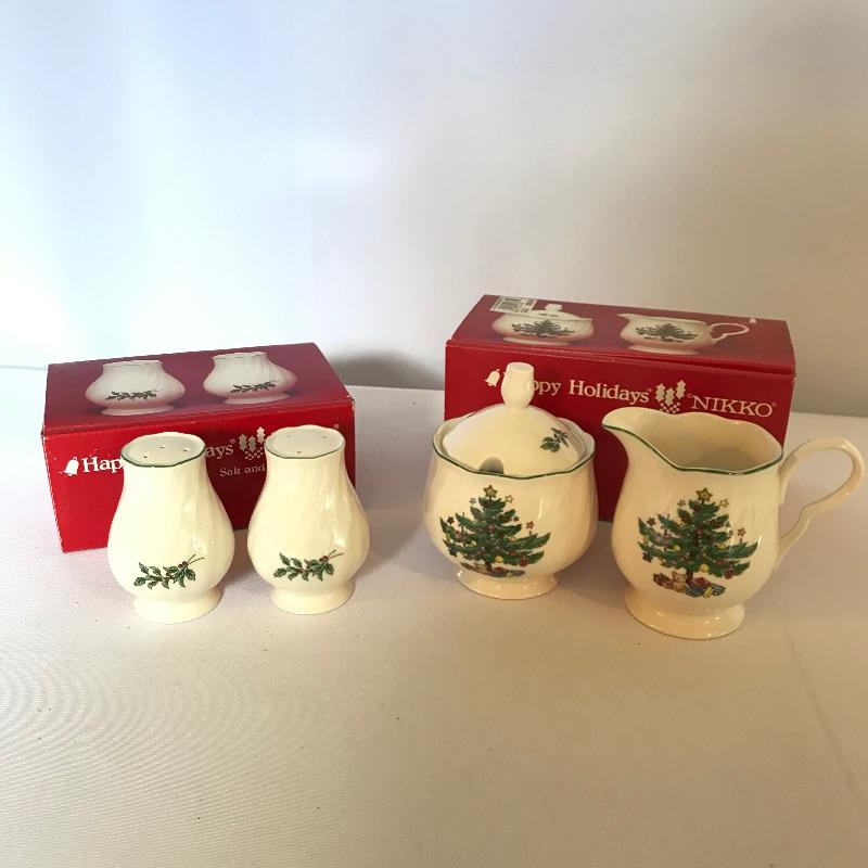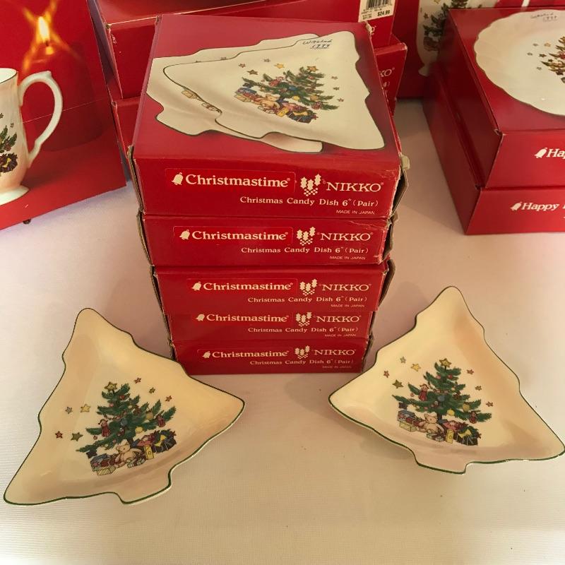 Nikko Christmas tree serving and dining dishes for your happy holiday meals. Nikko dishes 6” tree shaped candy dishes, eight 8” salad/dessert plates, ten 10.5” dinner plates, ten 7.5” bowls, a small teapot with eight coffee mugs. Serving dishes include a 9.5” vegetable bowl, a deep 8.5” salad bowl, 14” oval platter, a small 9” mint tray, salt & pepper shakers and finally a sugar/cream set. Other non-Nikko items are a set of eight felt napkin holders and a 10” Fitz and Floyd cookie plate a perfect fit for Santa. Most dishes come with original boxes perfect for storage. See photos.