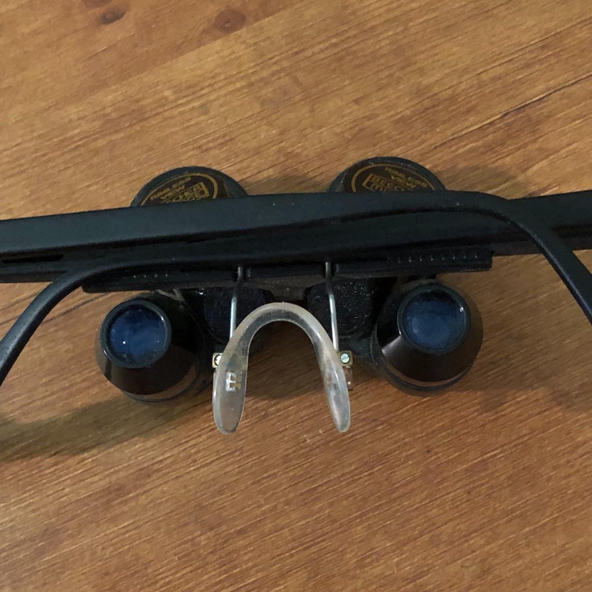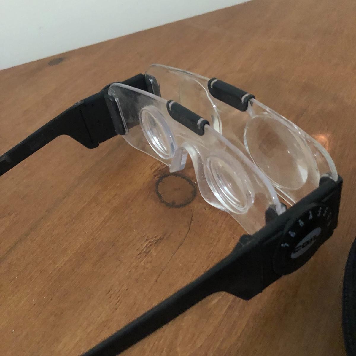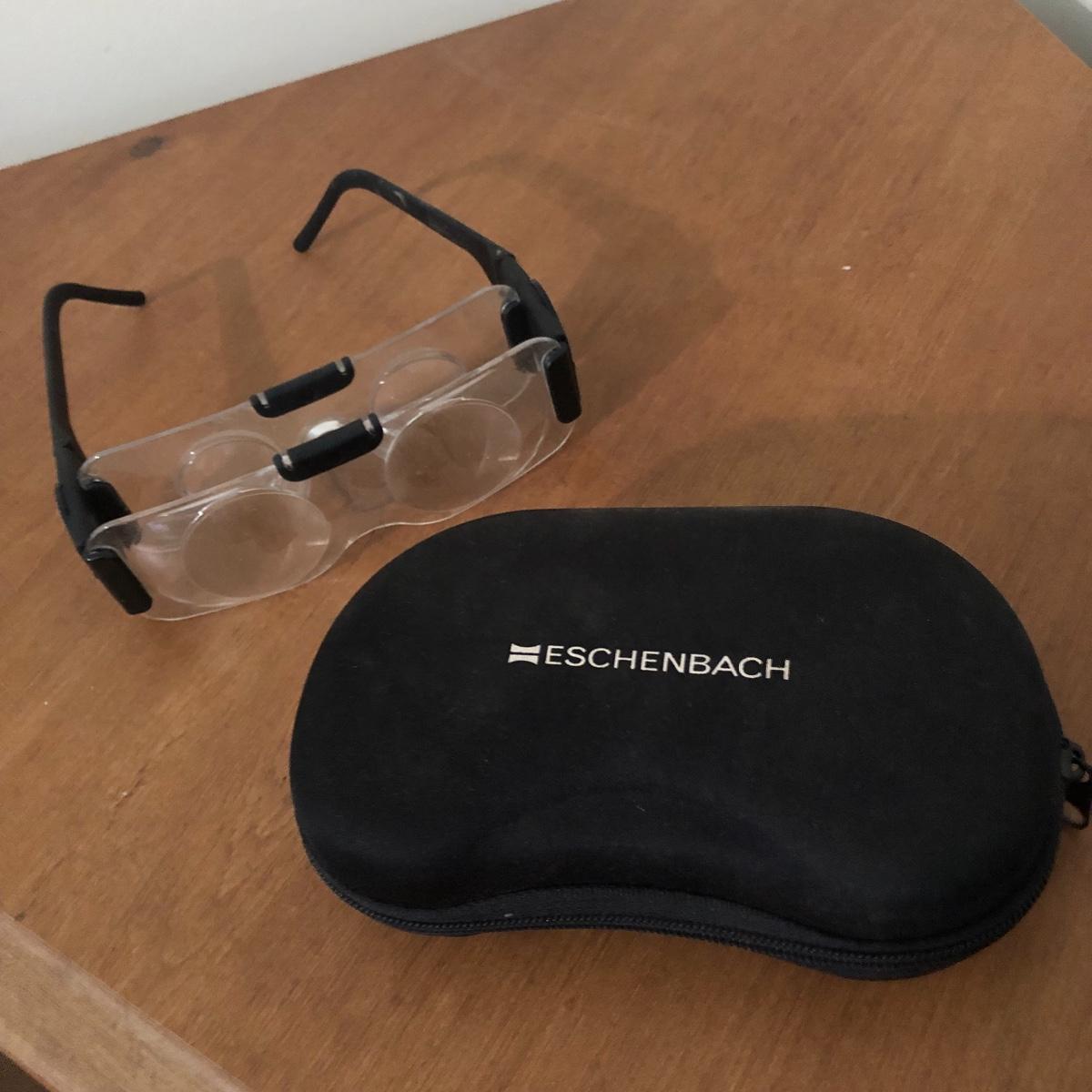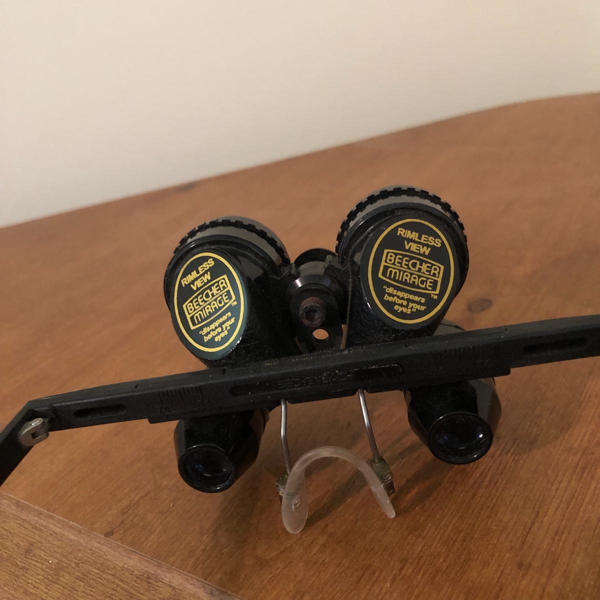 See the detail of your trade with this lot! It includes high end magnifiers: two Optivisor headband magnifiers (with two additional oval magnifiers), a Beecher Mirage rimless view (5.5x wide angle) and two Eschenbach maxTV glasses. The Eschenbach glasses were made in Germany. Shipping Available.