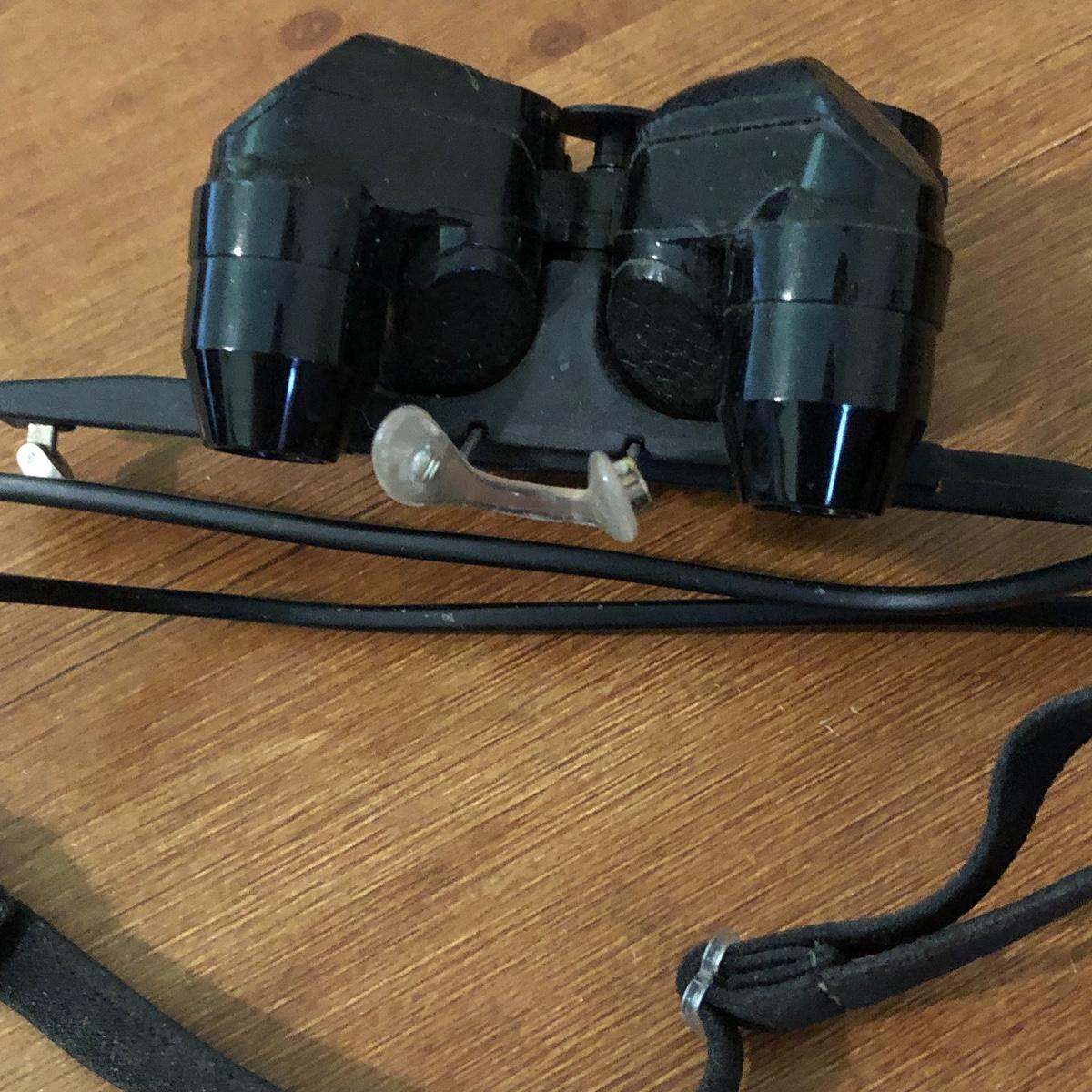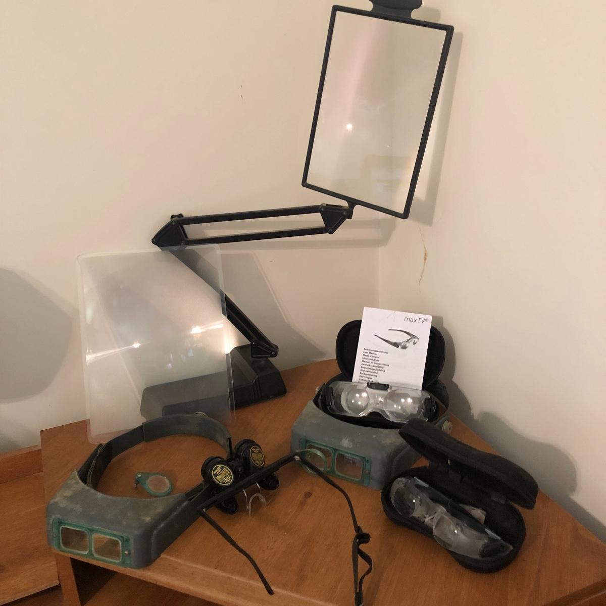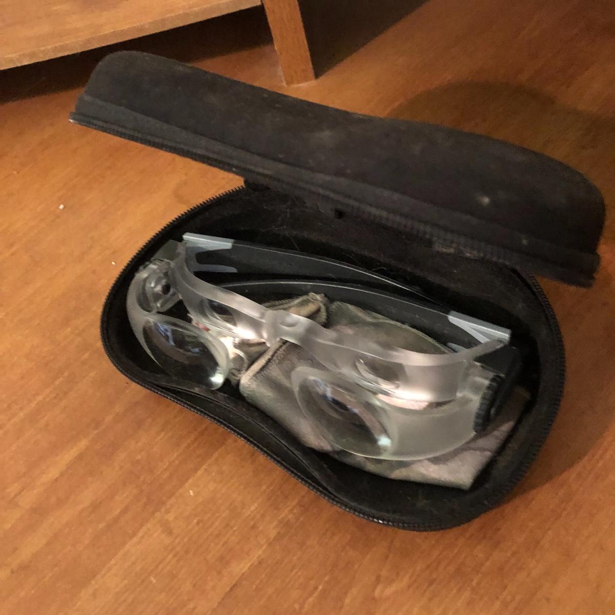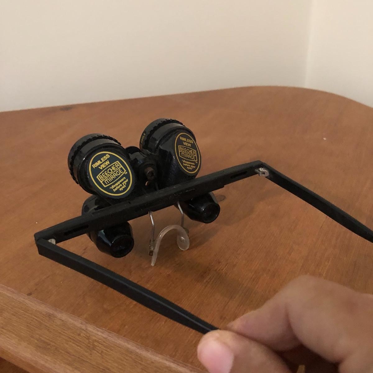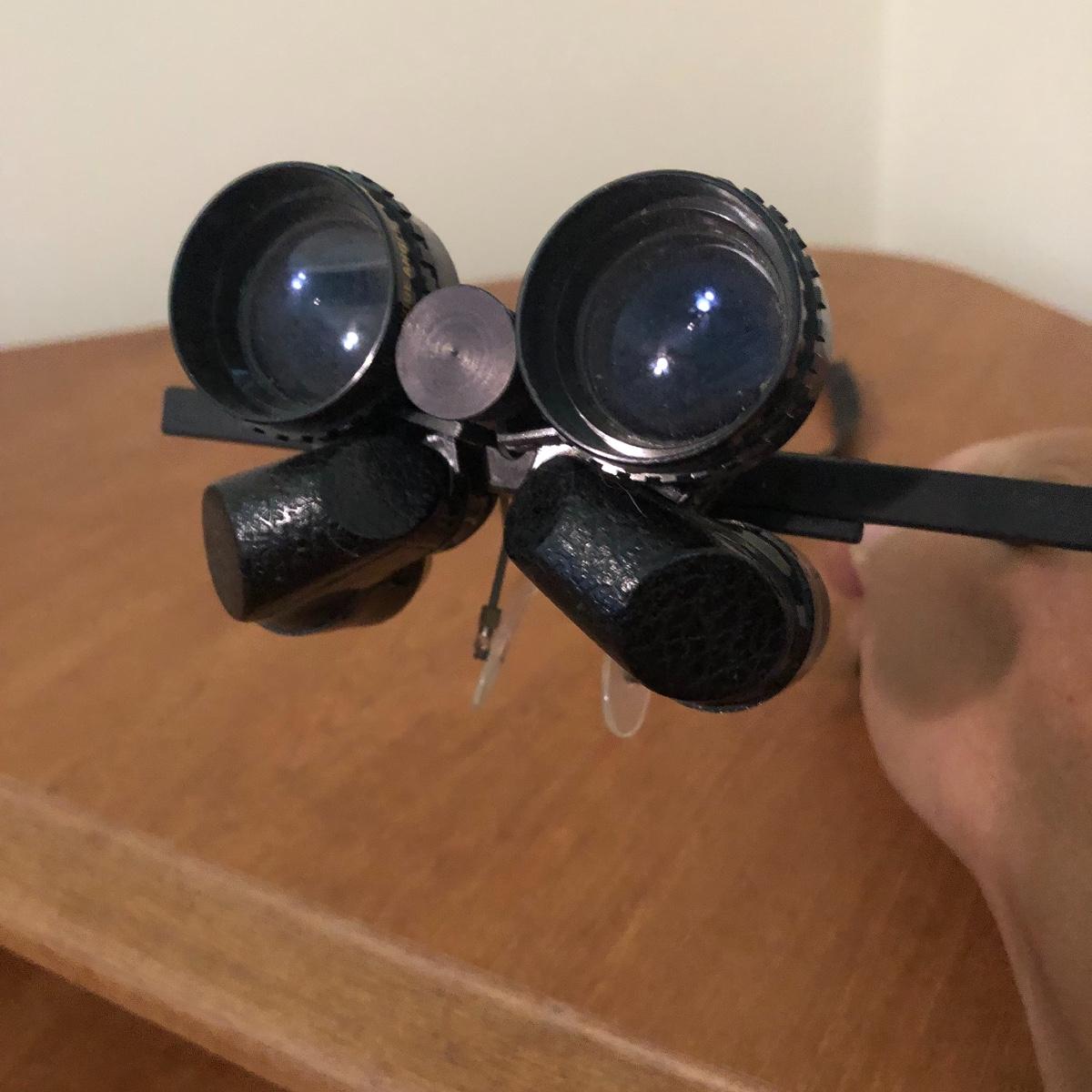 See the detail of your trade with this lot! It includes high end magnifiers: two Optivisor headband magnifiers (with two additional oval magnifiers), a Beecher Mirage rimless view (5.5x wide angle) and two Eschenbach maxTV glasses. The Eschenbach glasses were made in Germany. Shipping Available.