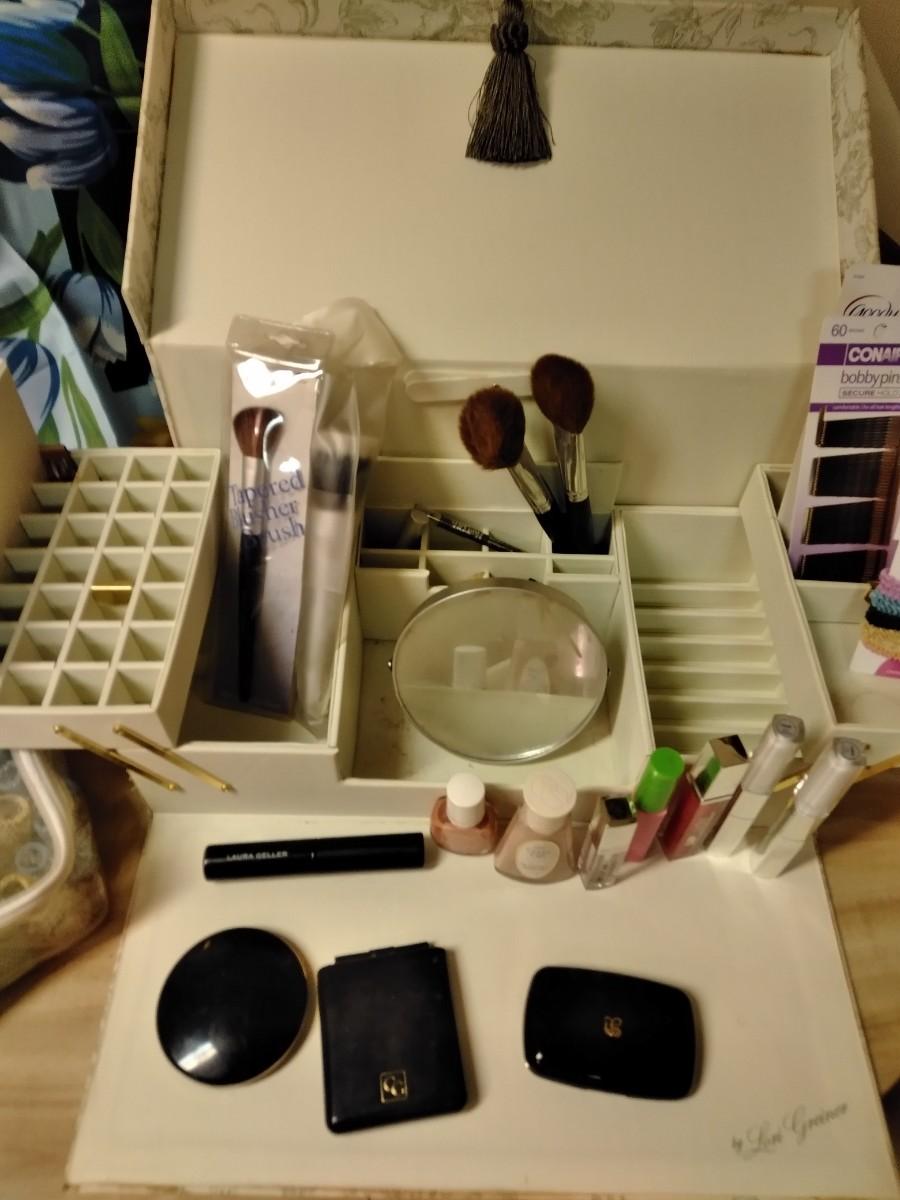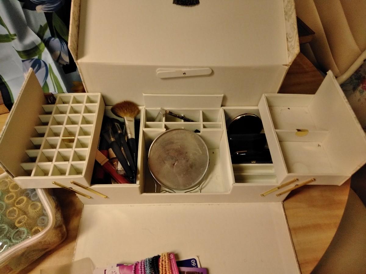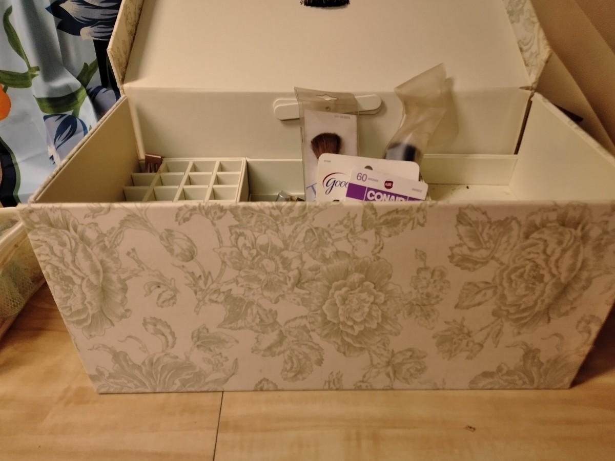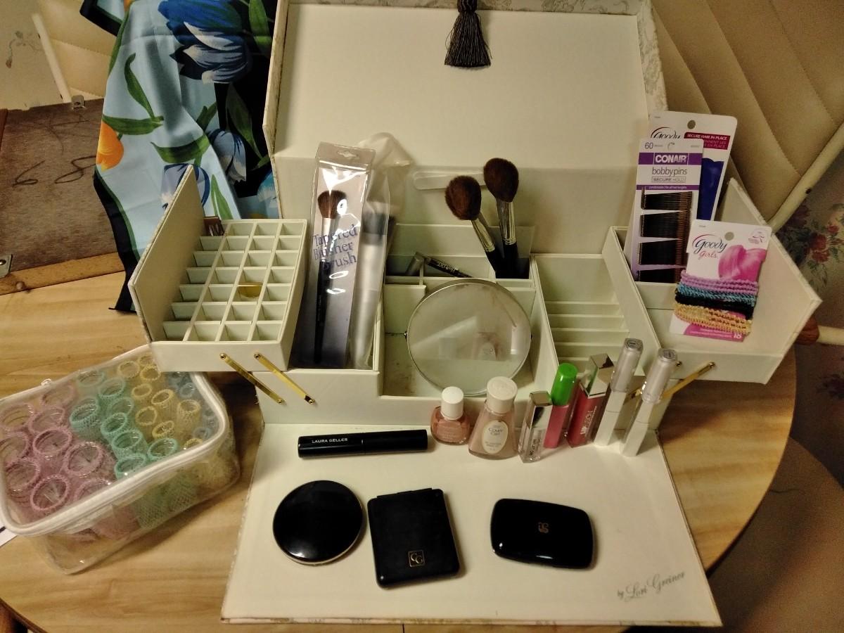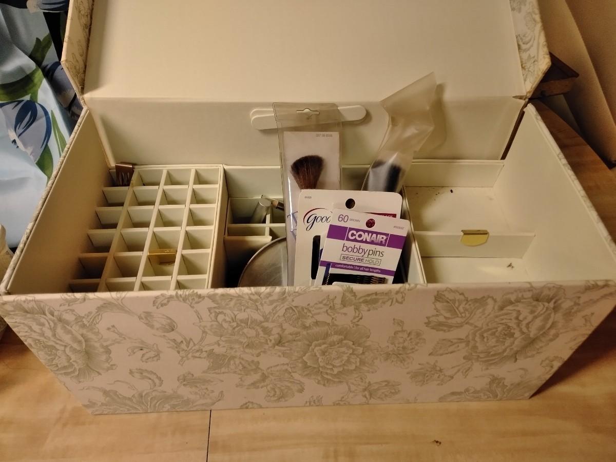 MAKE UP ORGANIZER BOX WITH MAKEUP ITEMS.