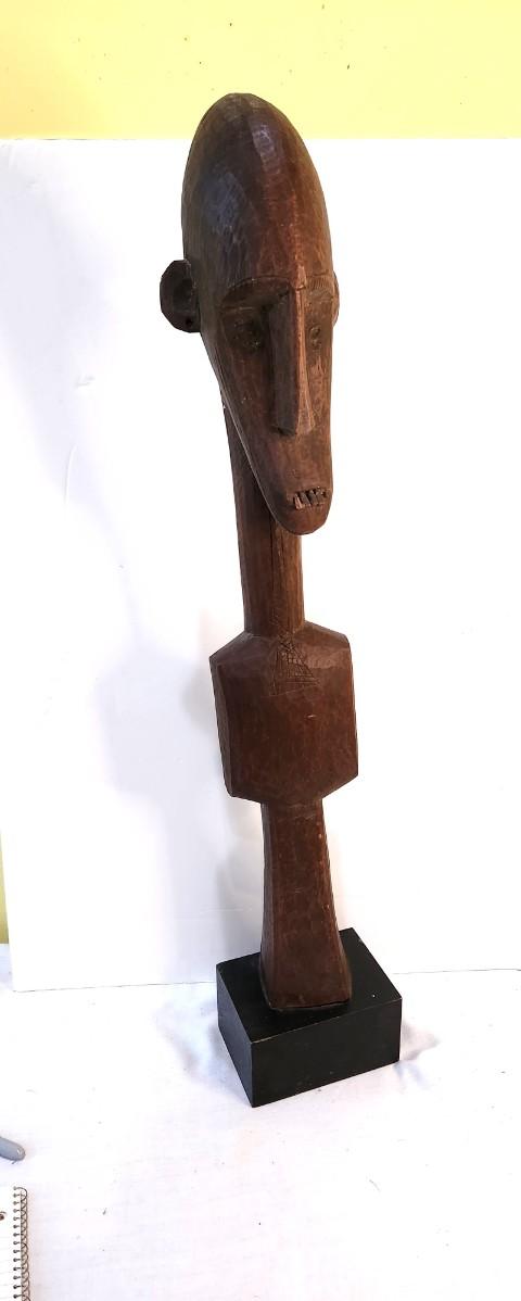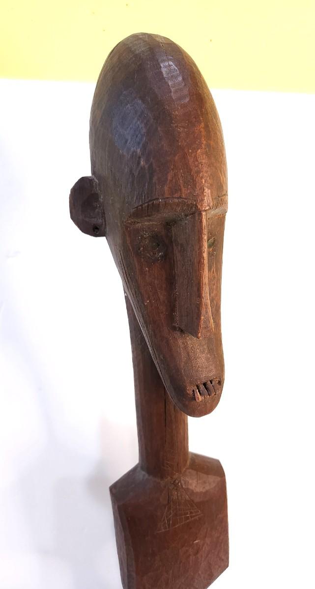 from the Bozo tribe of Mali - elongated head puppet - old patina - cracks - stylized bust/head with elongated face - once had glass eyes - mouth lined with teeth. 29" tall on base. Antique condition.