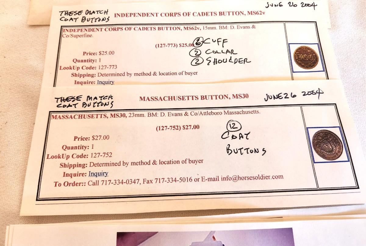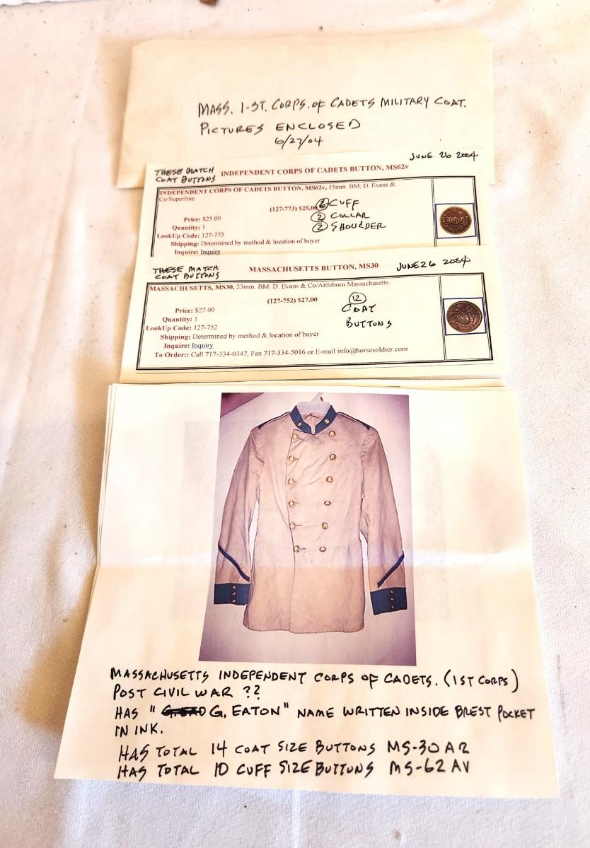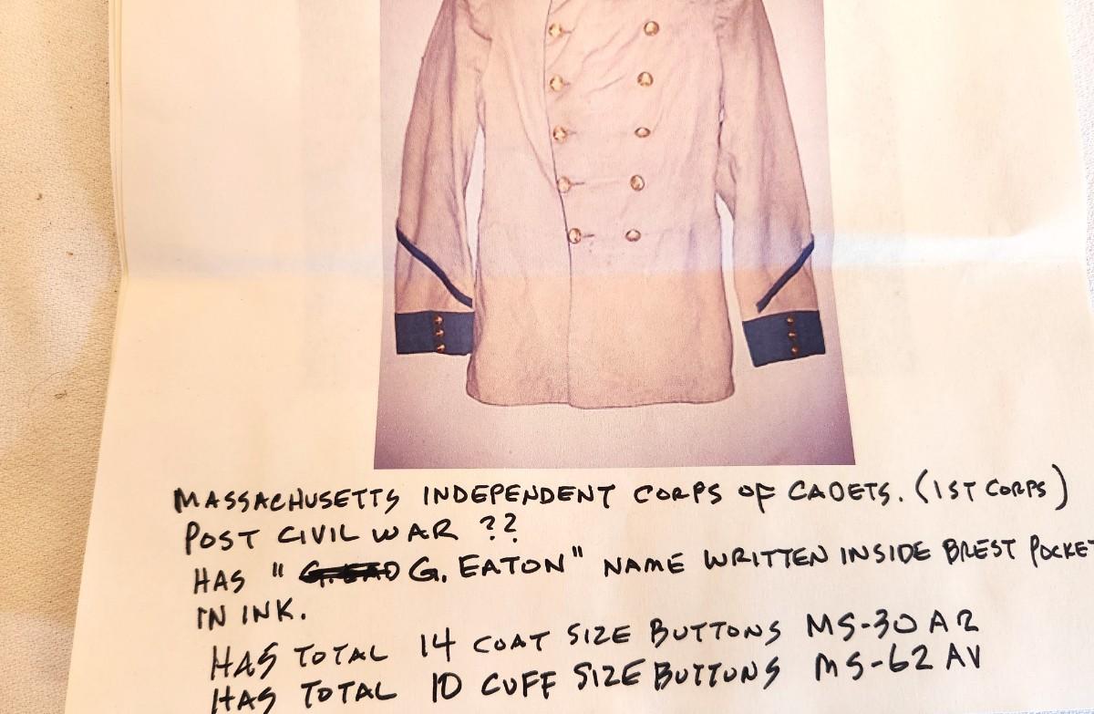 Post Civil War tailored Military Coat (not a costume) - Massachusetts 1st Cadet Corps - original buttons - named wearer (name written inside coat pocket. On the small side (men smaller back then) - pit to pit: 15", 29" long. Paperwork showing buttons, photo of coat, etc. This was stored and wrapped in a box. The 1st Cadet Corps has been round since before the Revolutionary War - their primary function was to guard the Royal Governors - now they operate in more of a ceremonial capacity.