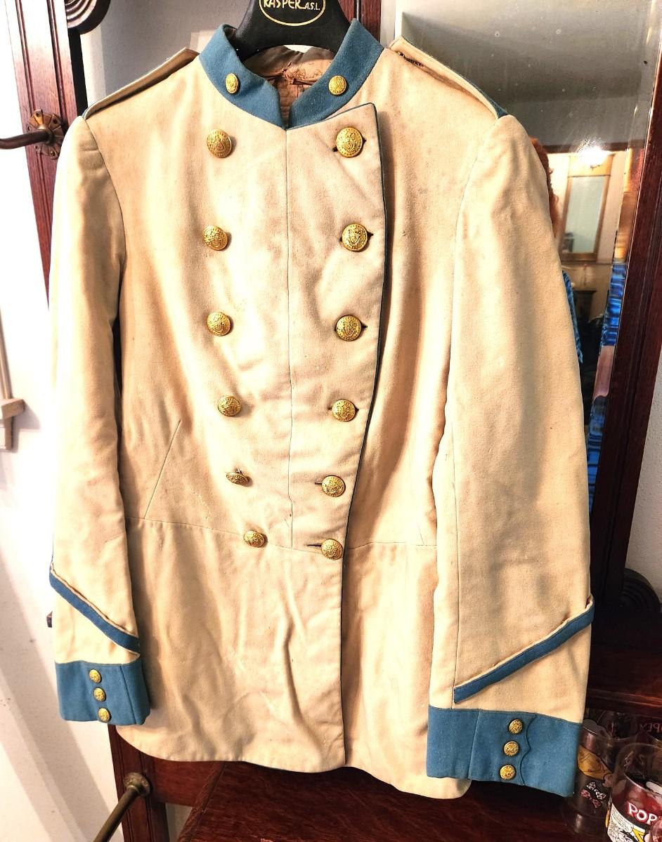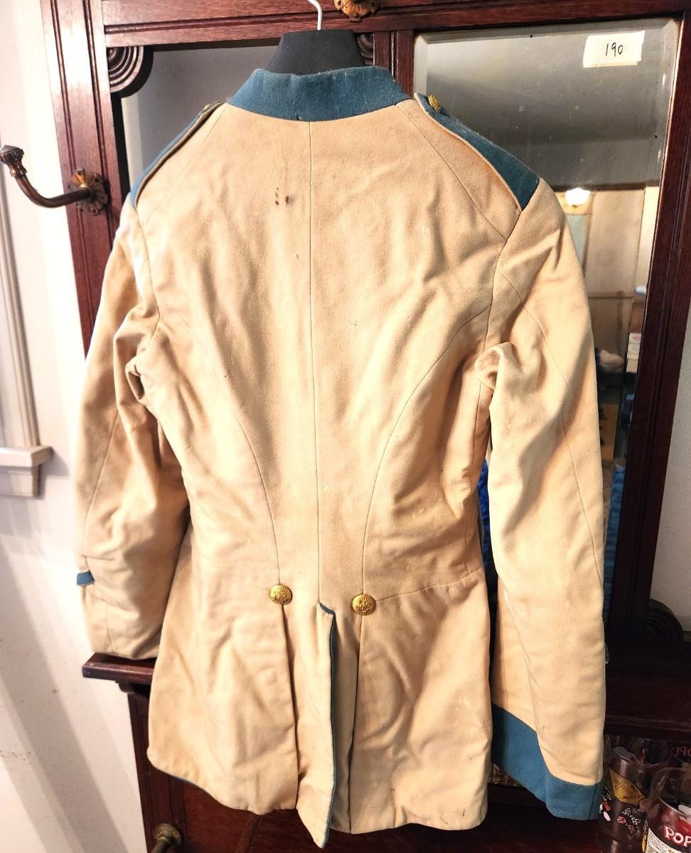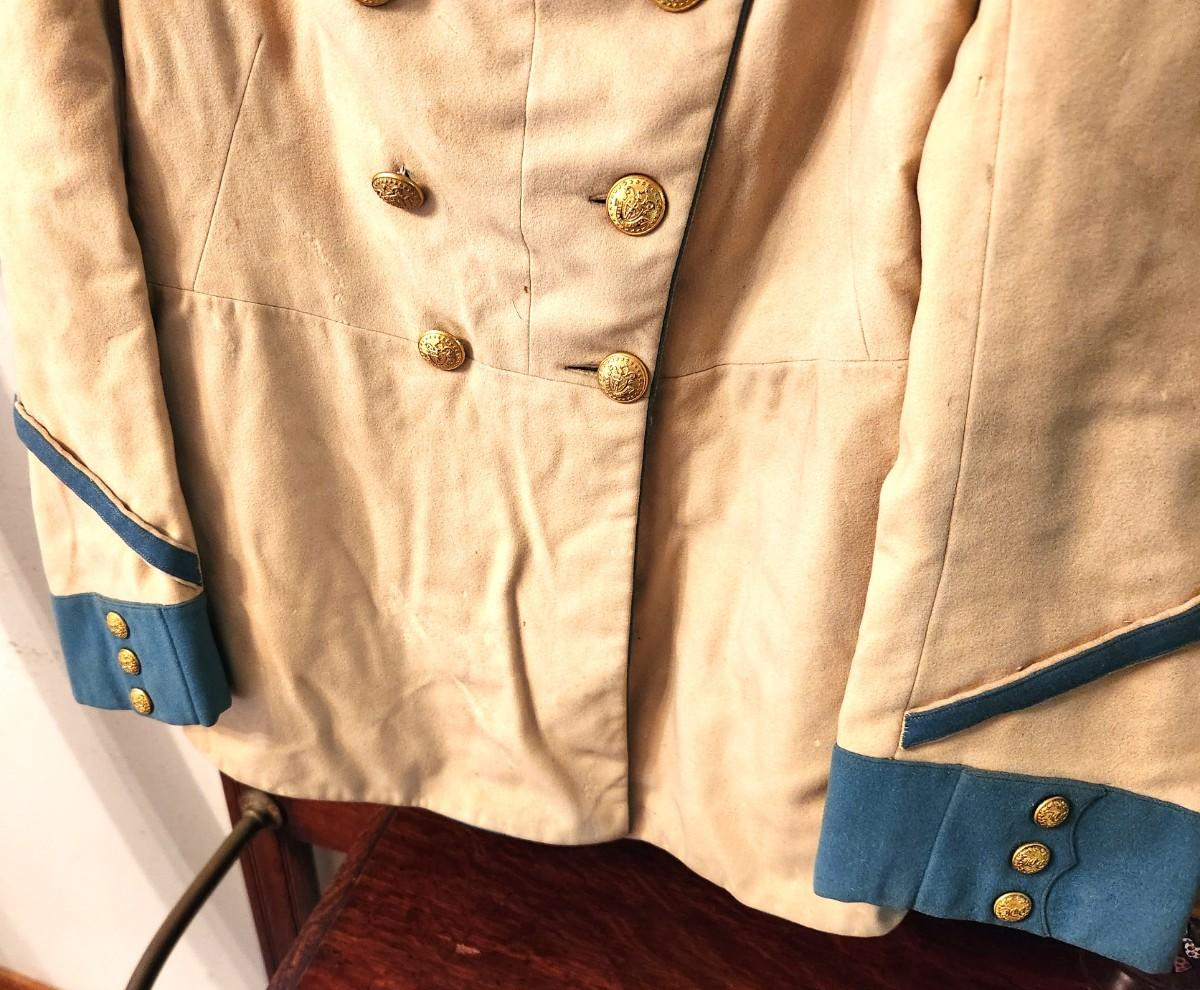 Post Civil War tailored Military Coat (not a costume) - Massachusetts 1st Cadet Corps - original buttons - named wearer (name written inside coat pocket. On the small side (men smaller back then) - pit to pit: 15", 29" long. Paperwork showing buttons, photo of coat, etc. This was stored and wrapped in a box. The 1st Cadet Corps has been round since before the Revolutionary War - their primary function was to guard the Royal Governors - now they operate in more of a ceremonial capacity.