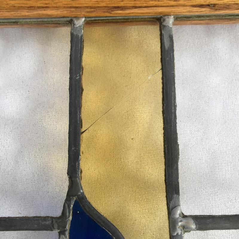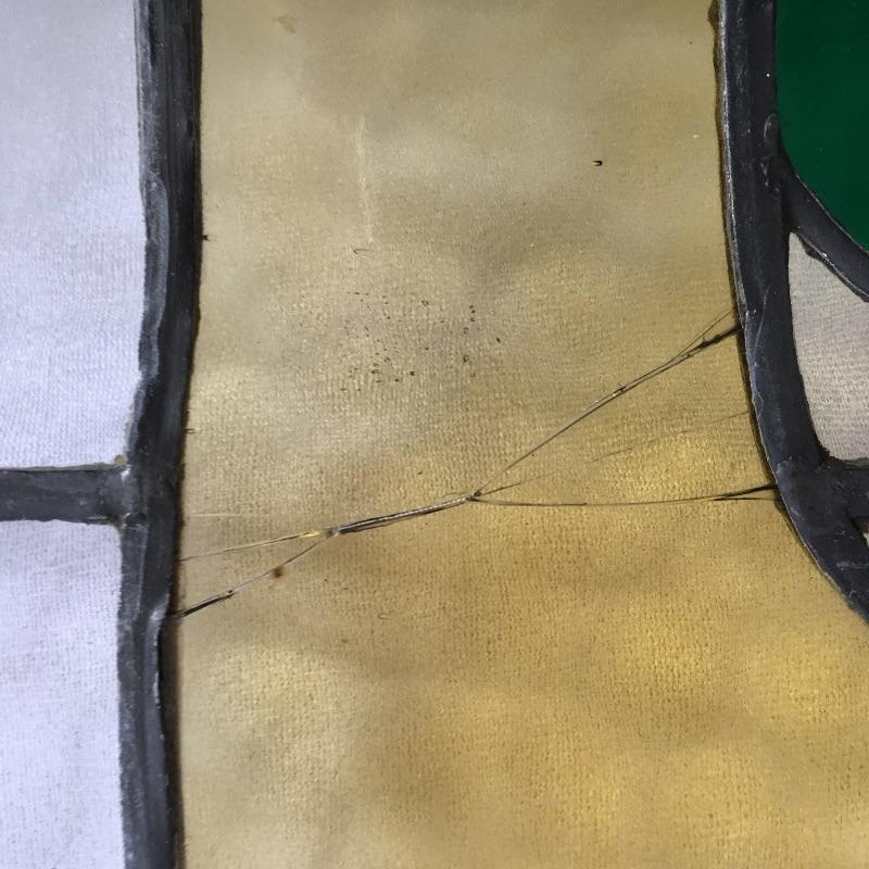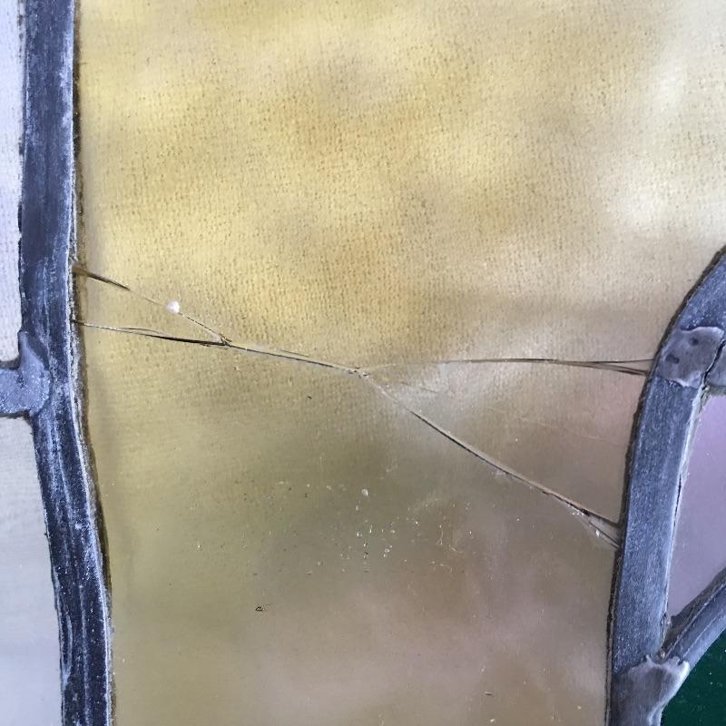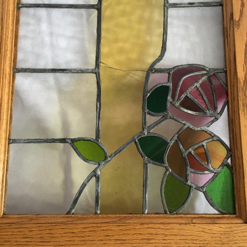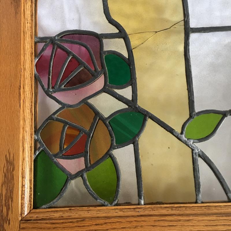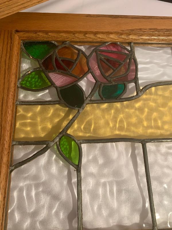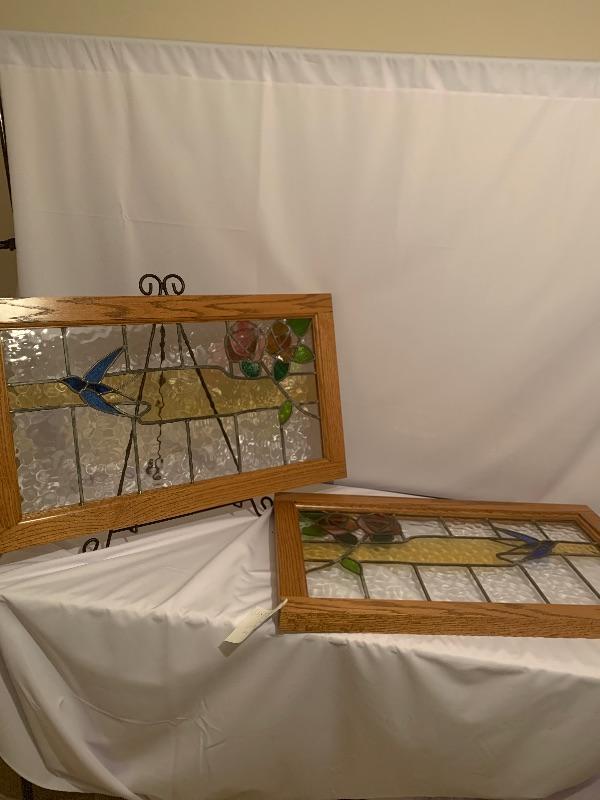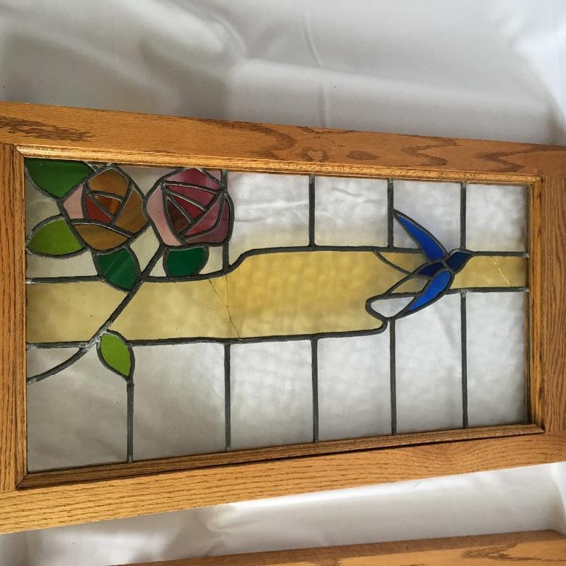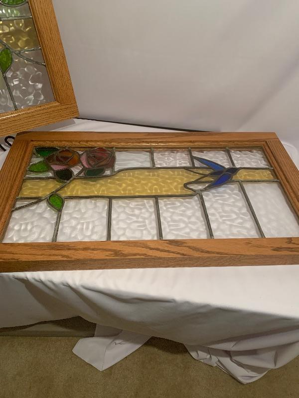 Two framed stained glass pieces depicting a bird with a Glasgow rose. One piece has a few cracks, see pictures. Frames each measure 20.75” x 35.75” x 1.75”.
