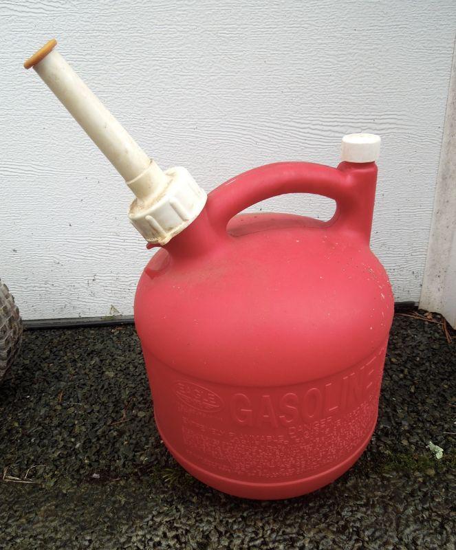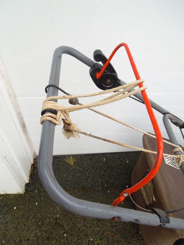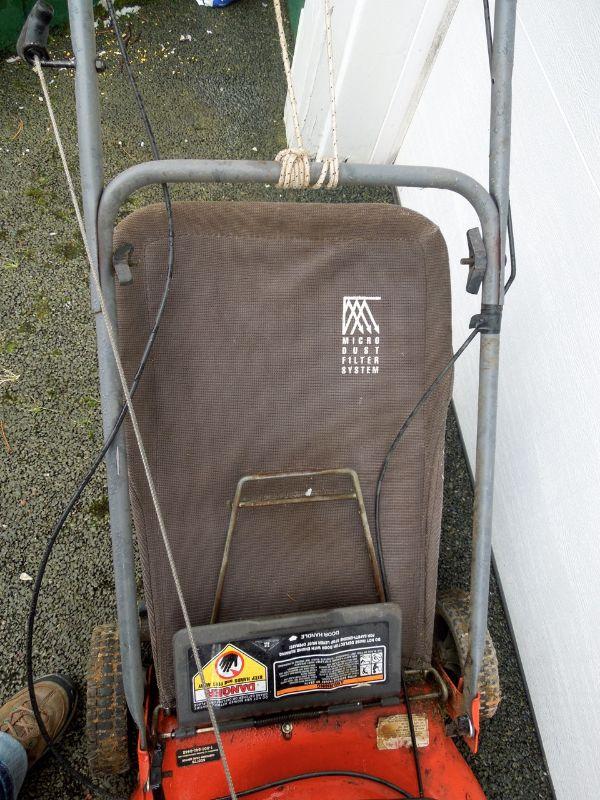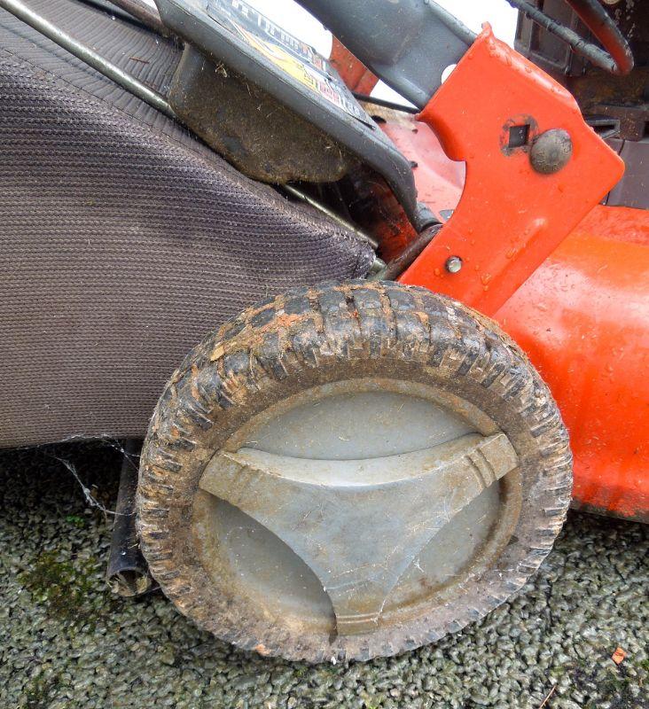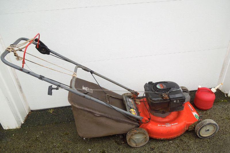 6 HP self propelling mower with bag. No gas in mower, but reported to work. comes with two extra plastic gas cans. See photos for cosmetic conditions.