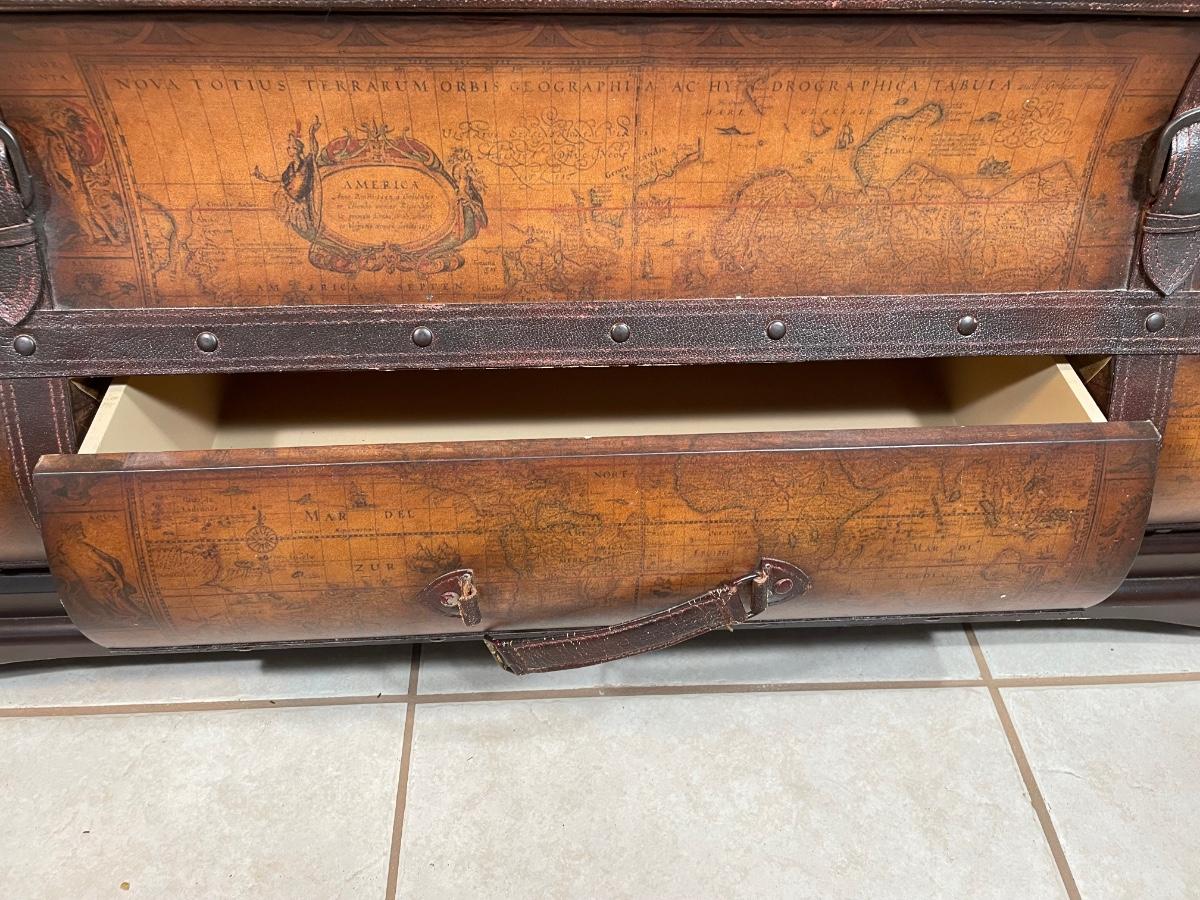 48" x 30". slight map imprint under the finish. three drawers and top slides to reveal storage space. Can deliver for a fee