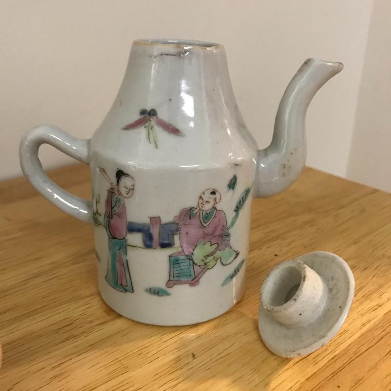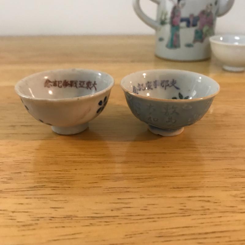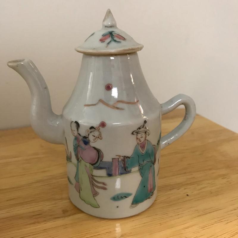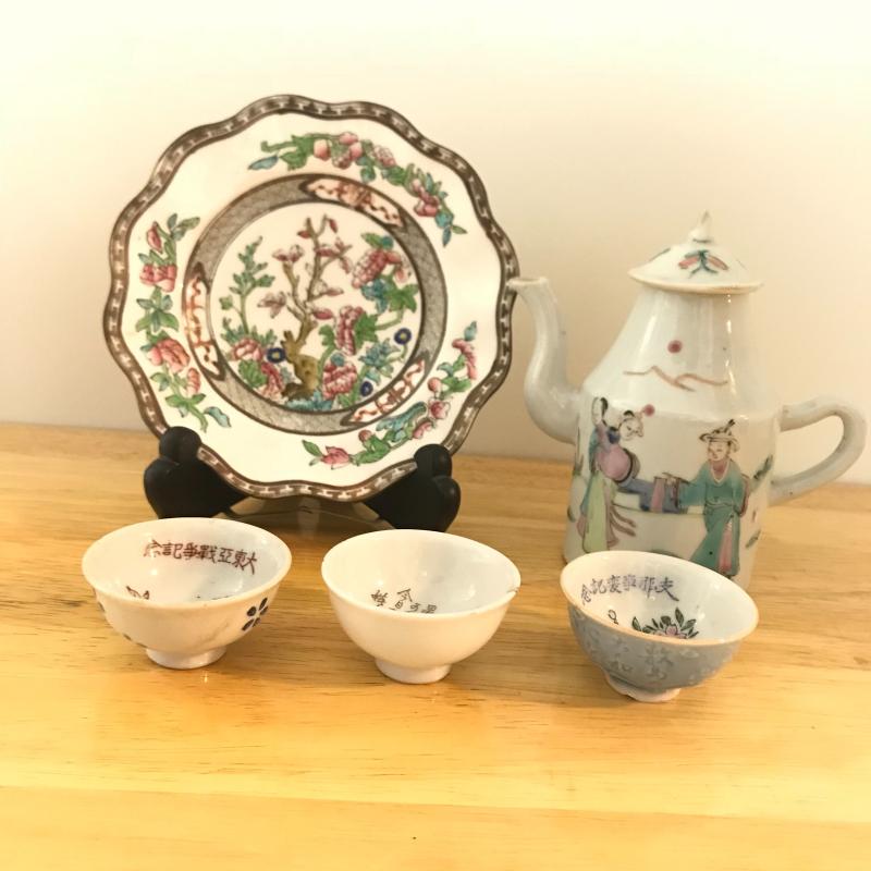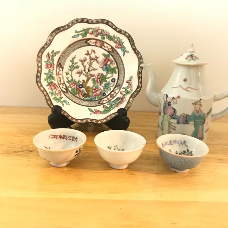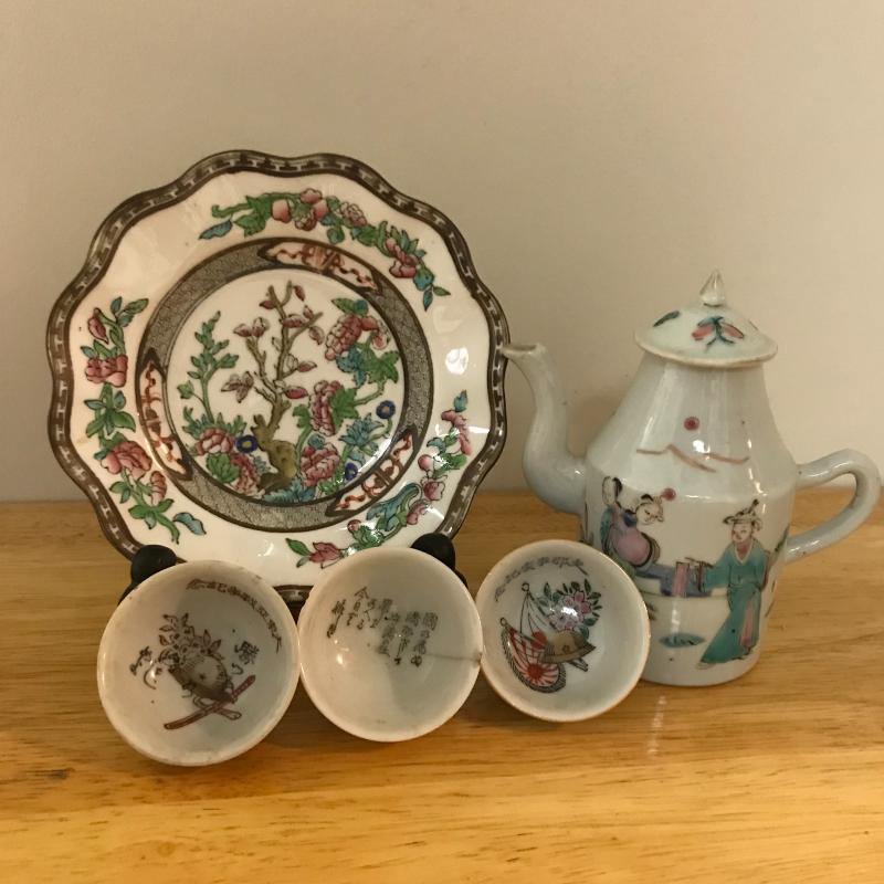 Pottery tea pot tells a story, crack noted in photo appears to have occurred in the firing process and is superficial. Teapot is accompanied by three small cups/bowls (for Sake, perhaps?) and a beautiful small tea plate. Some wear and cracks noted in photos. Shipping available or local pick up in Arden, NC.