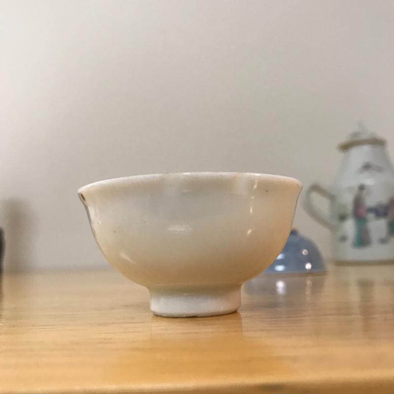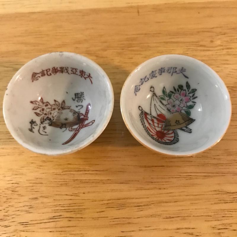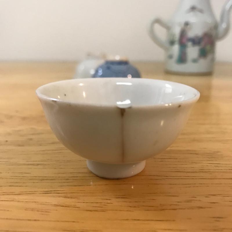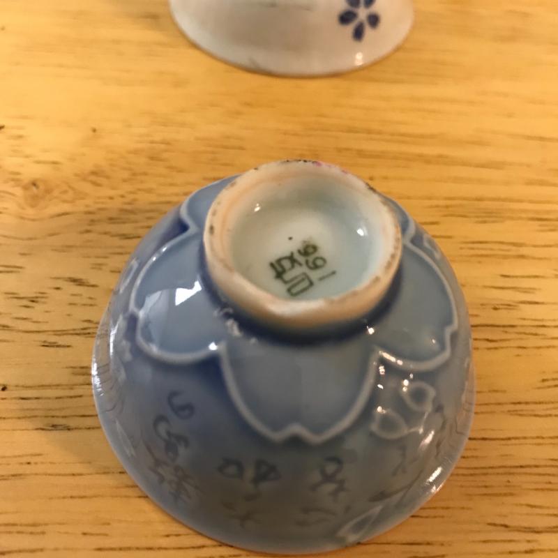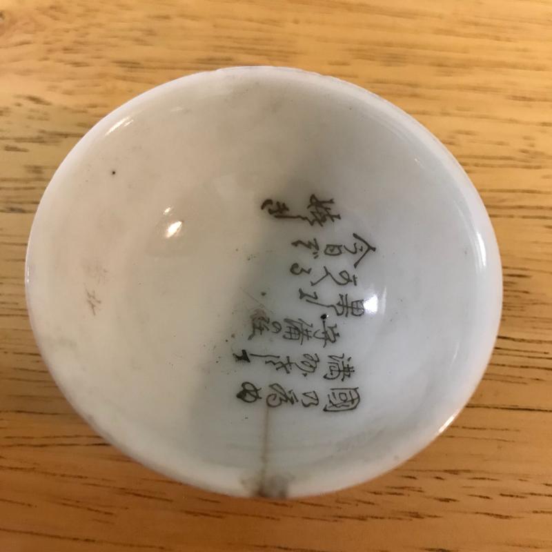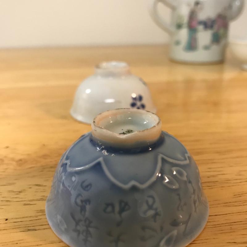 Pottery tea pot tells a story, crack noted in photo appears to have occurred in the firing process and is superficial. Teapot is accompanied by three small cups/bowls (for Sake, perhaps?) and a beautiful small tea plate. Some wear and cracks noted in photos. Shipping available or local pick up in Arden, NC.