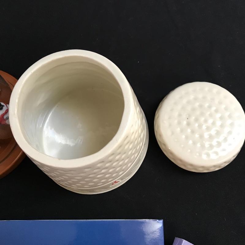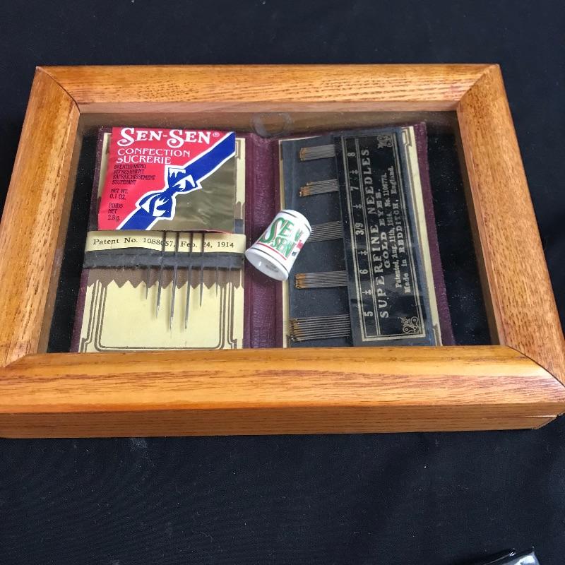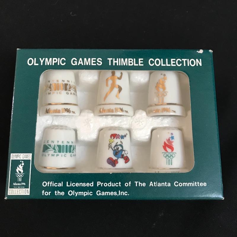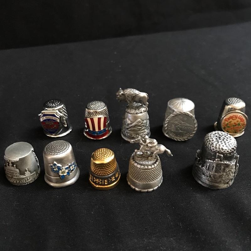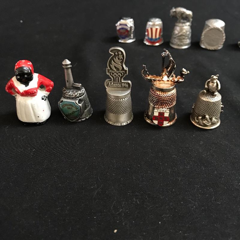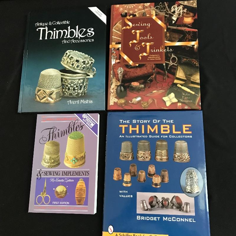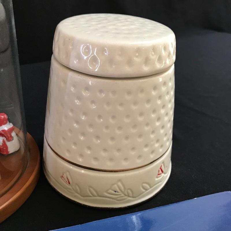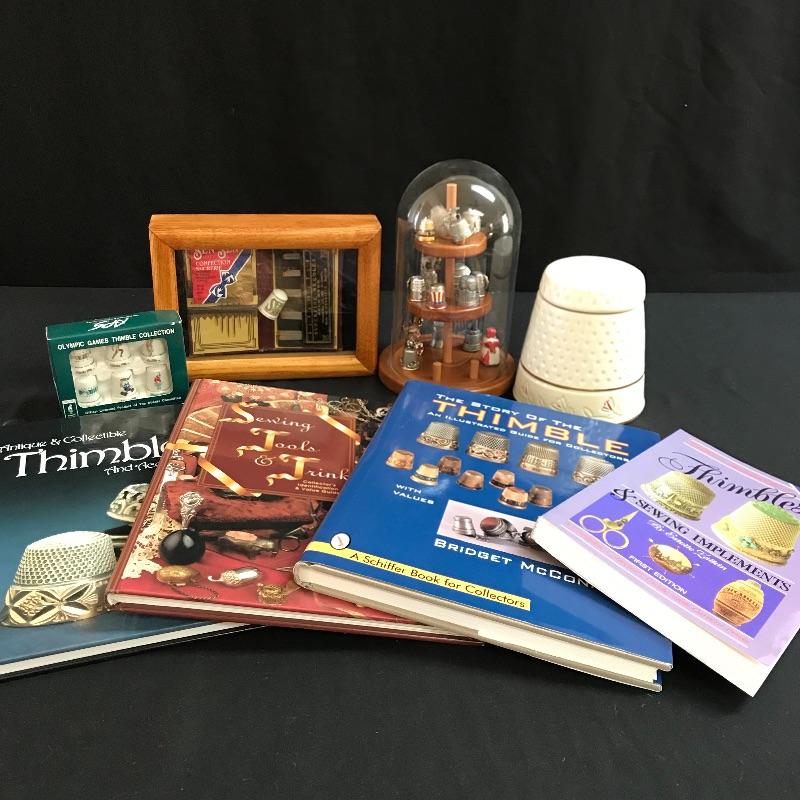 One lot of many for the sewing collector. A set of six Atlanta Olympic Games thimbles, a Sen-Sen shadow box with “Superfine Needles Gold Eyes” and more. The gem of the lot is a glass dome display with souvenir thimbles from all over the spectrum. A House of Webster ceramic thimble jar. Four books complete the collection, perfect to gift or keep for yourself. Glass dome has a 5.5” diameter and piece stands approximately 8.5” tall. No shipping.