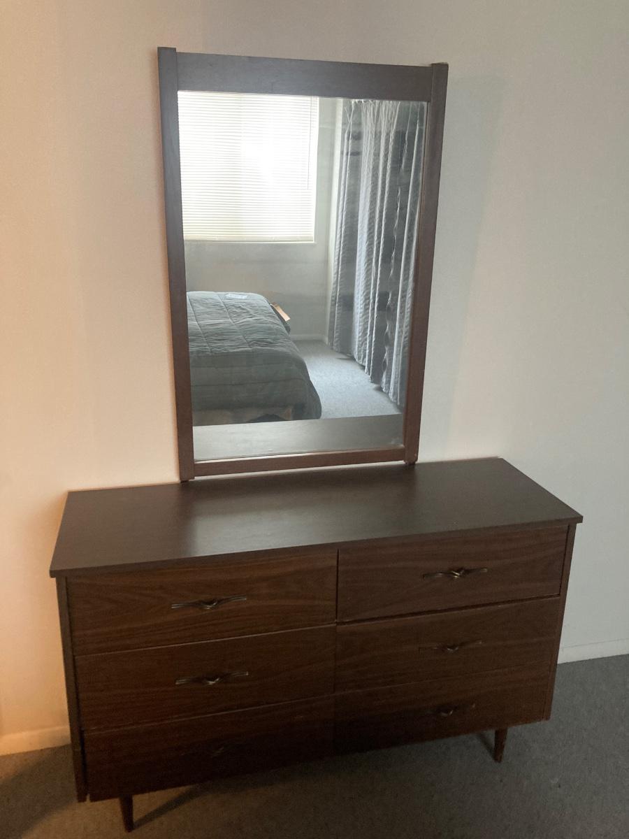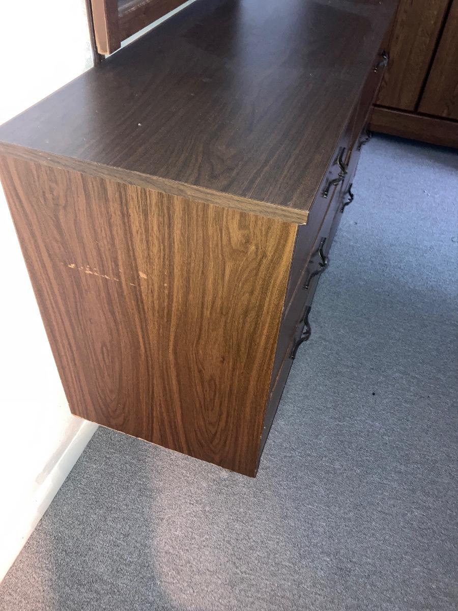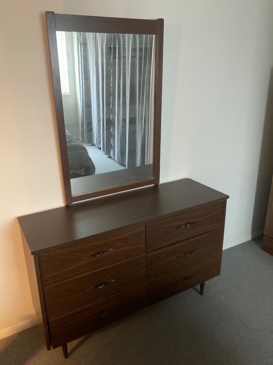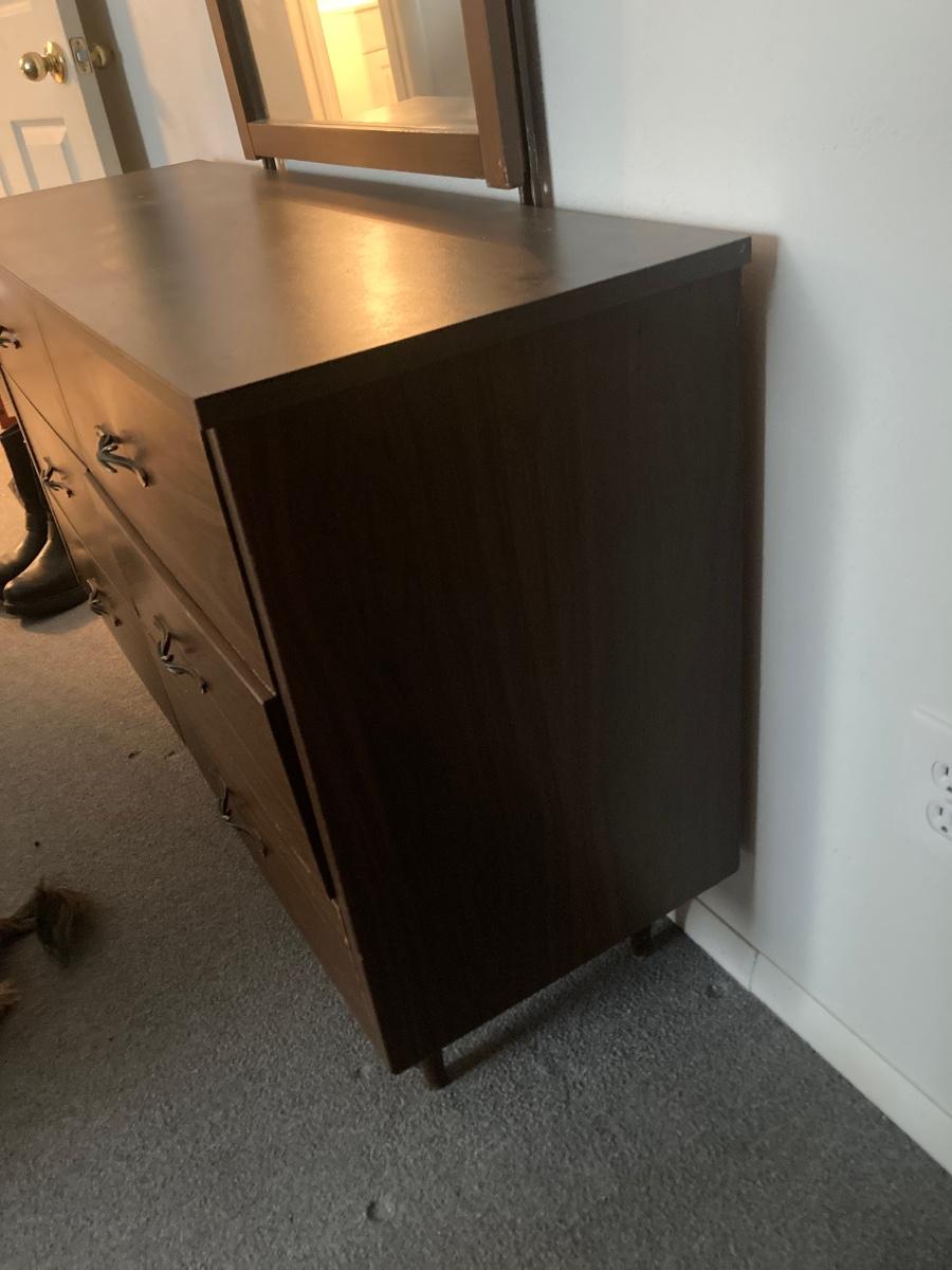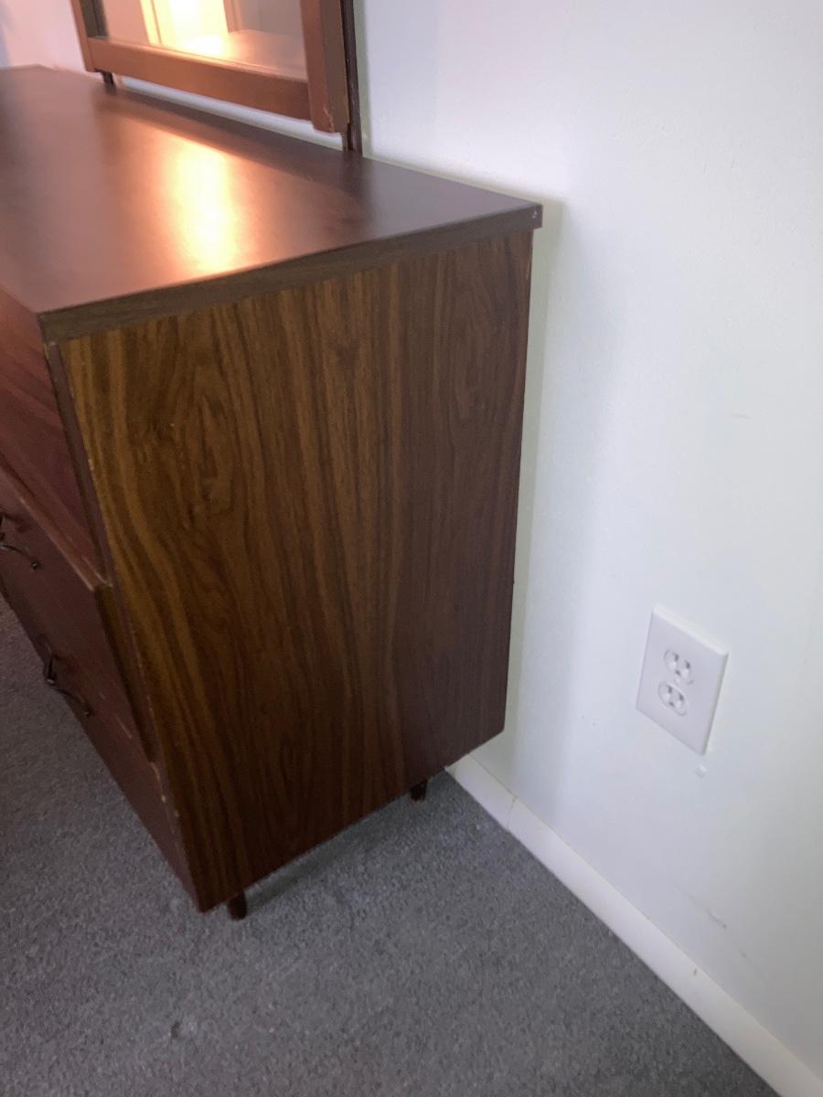 MEASURES 47-3/4 WIDE X 30-1/2” TALL x 15-3/4” DEEP. MIRROR STANDS 40-3/4” FROM THE DRESSER TOP UP.
