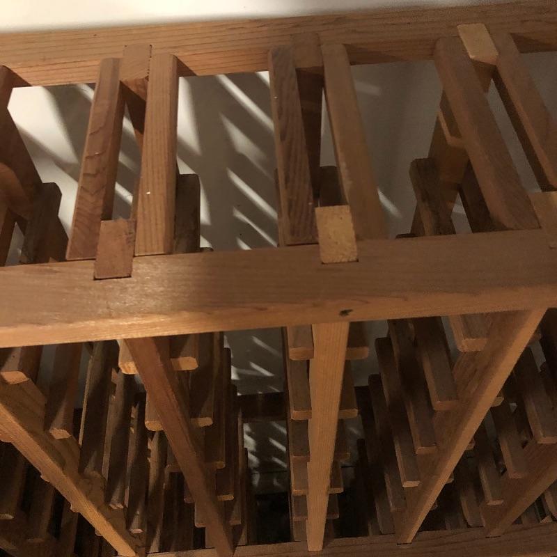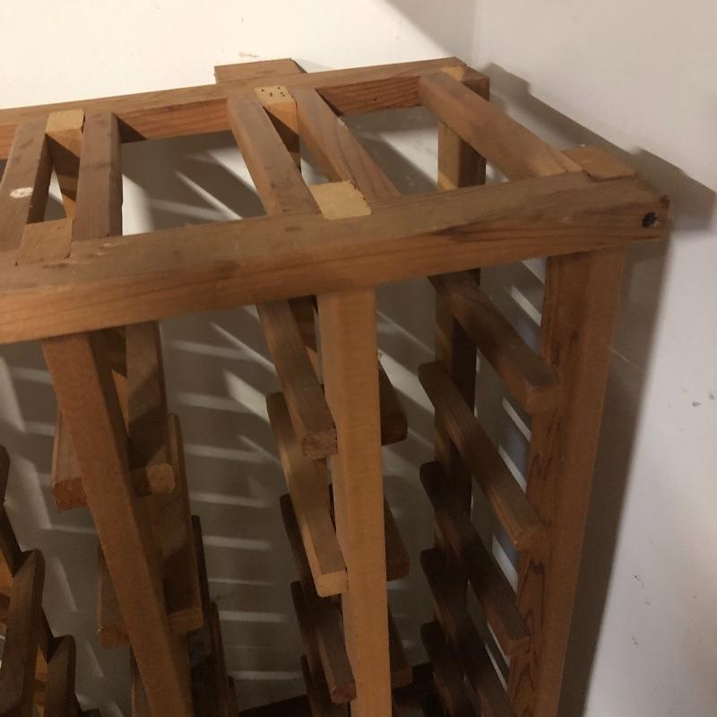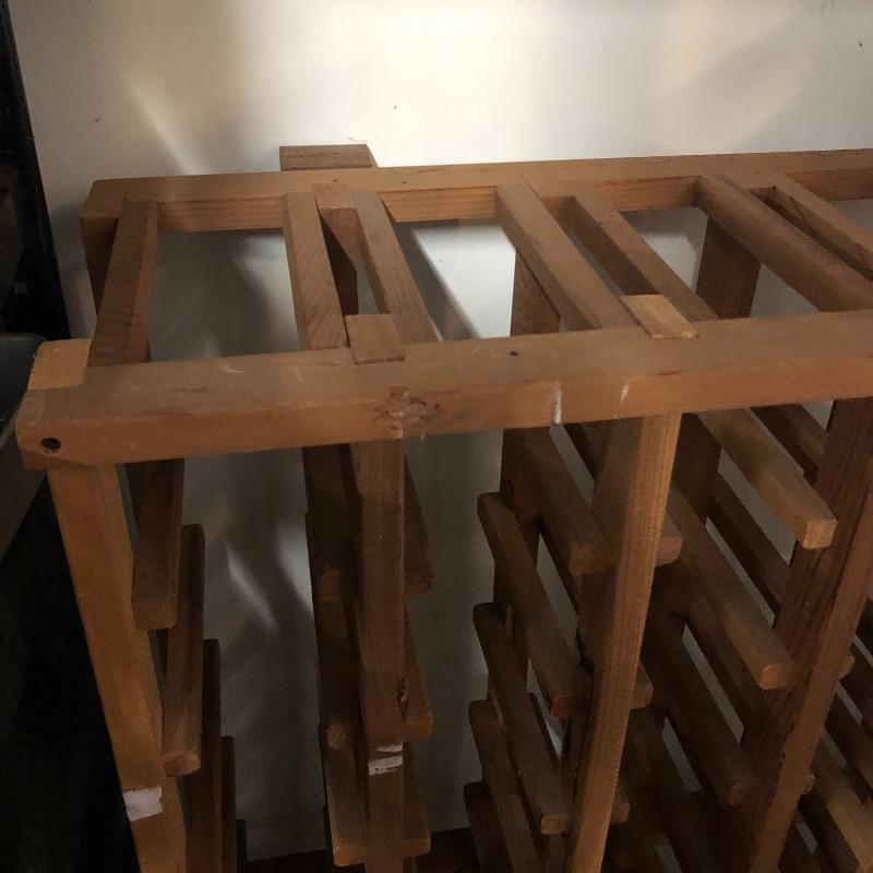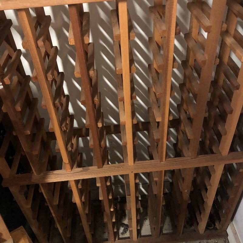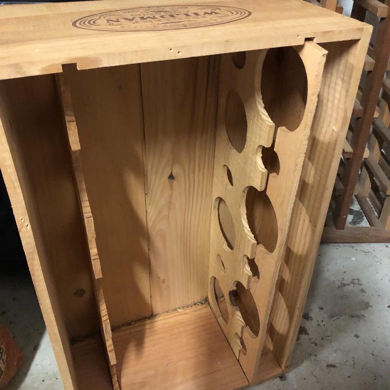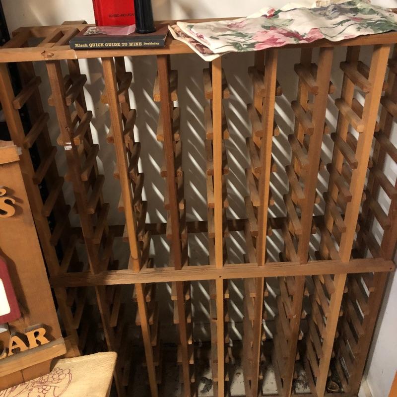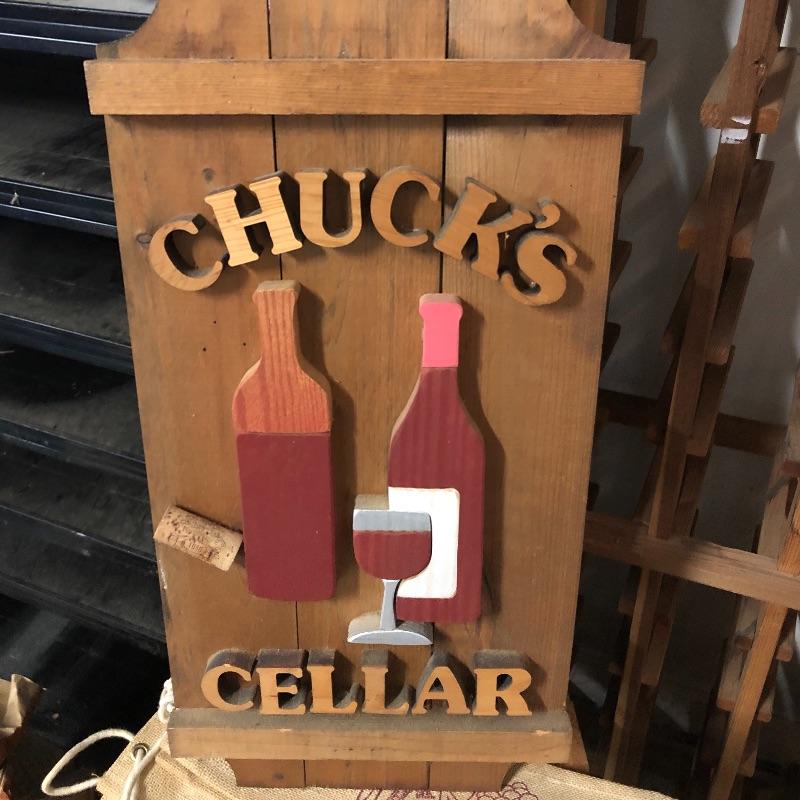 This lot includes a Wine rack, wine box, a “Chuck’s Cellar” sign, six wine gift bags, a couple of books and more. The wine rack measures approximately 34” x 45” x 9”. The wine box measures 13” x 21 1/2” by approximately 7 1/2”. Local pick up only.