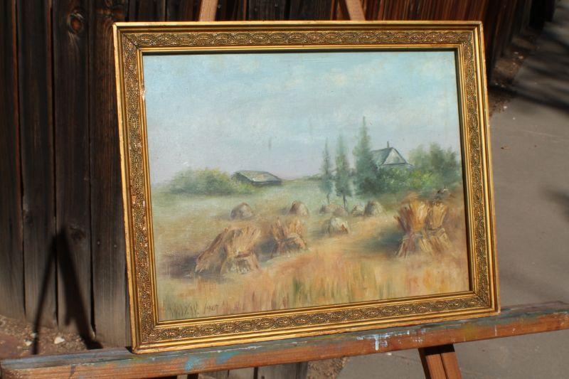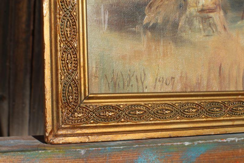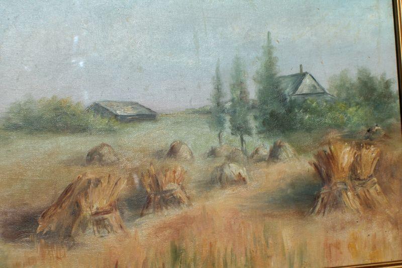 Lot 2-434: Antique 1907 Country Farm Scene Hay Harvest Oil Painting SIGNED in Original Glass Pane Frame 15" x 12"
