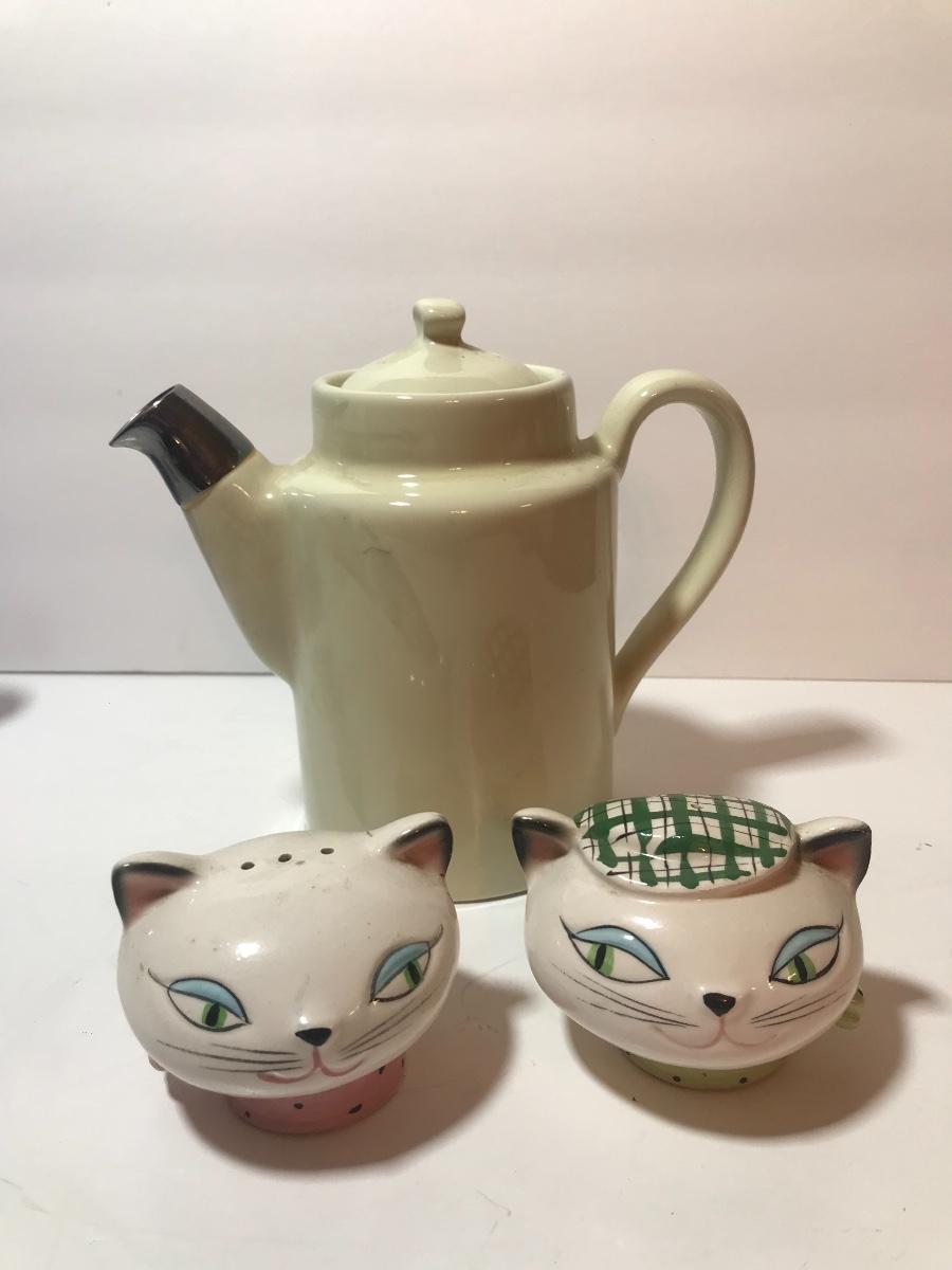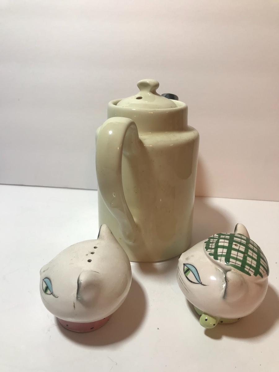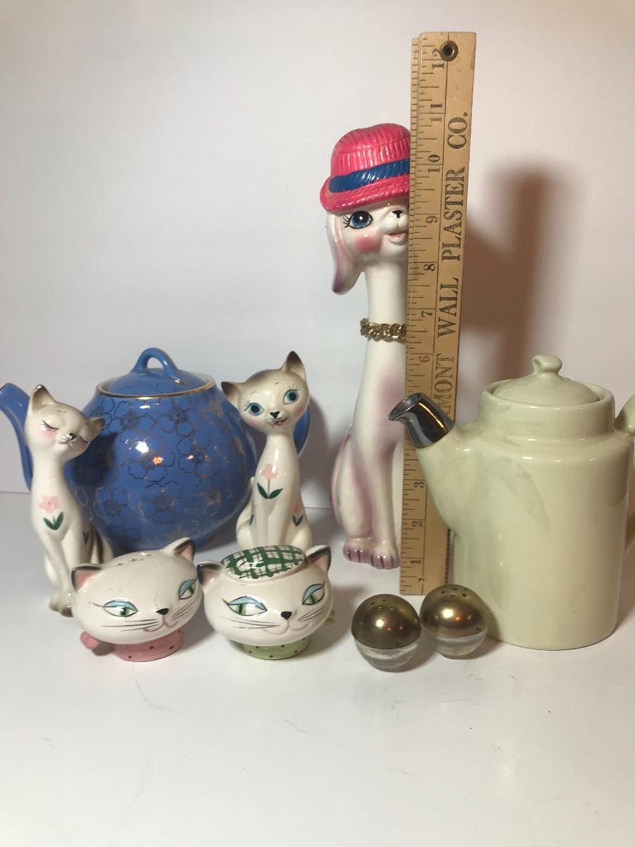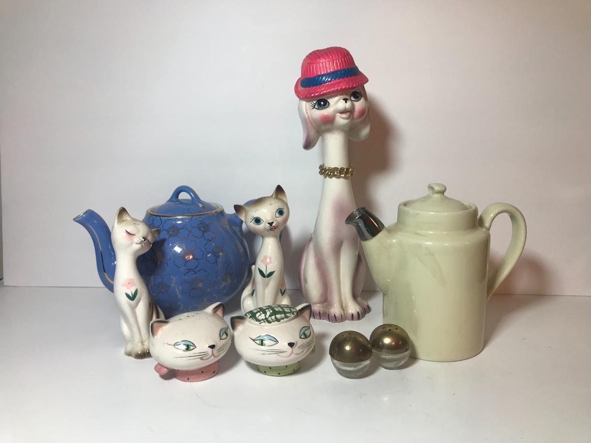 Charming kitty salt and pepper sets, glass ball salt and pepper set, dog figurine, and Hall tea pots with gold trim.