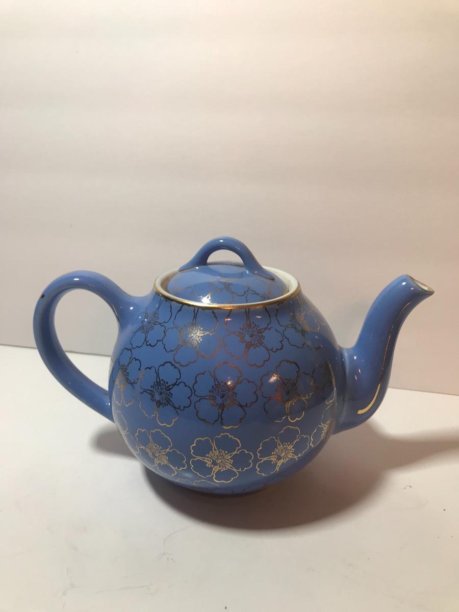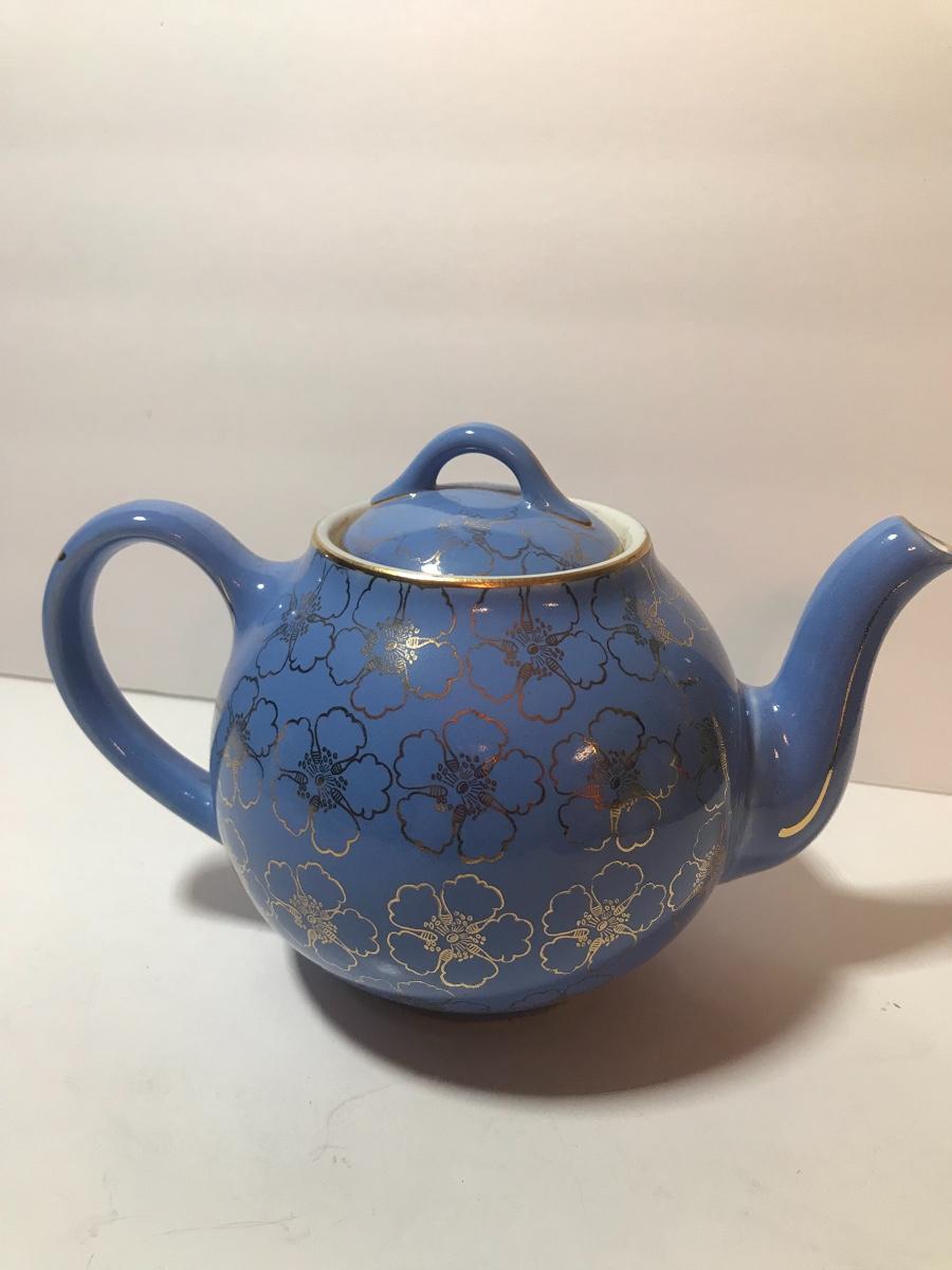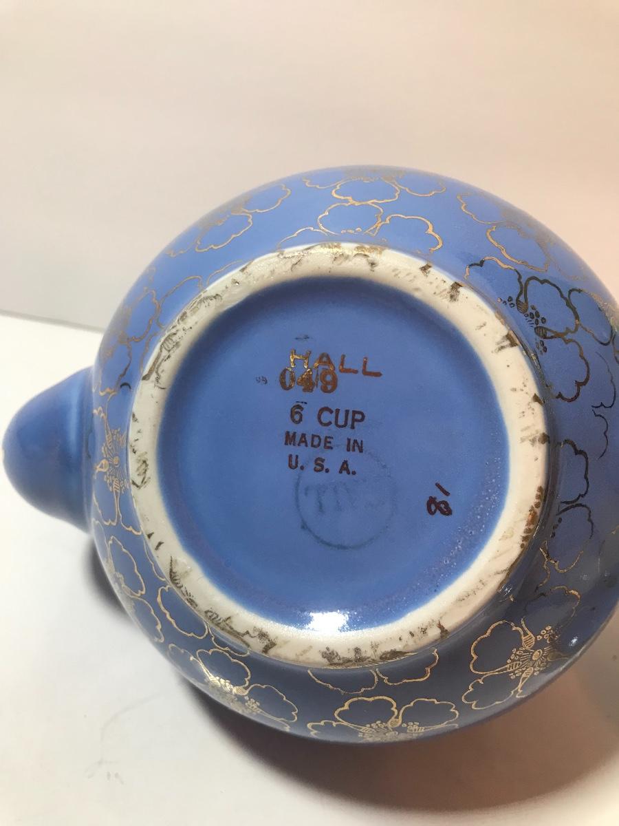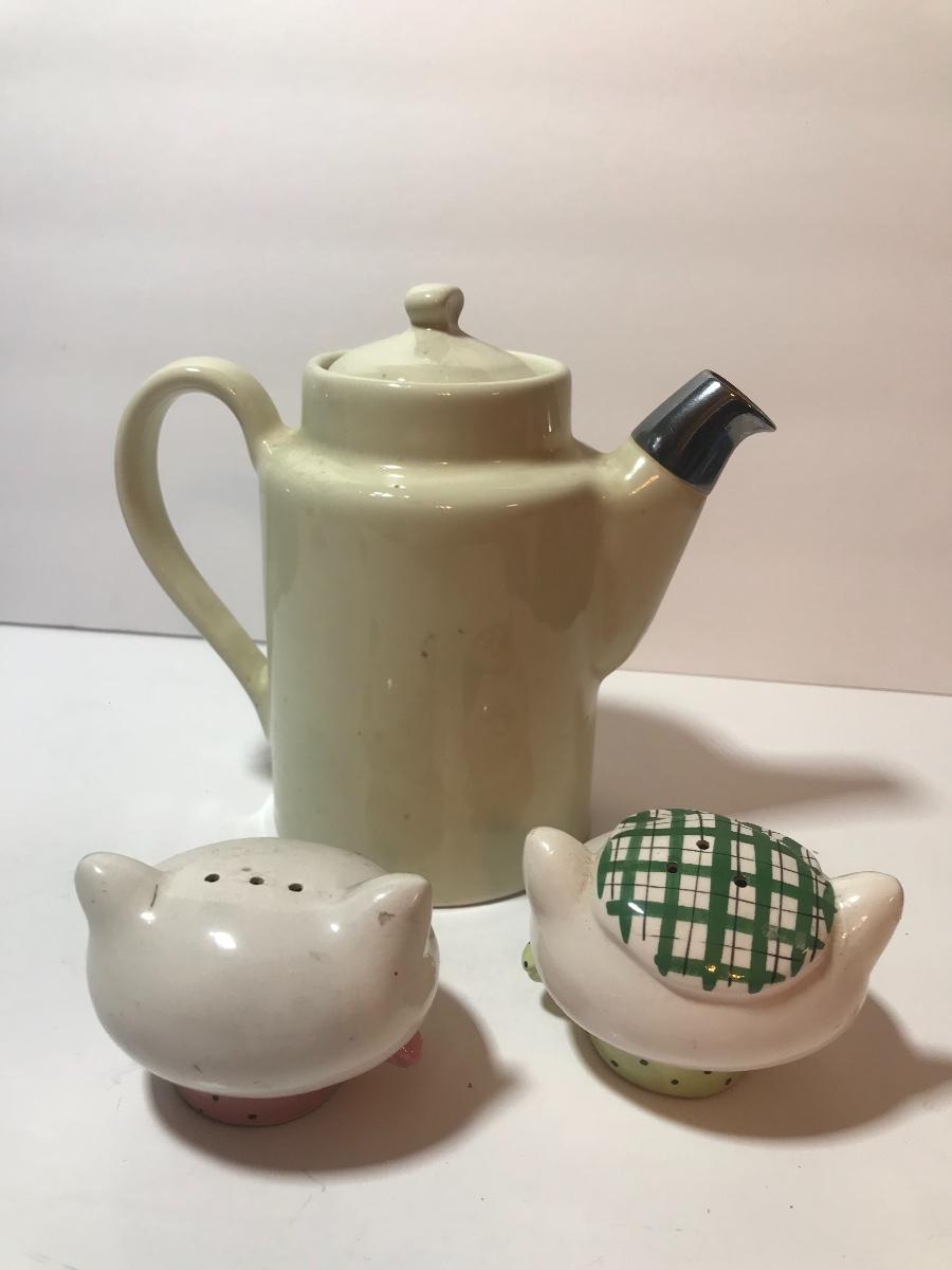 Charming kitty salt and pepper sets, glass ball salt and pepper set, dog figurine, and Hall tea pots with gold trim.