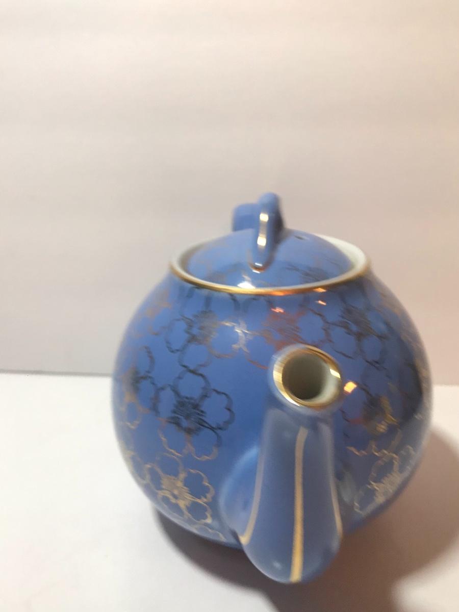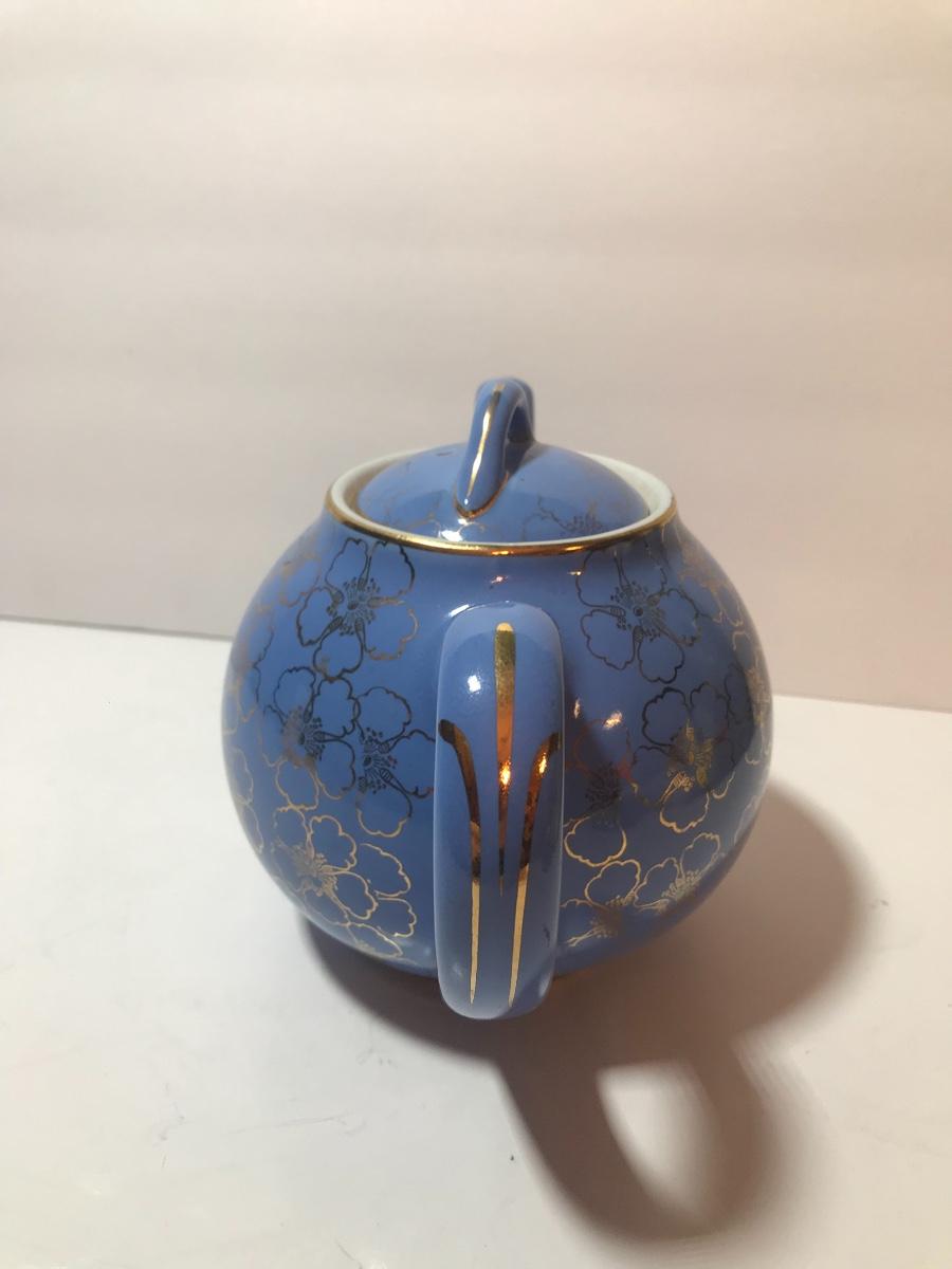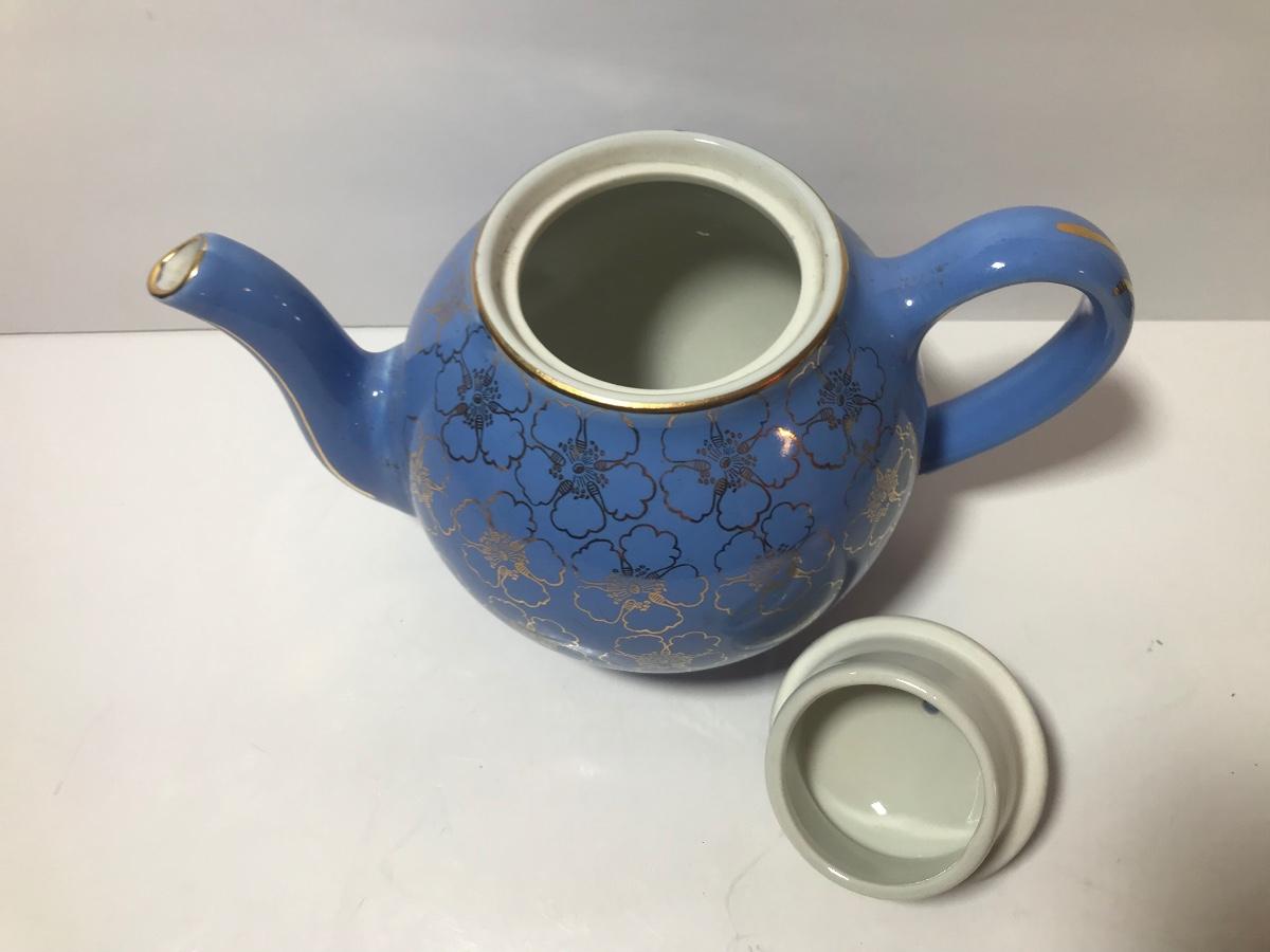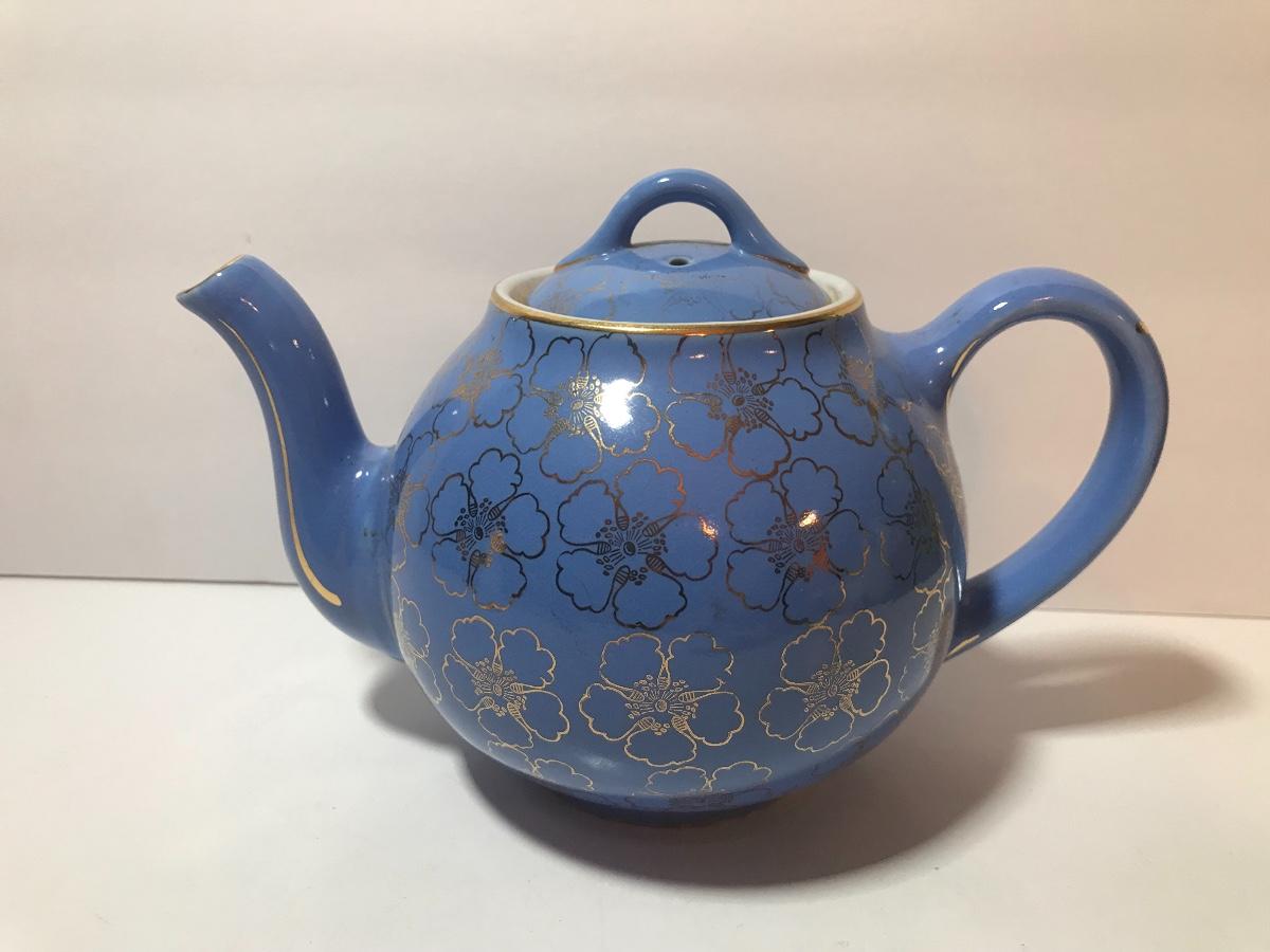 Charming kitty salt and pepper sets, glass ball salt and pepper set, dog figurine, and Hall tea pots with gold trim.
