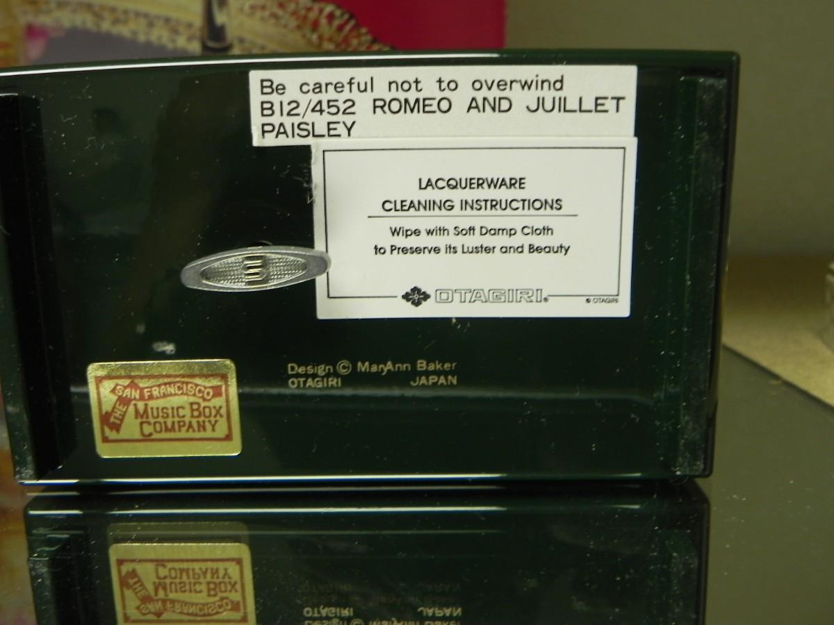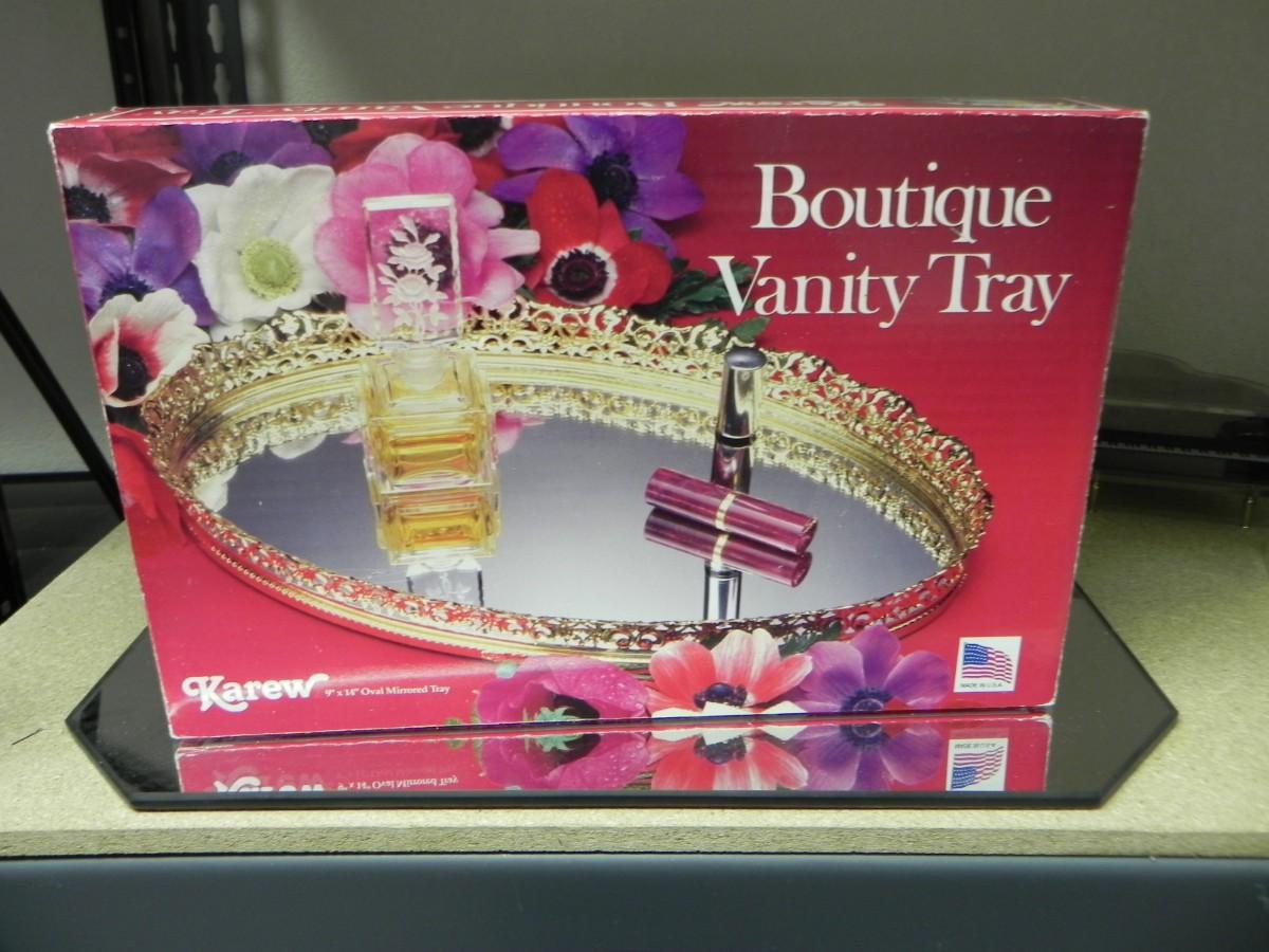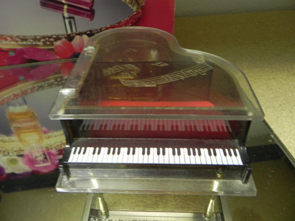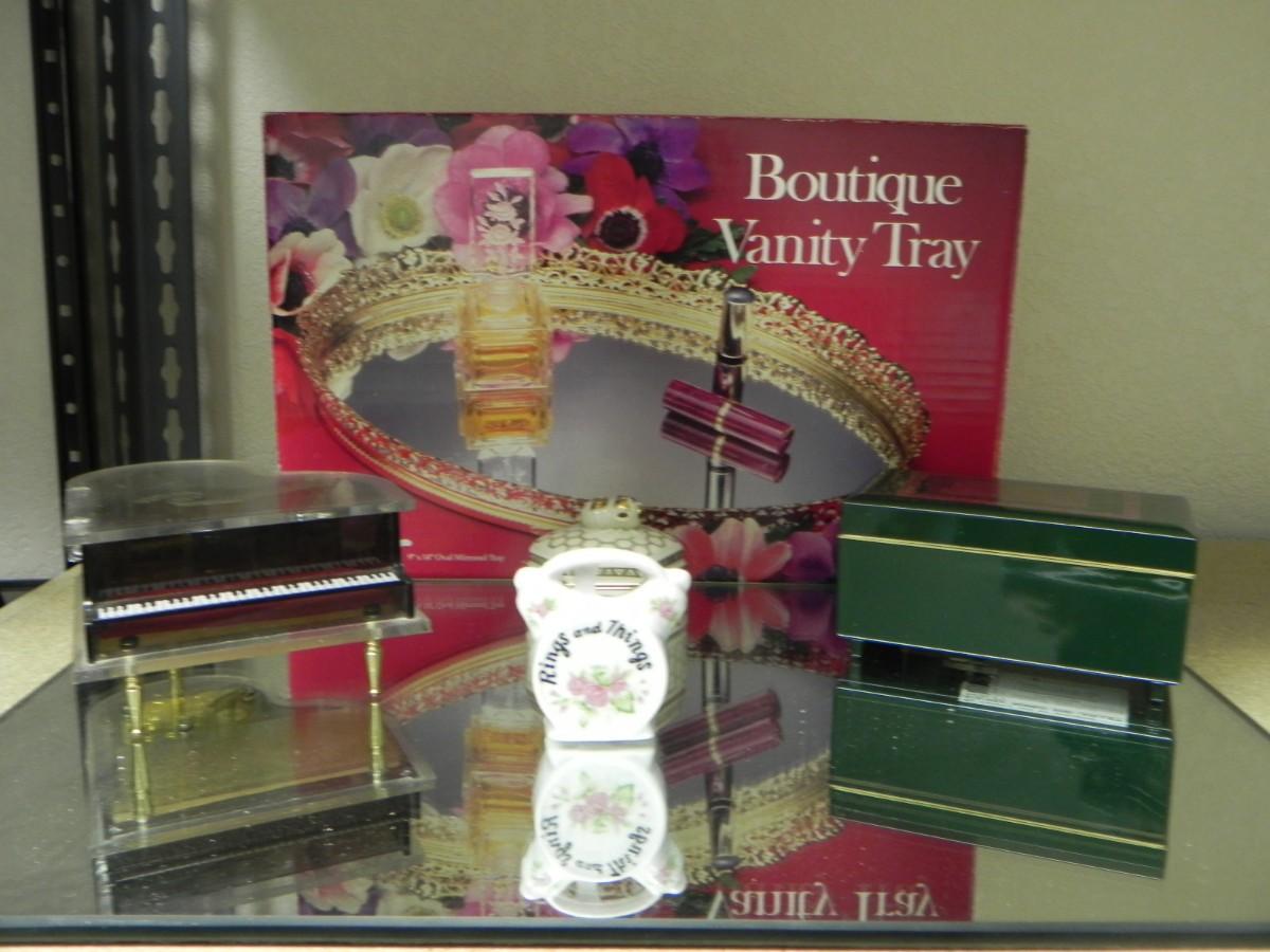 BOUTIQUE VANITY TRAY IN BOX, PIANO MUSIC BOX, AND MUSIC NOX COMPANY BOX, TRINKETS