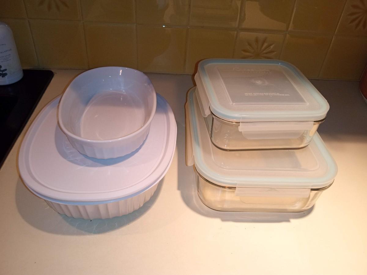 4 BAKING DISHES, MISSING A LID ON 1 OF THEM