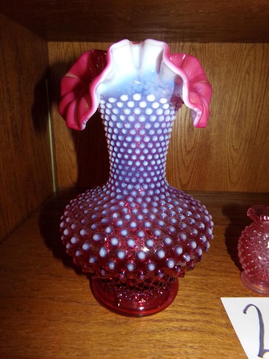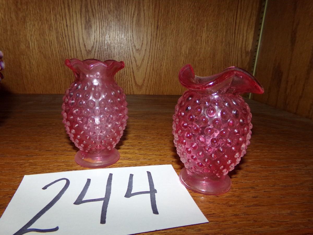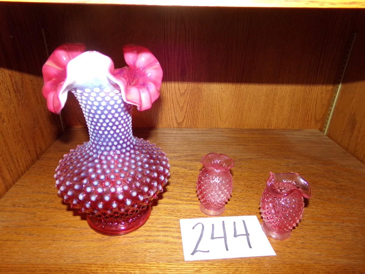 FENTON RUBY RED RUFFLED VASE. ALSO 2 FENTON PINK RUFFLED GLASS VASES.