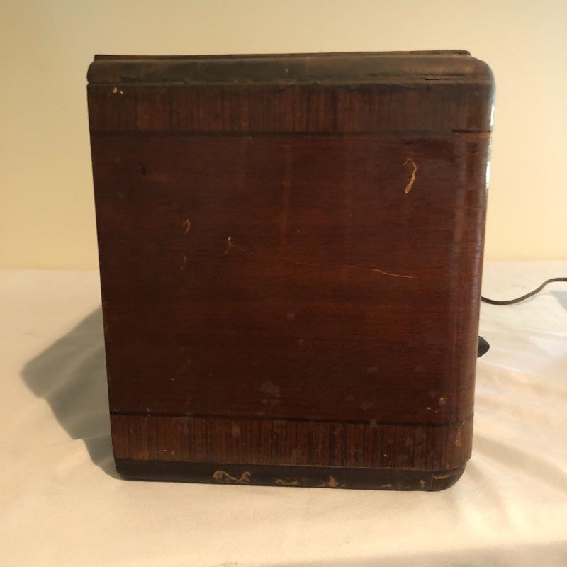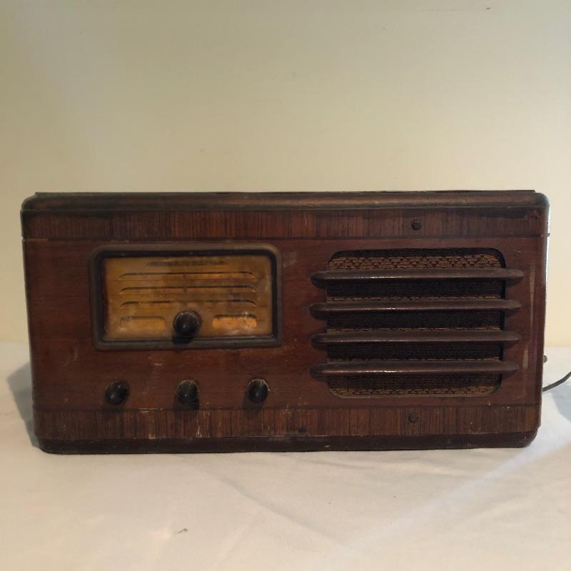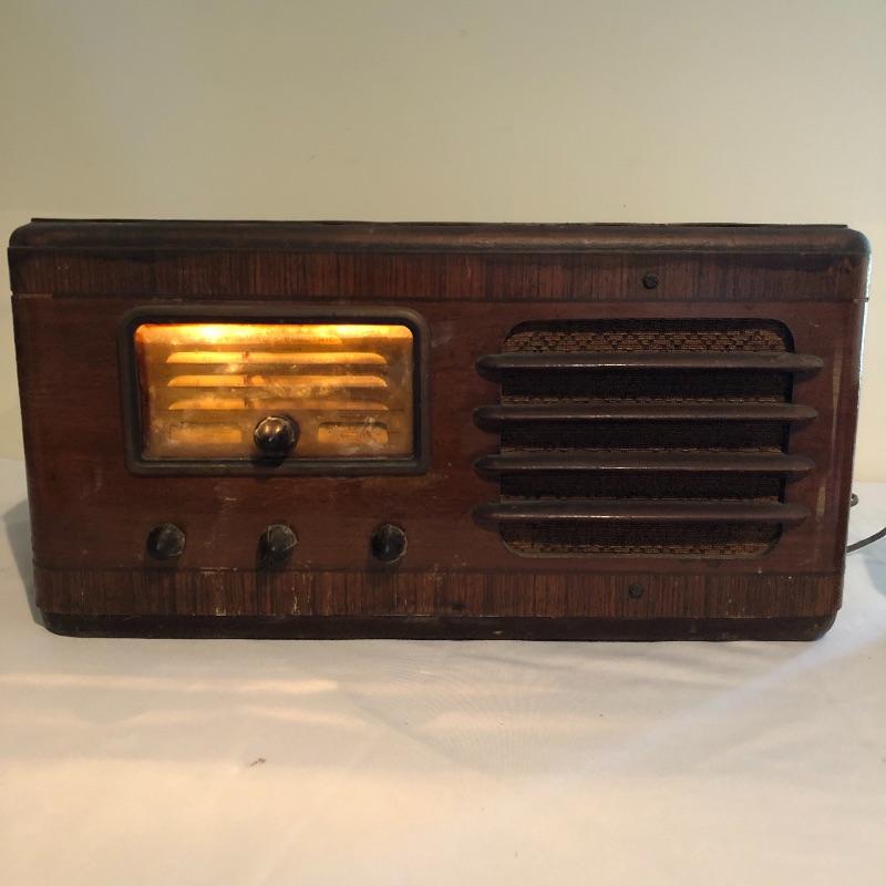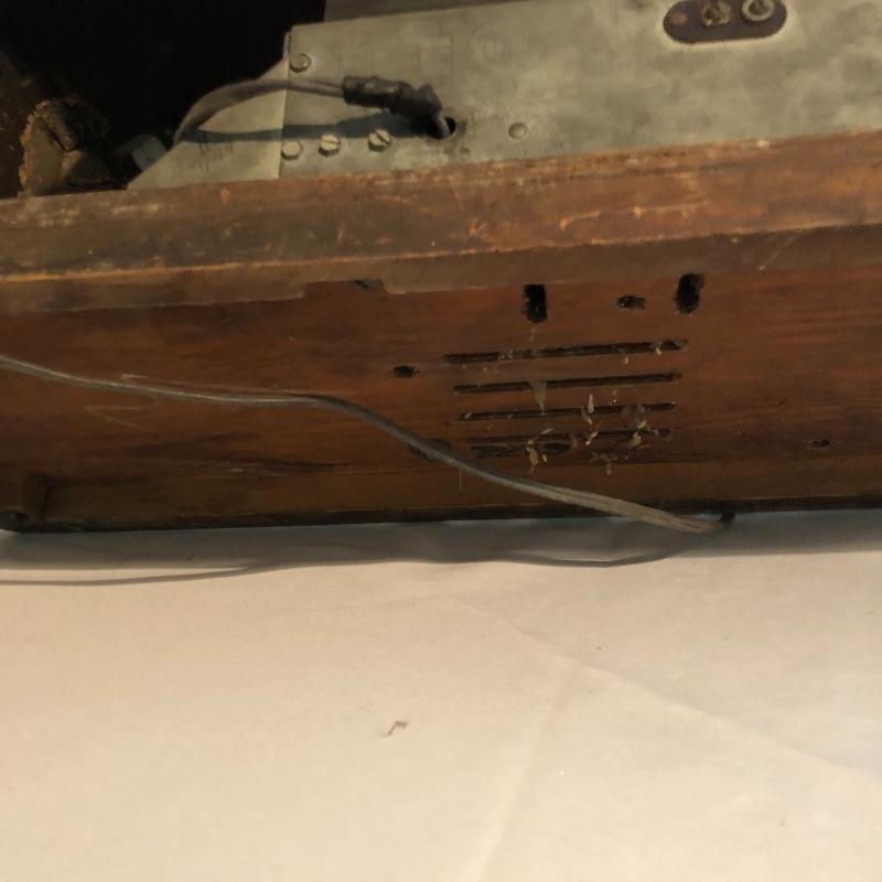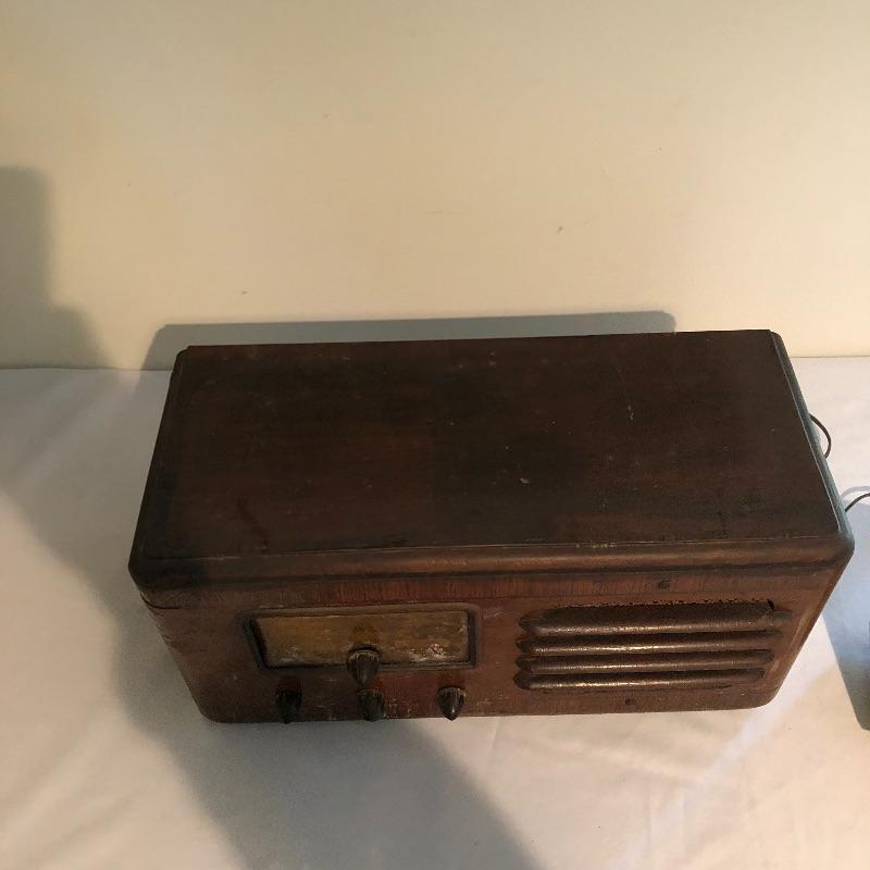The F-70 has a wooden box and has tubes. The AM radio is plastic and has no model #. Both items powered on when tested. F-70 measures 9” x 21” x 10.5”.