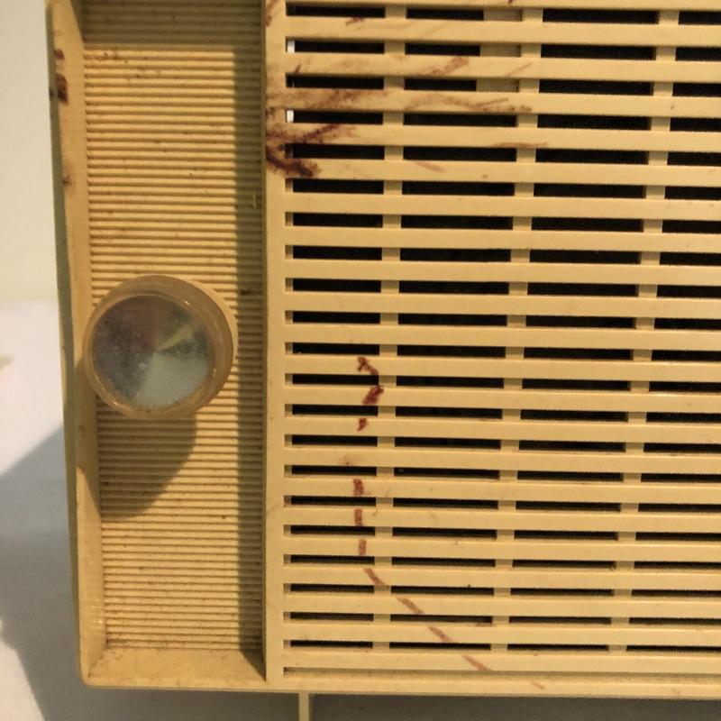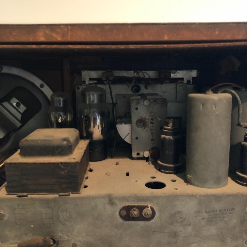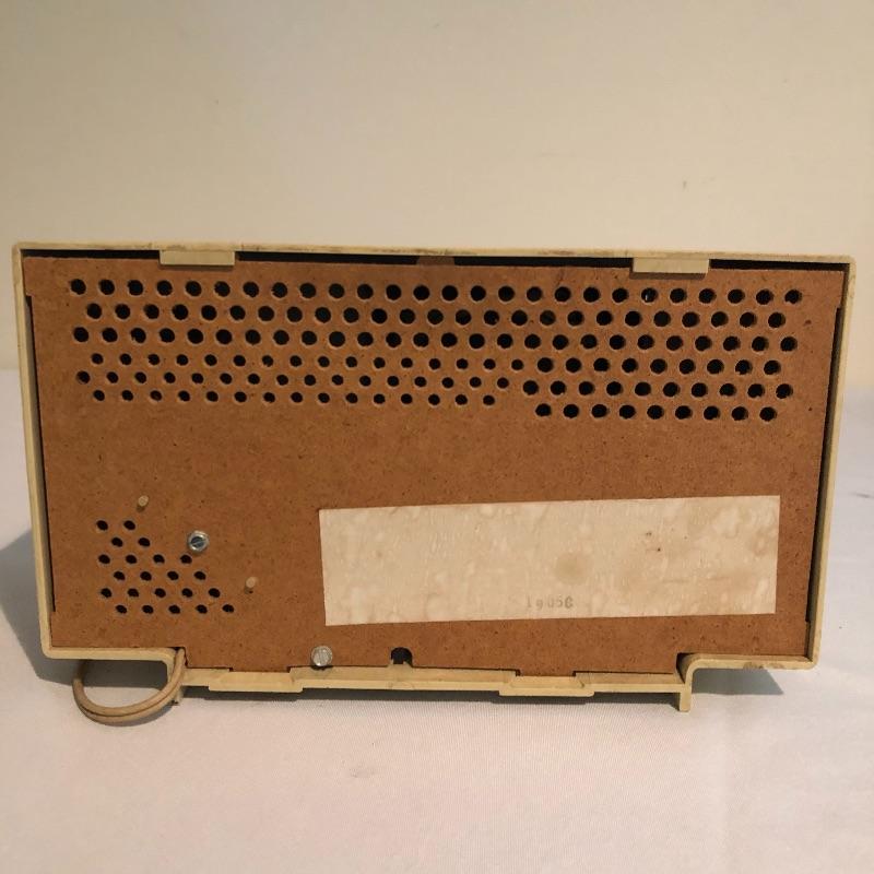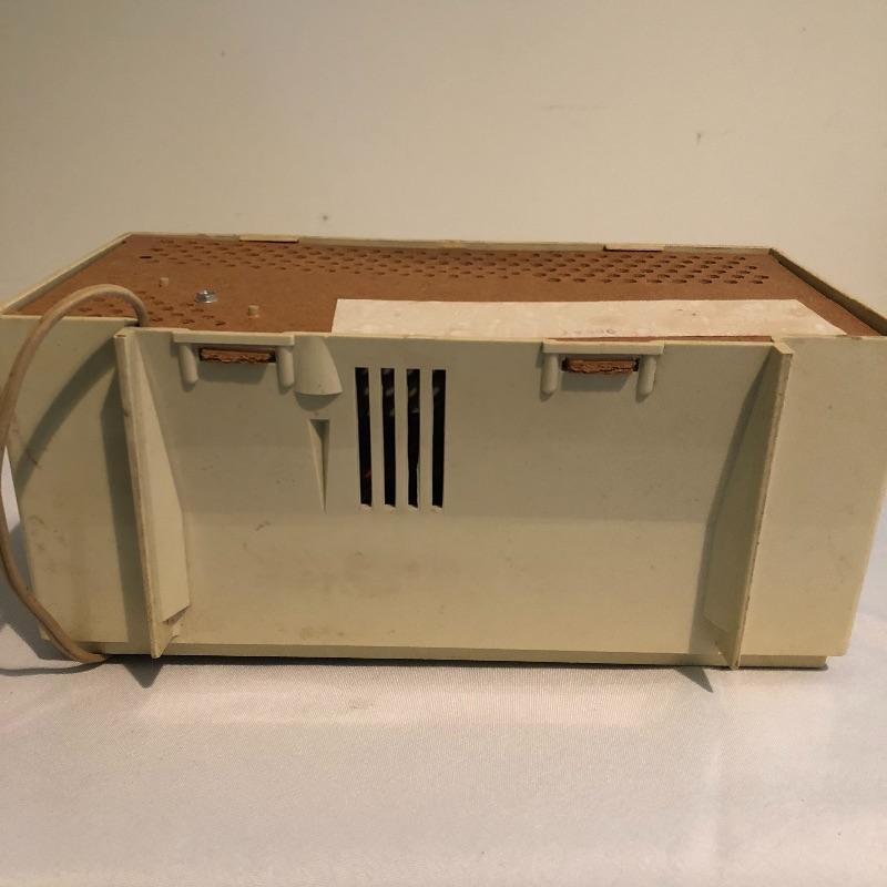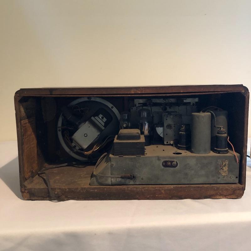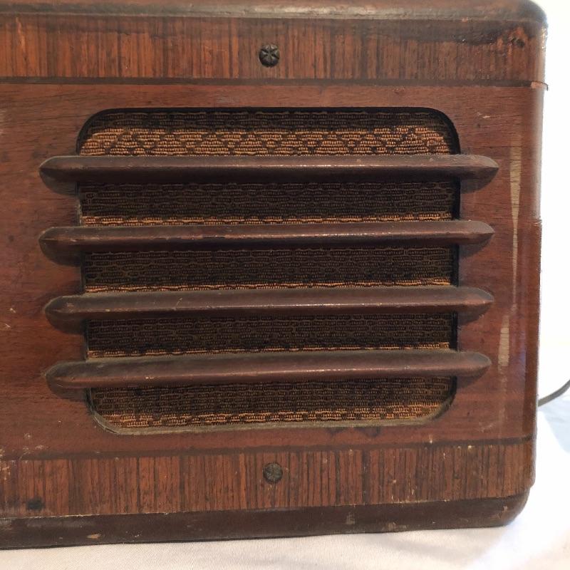 The F-70 has a wooden box and has tubes. The AM radio is plastic and has no model #. Both items powered on when tested. F-70 measures 9” x 21” x 10.5”.