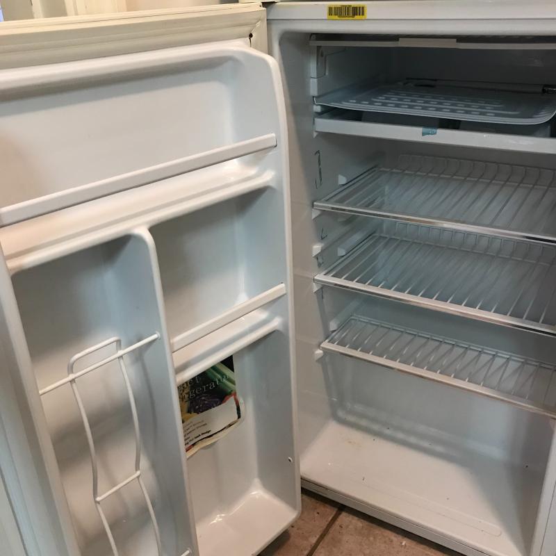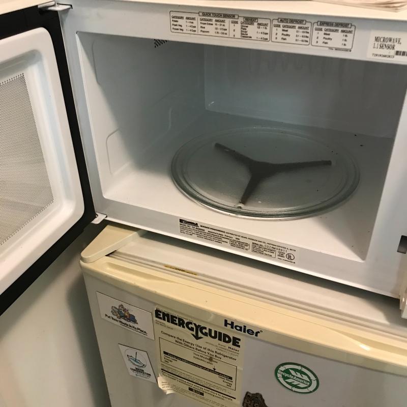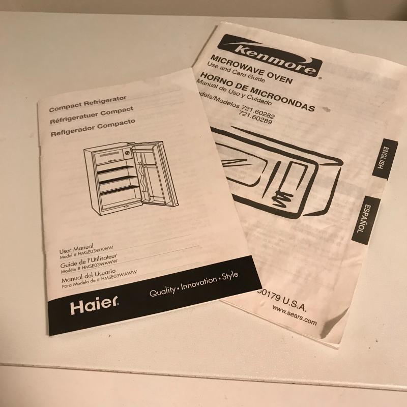 Lot includes Kenmore microwave (approx. 21” x 16” x 12”) and Haier mini-fridge (approx. 20” x 18” x 33”). Both are in good condition and seem to be in working order. Local pickup only.