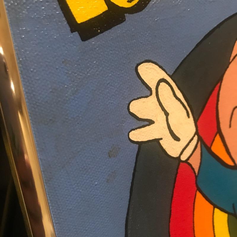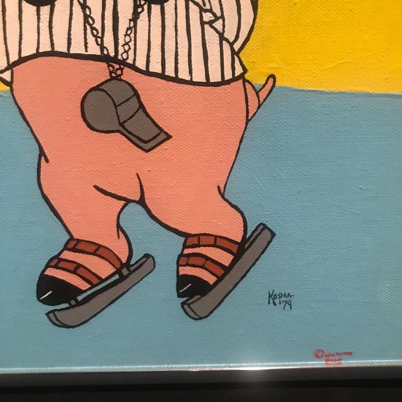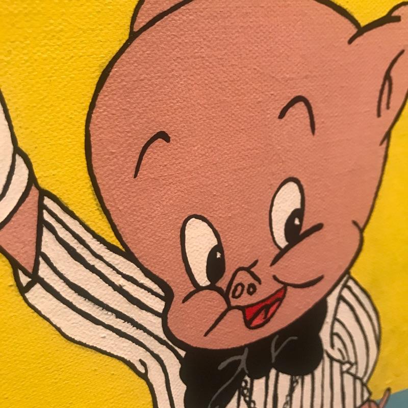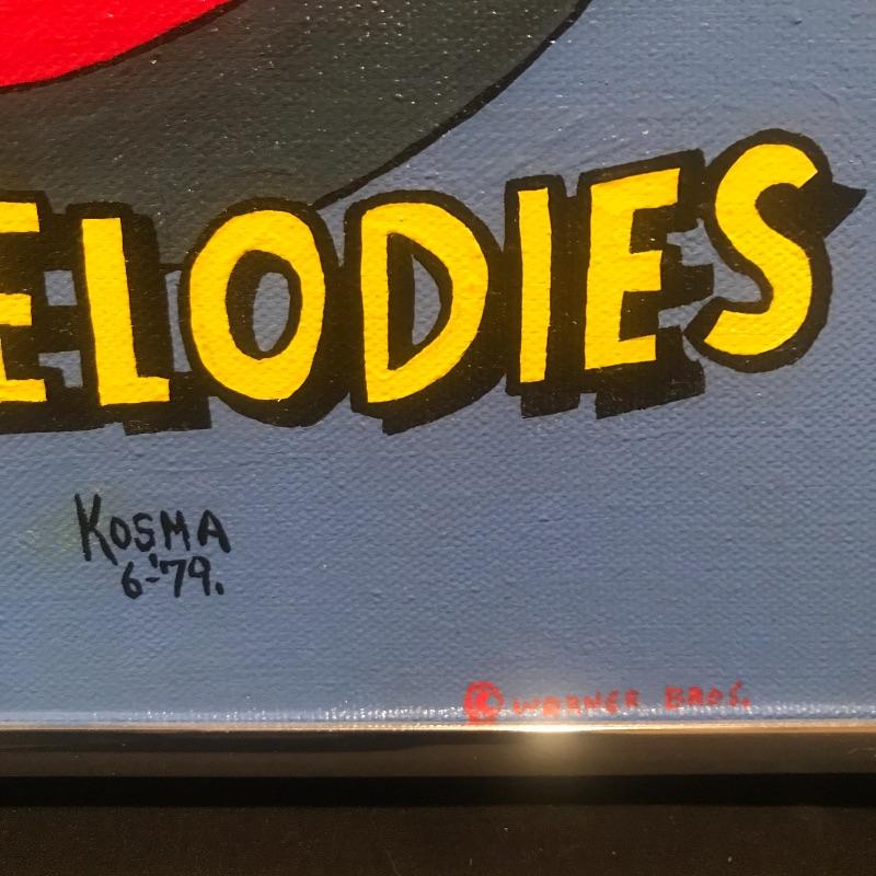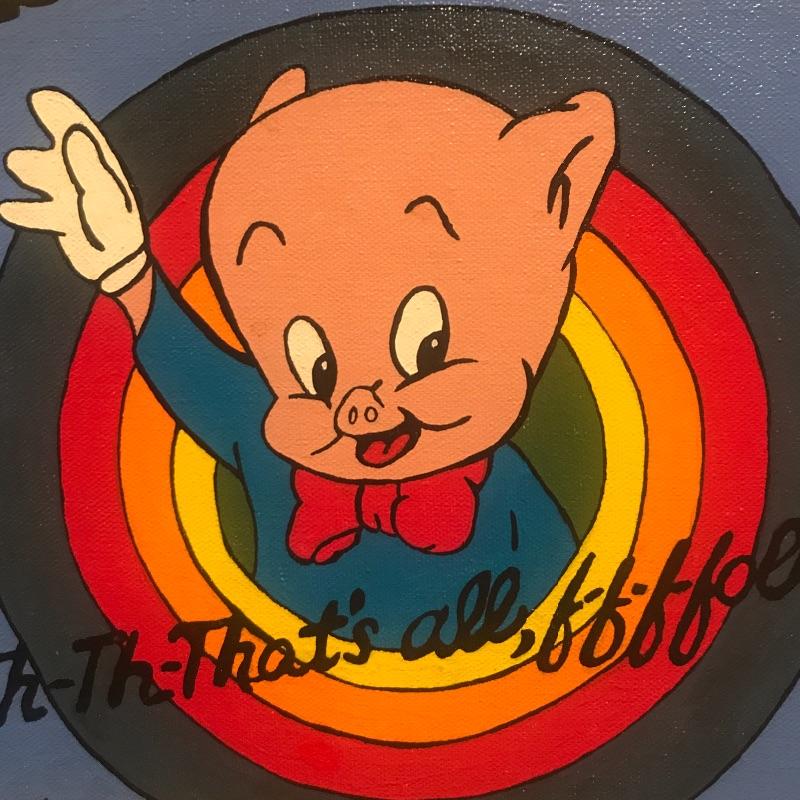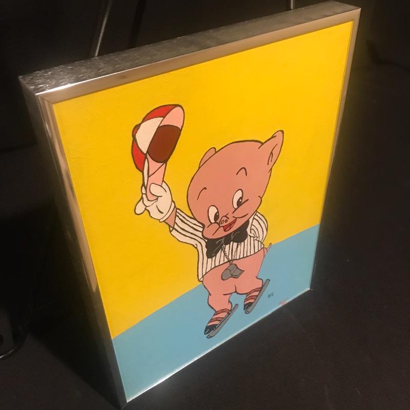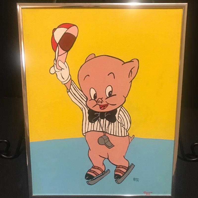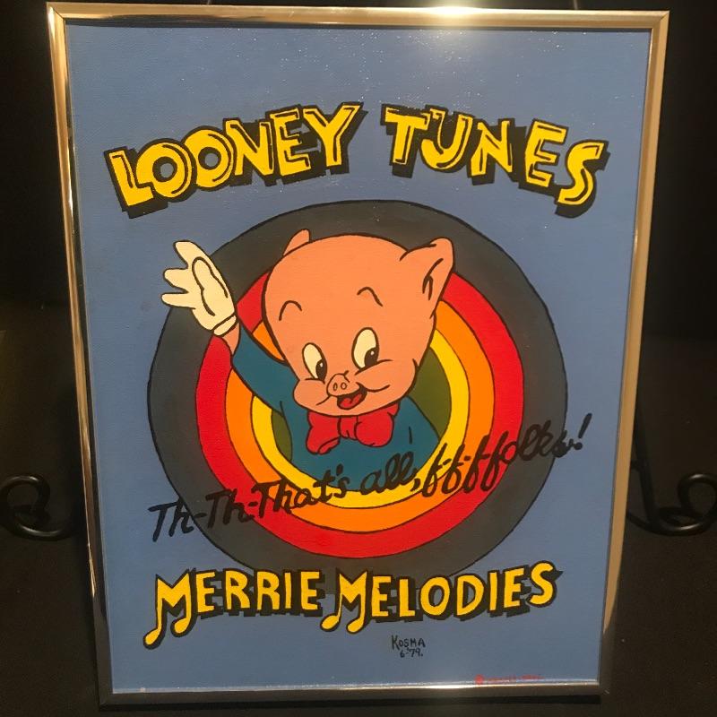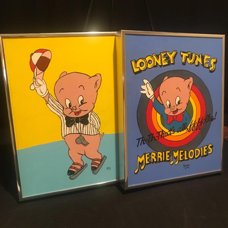 Porky Pig! You hav to love these two paintings of Porky Pig. You remember that cute voice saying “Thats all Folks!” These two paintings are framed on stretched canvas and both measure 14.5” x 11.5”. The Looney Tunes one has a little dirt on one side that could likely be cleaned off if you desire. See photos. They are both signed by Kosma who is a very talented relative of our client. Shipping available.
