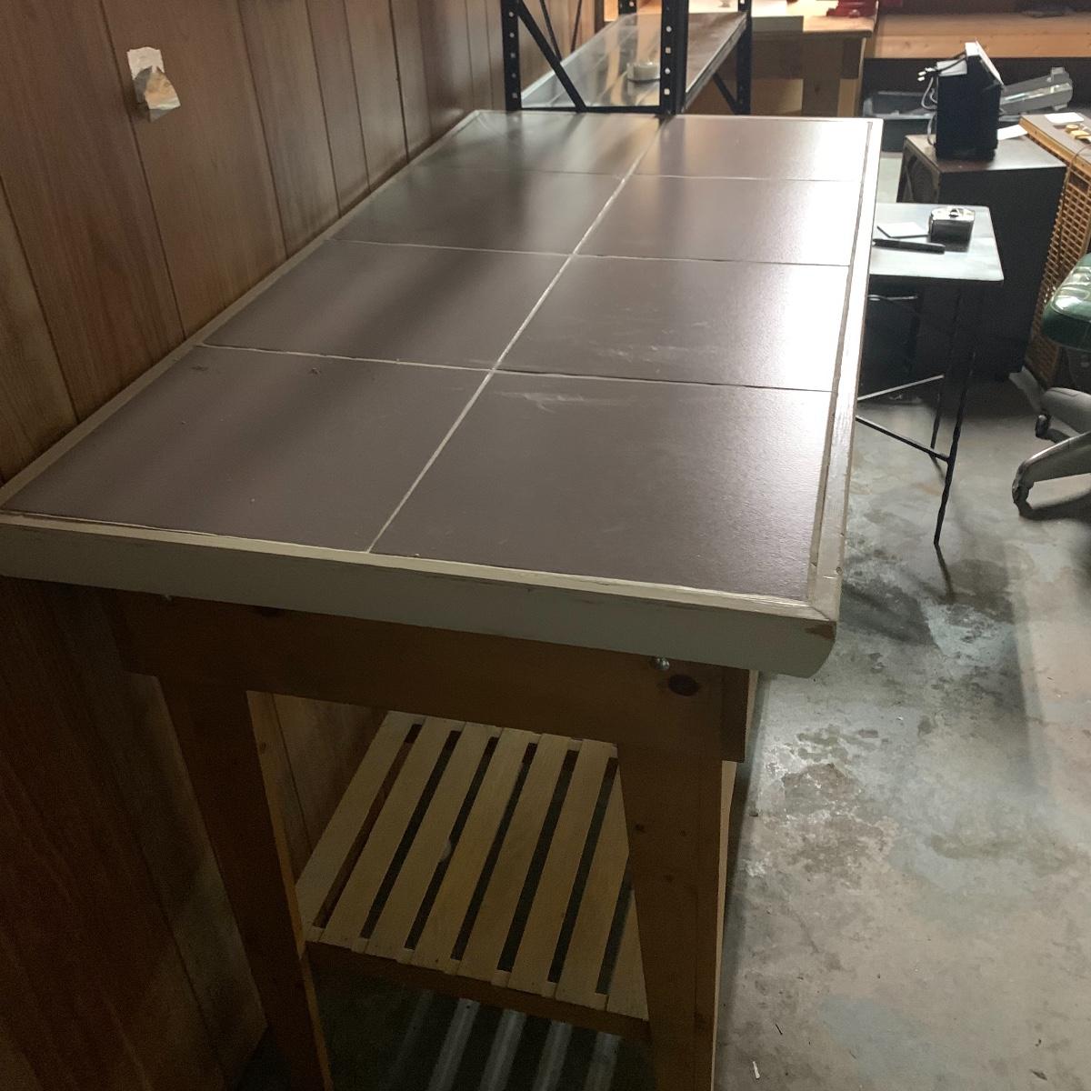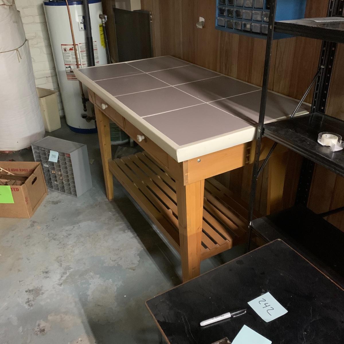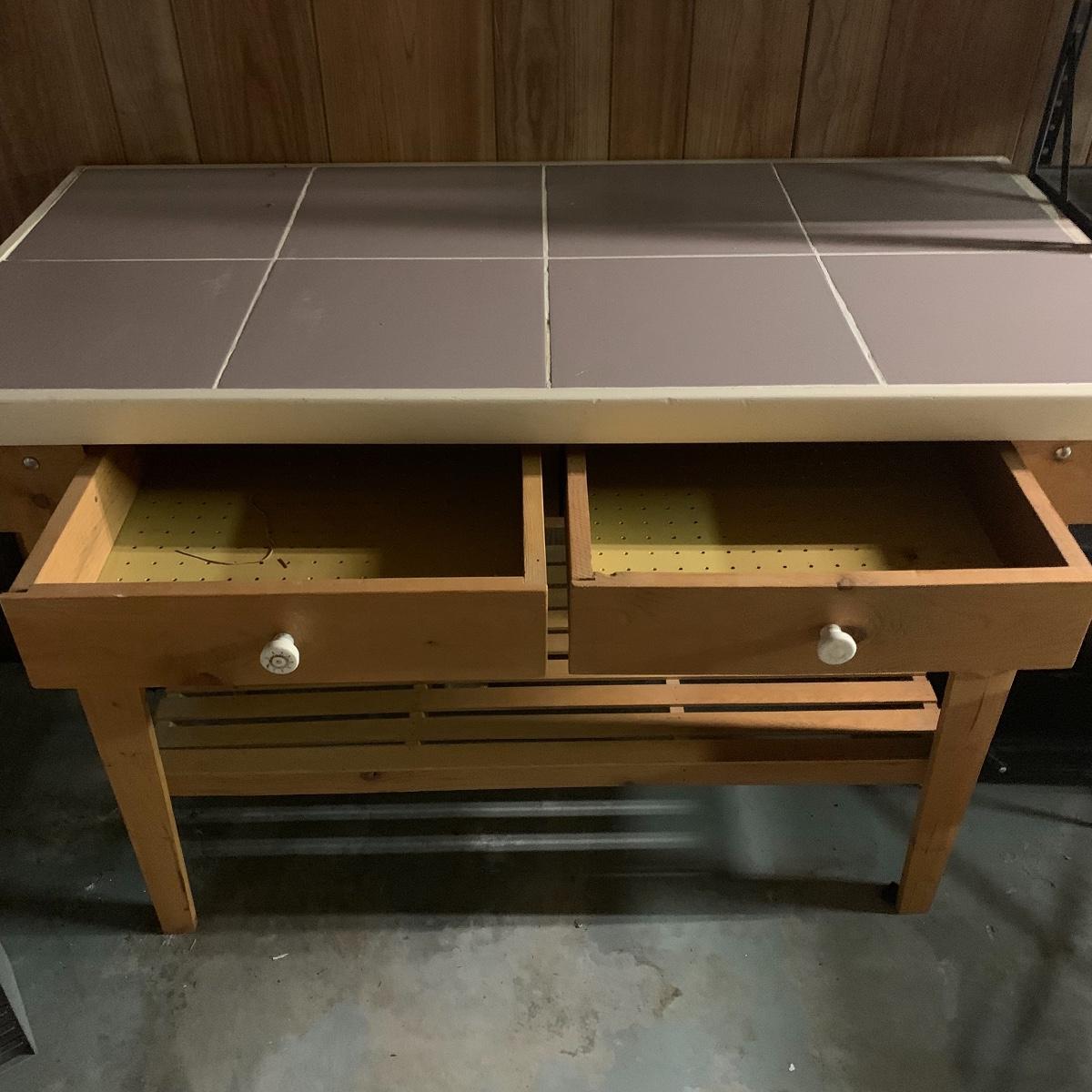 This one’s for you gardeners! Now you can have an official, designated planting station. This piece features a wooden frame with two drawers, and a tile table top. Measurements are 50” wide X 36” tall X 26” deep. This table is in good condition and ready for someone with a green thumb to put it to use. The winning bidder must bring assistance to load this item. Local pickup only.