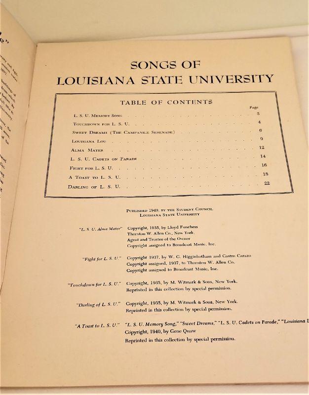 Neat vintage songbook - 1948 - will all the Louisiana State University songs, including "Darling of LSU" written by Huey Long in 1935. Full piano accompaniment for each. Excellent condition. Measures 9" x 12".