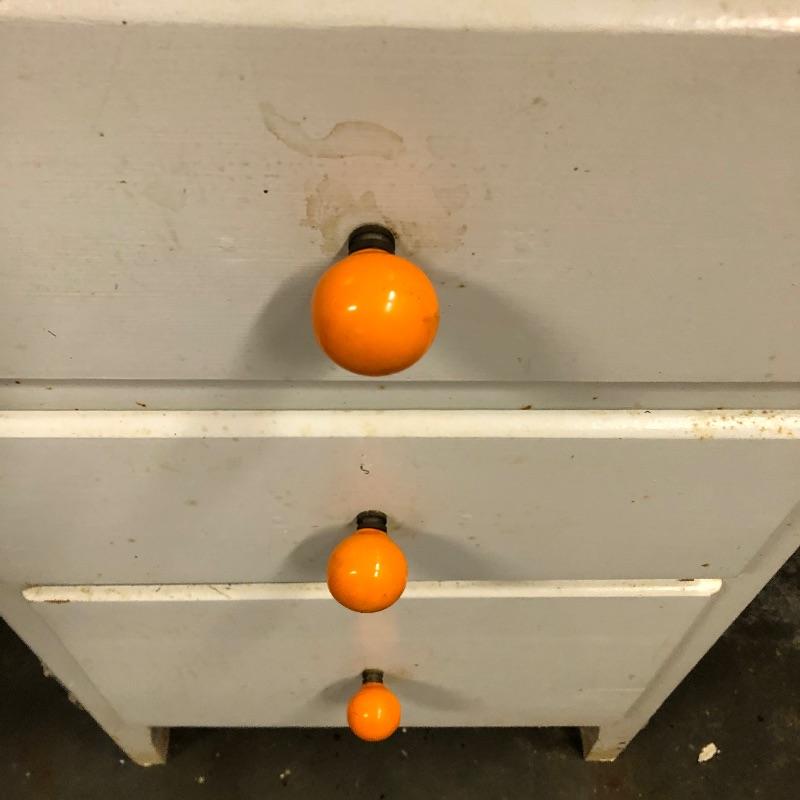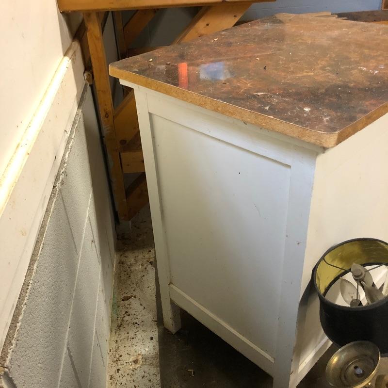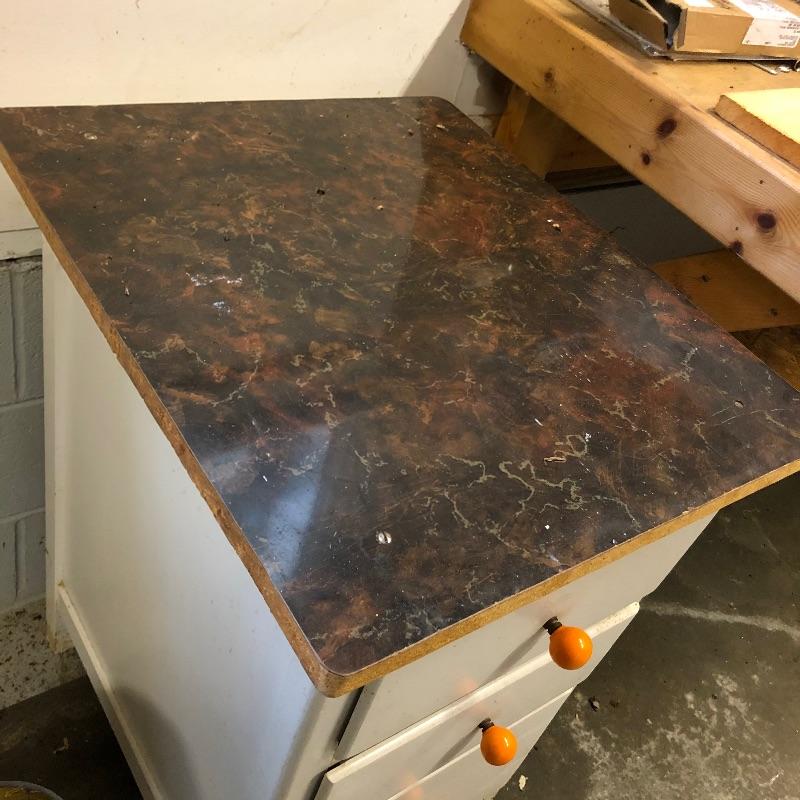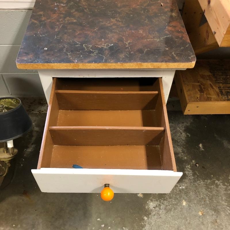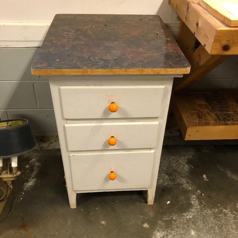 This light grey painted wood piece would work great for extra storage and work space in your garage or mud room. The top is pressed wood with Formica and it comes with 3 drawers.