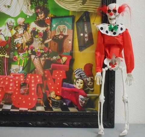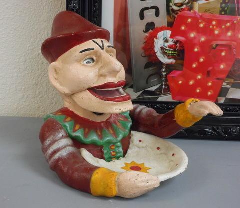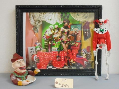 Nice cast iron nut cracker that looks like a clown and a framed burlesque style picture with scary clown on the right hand side.
