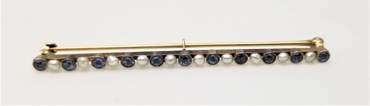 Vintage 14kt gold bar pin set with seed pearls and a blue stone. Minimum bid is about 10% over scrap price for the gold. 2.5" long, good antique condition.