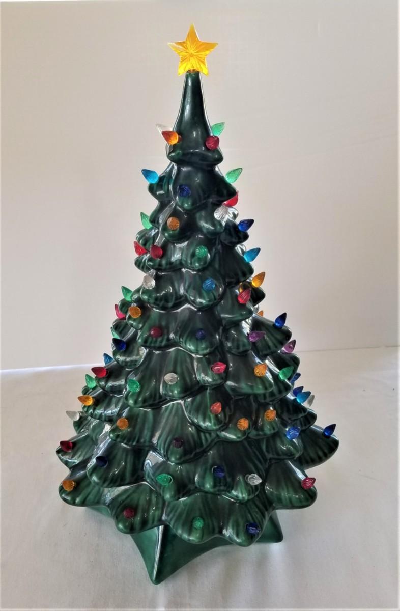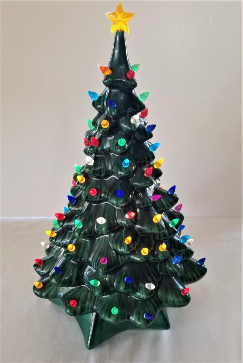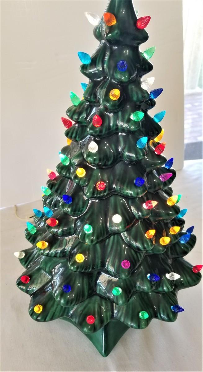 Attic find! Great vintage ceramic Christmas tree - complete with all bulbs - works. Good condition. Stands 19" tall. This is a Musical tree, but the music box appears to be either overwound or "gunked" inside and does not work. Does not detract from the look of the tree.