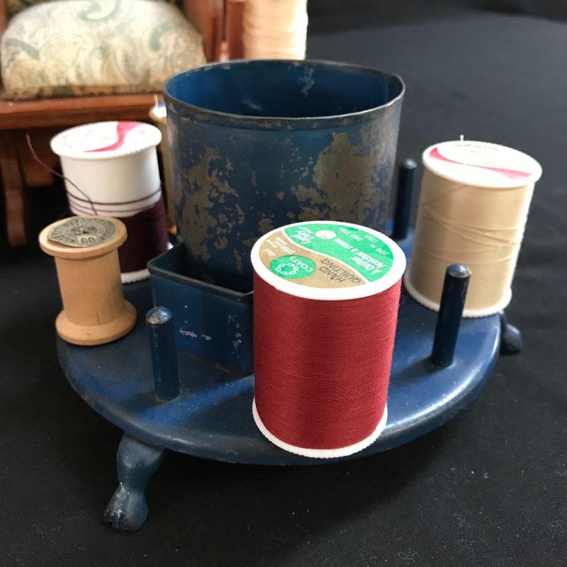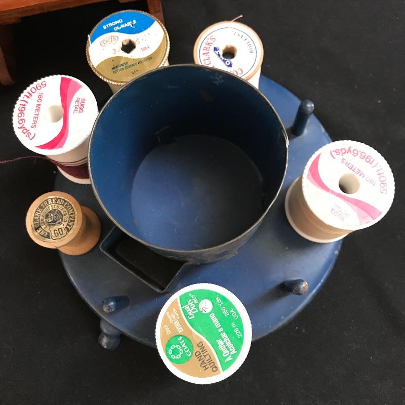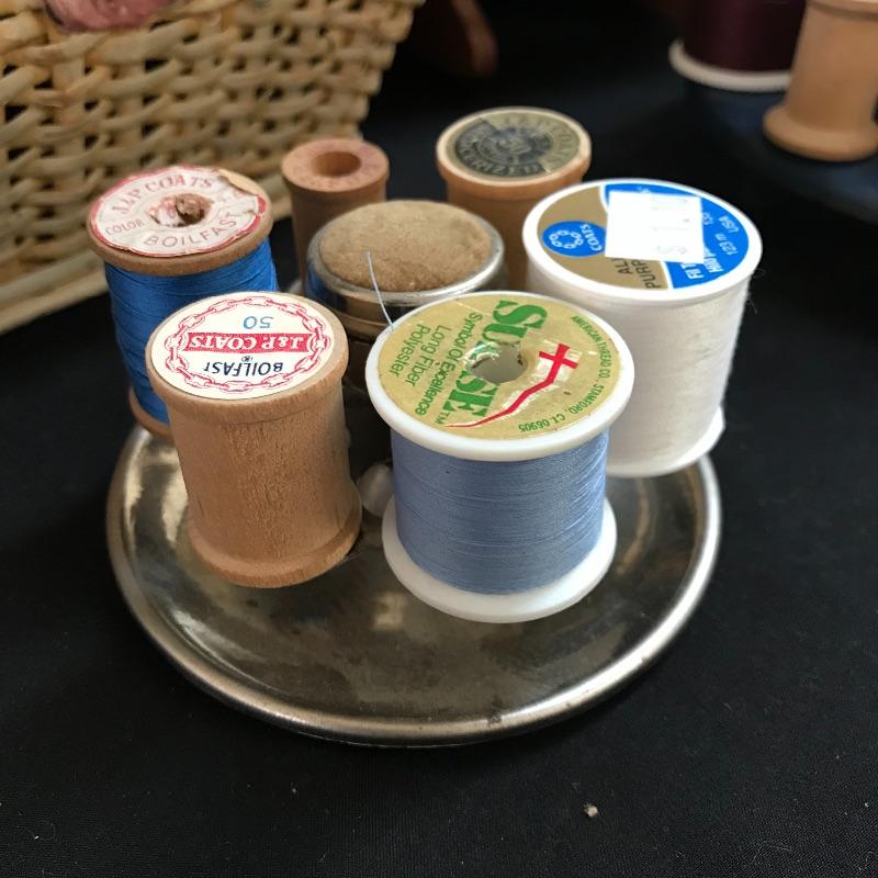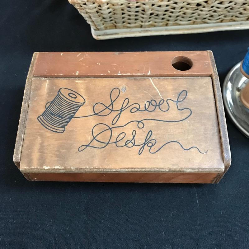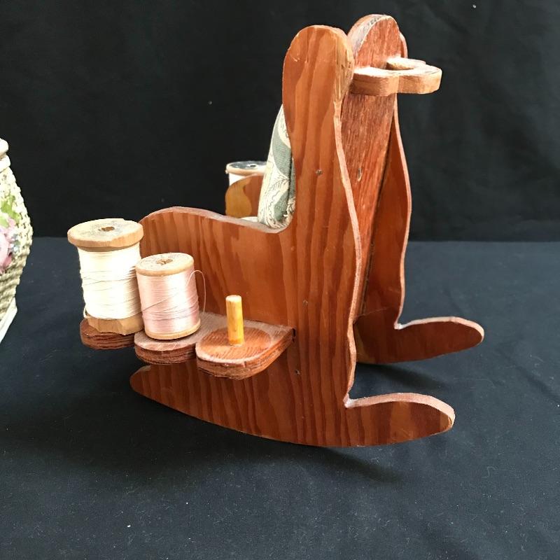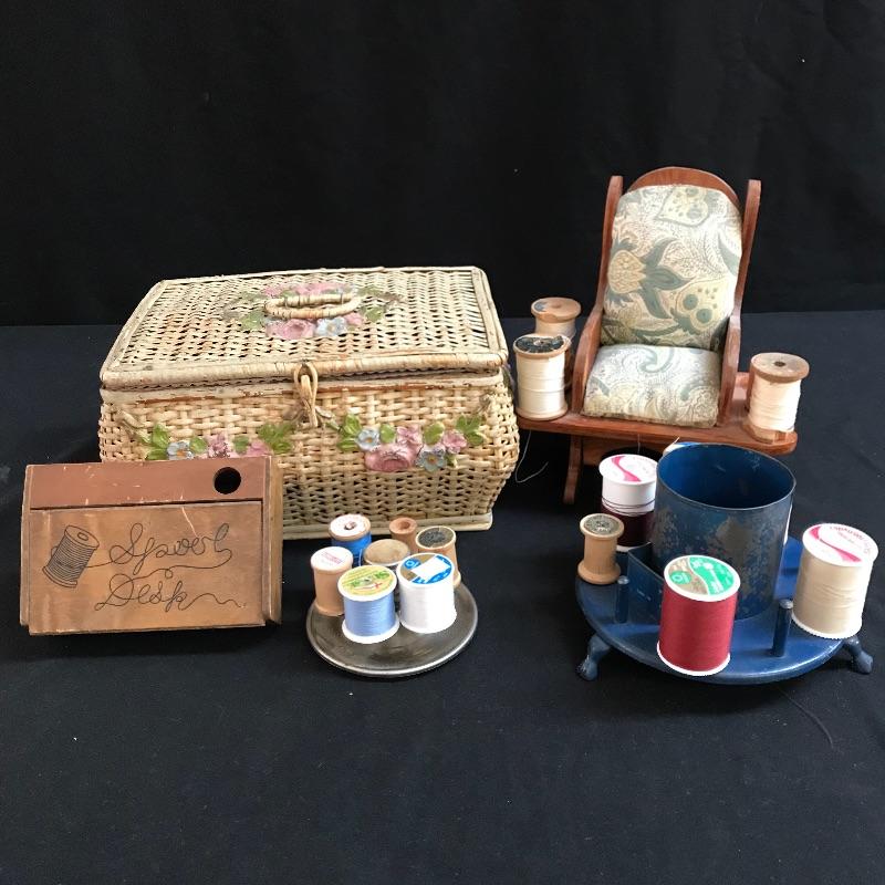 Lovely thread and sewing collection perfect for a vintage motif. Three unique spool holders, two are metal and one is a rocking chair complete with upholstery and rocking capabilities. Thread spoils are included, some are wooden. A vintage spool desk and lined painted basket marked June 12th 1929 on its base. Basket measures approximately 10” x 7” x 5”. Shipping available.