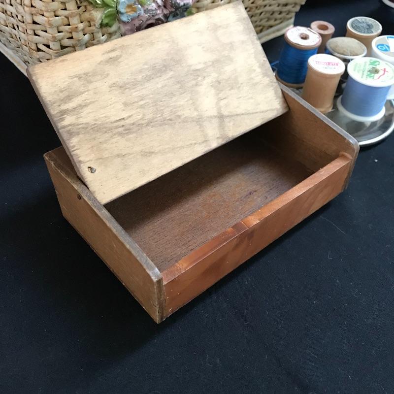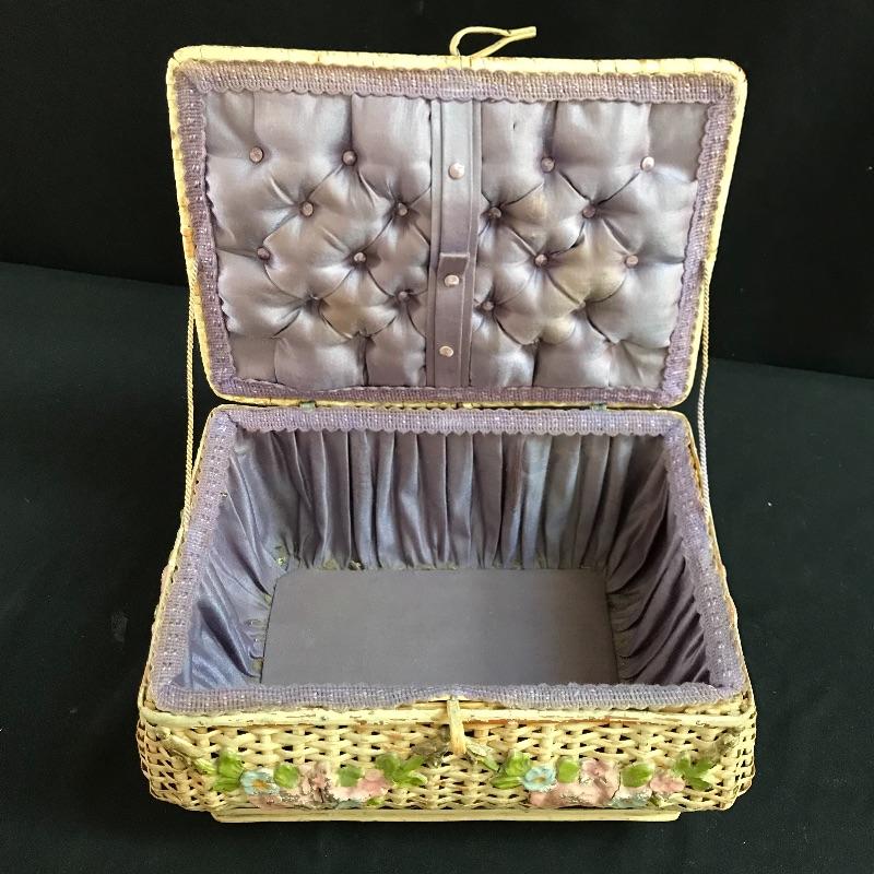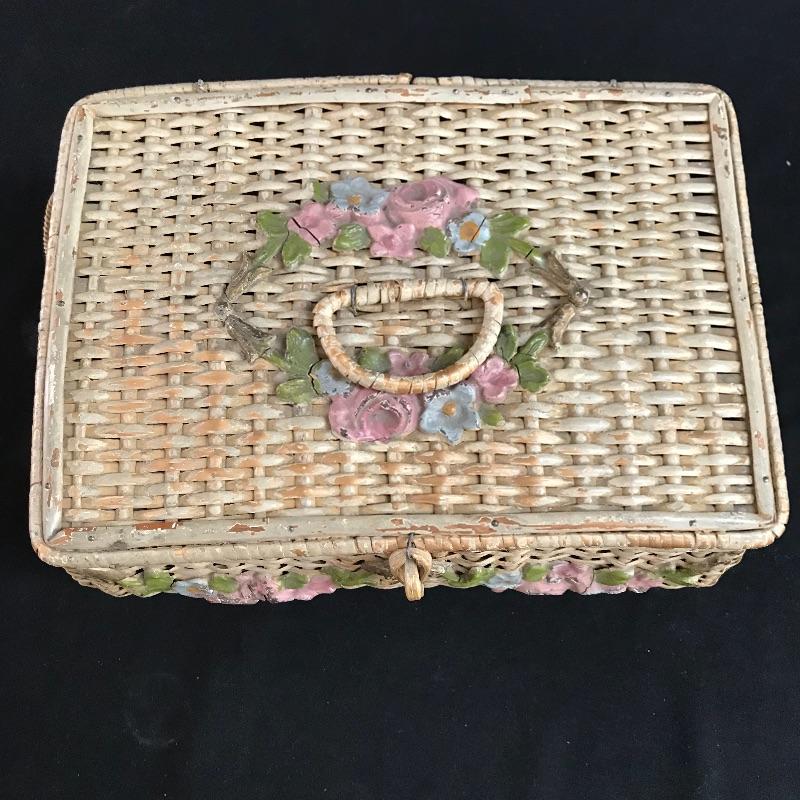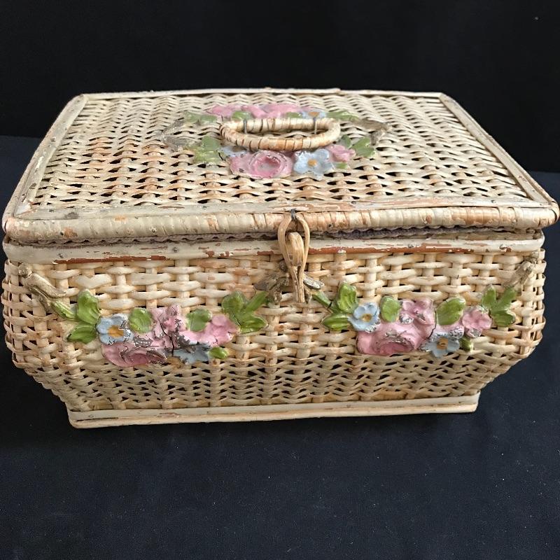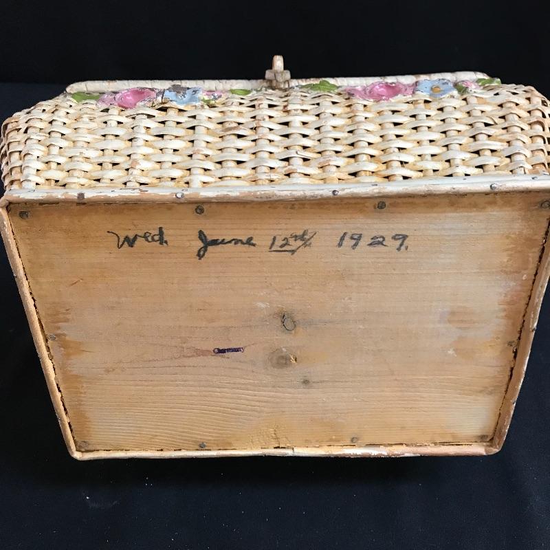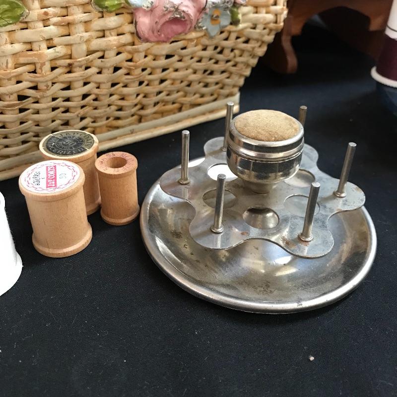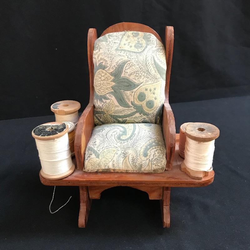 Lovely thread and sewing collection perfect for a vintage motif. Three unique spool holders, two are metal and one is a rocking chair complete with upholstery and rocking capabilities. Thread spoils are included, some are wooden. A vintage spool desk and lined painted basket marked June 12th 1929 on its base. Basket measures approximately 10” x 7” x 5”. Shipping available.