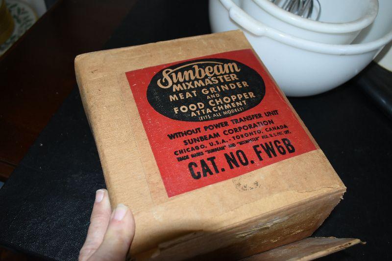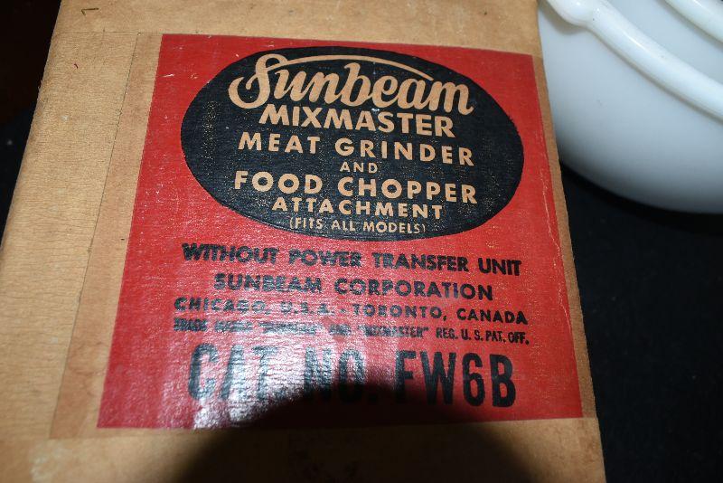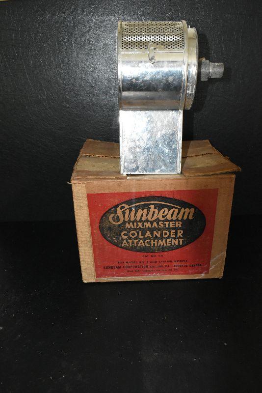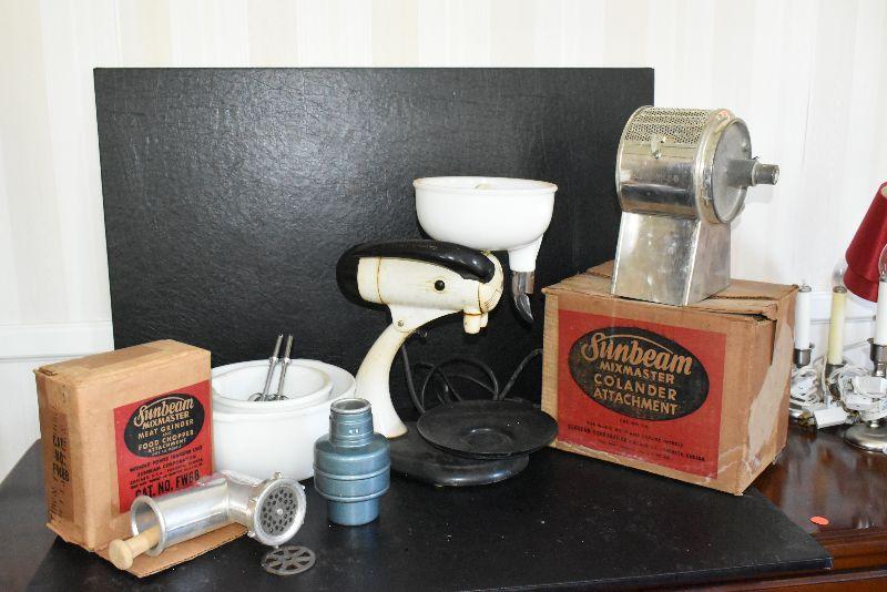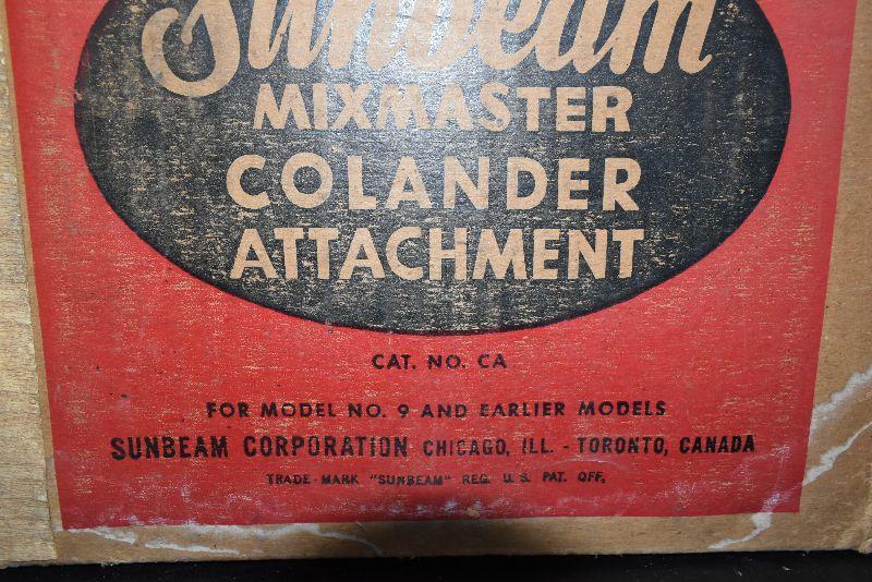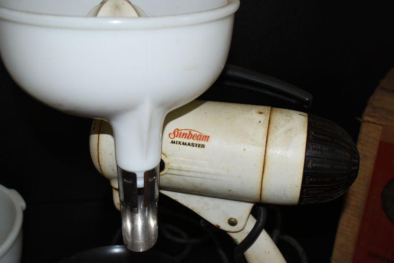 Sunbeam mixer comes with attachments, a colander, a meat grinder/food chopper, and a juicer. Untested.