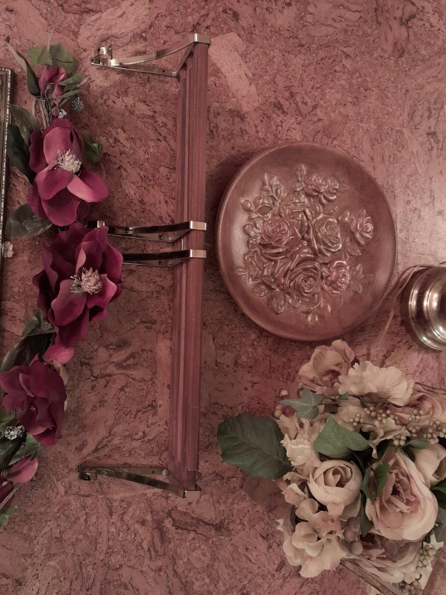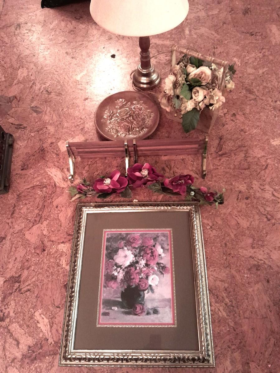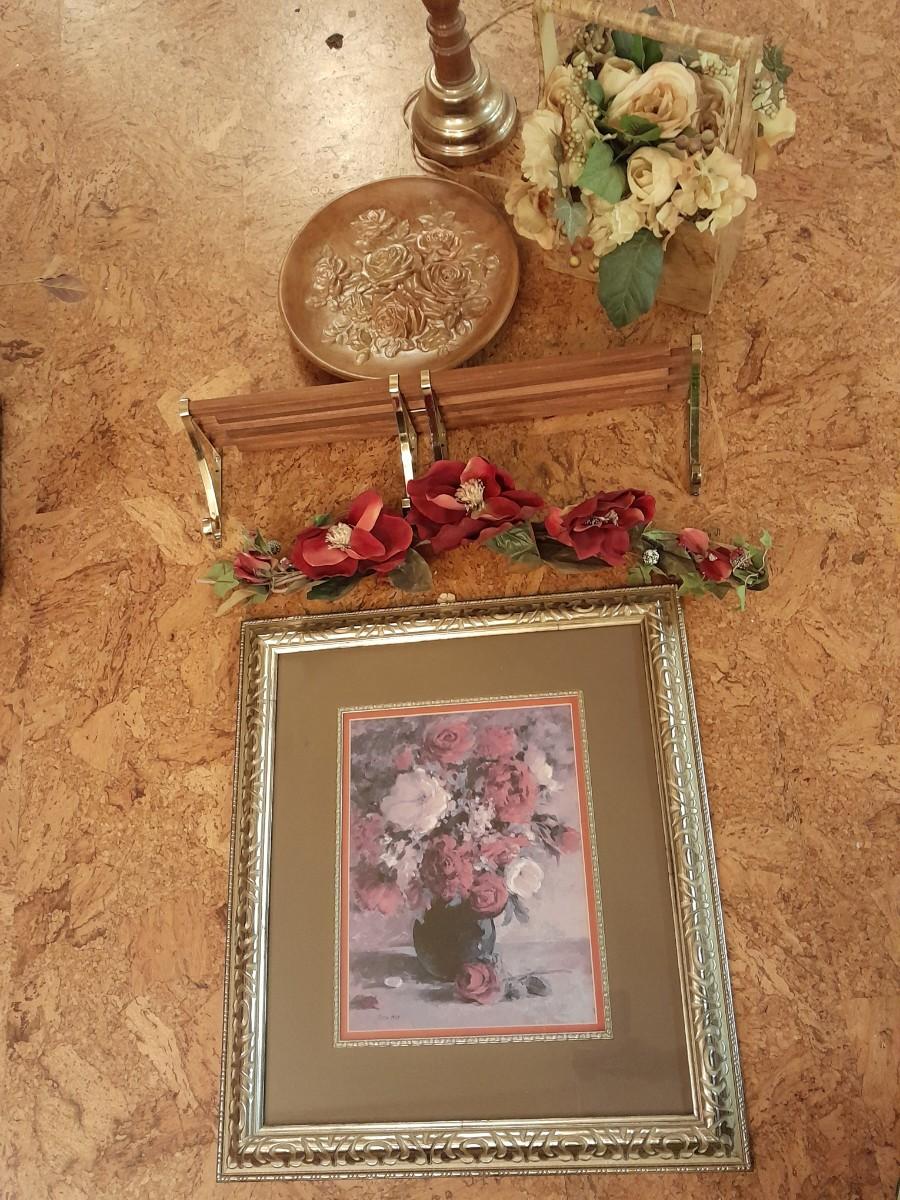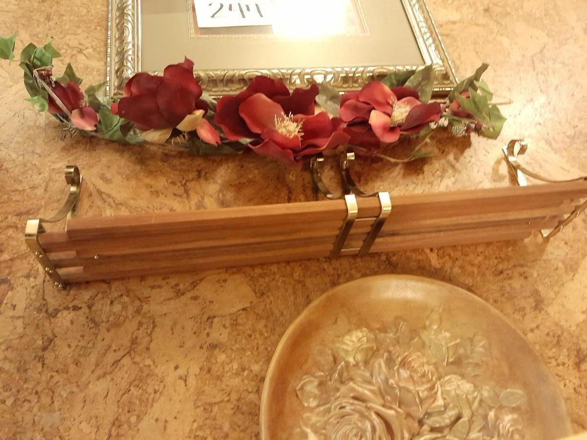 SLATTED WOOD WALL SHELF WITH GOLD ACCENTED BRACKETS, ROSE THEMED WALL HANGING PLATE, DOOR SASH, AND FRAMED ROSE PICTURE