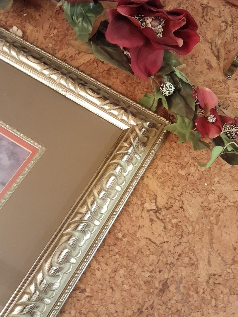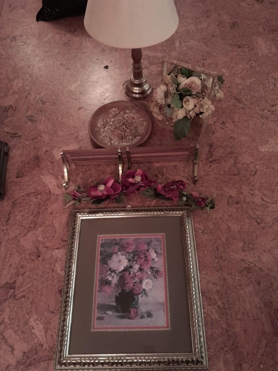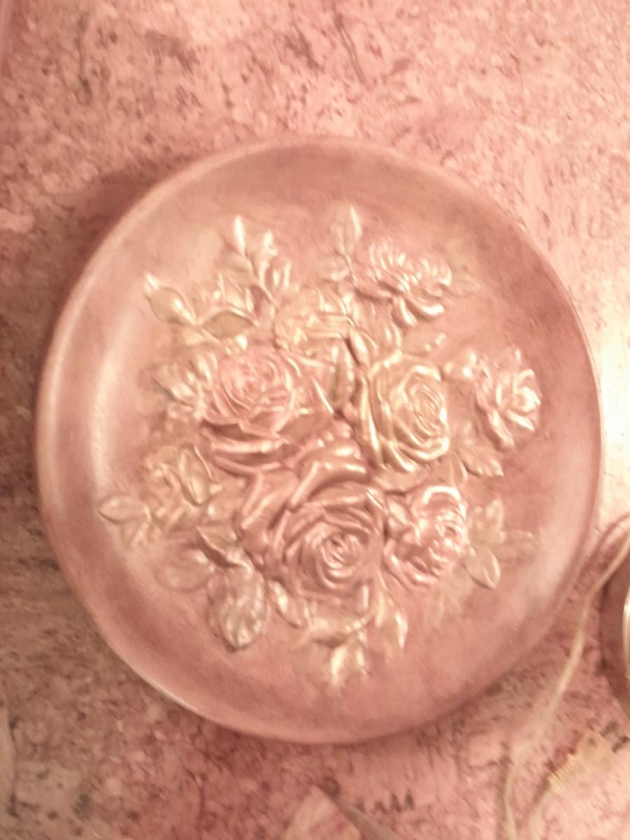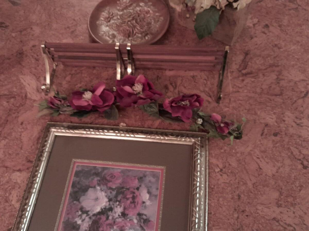 SLATTED WOOD WALL SHELF WITH GOLD ACCENTED BRACKETS, ROSE THEMED WALL HANGING PLATE, DOOR SASH, AND FRAMED ROSE PICTURE