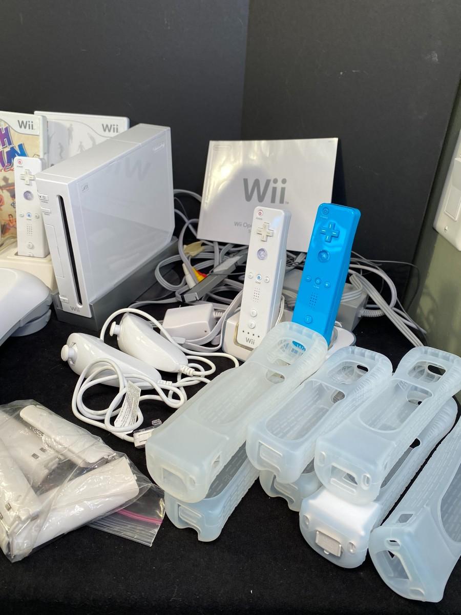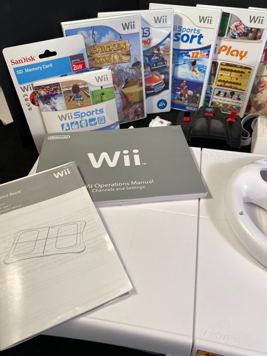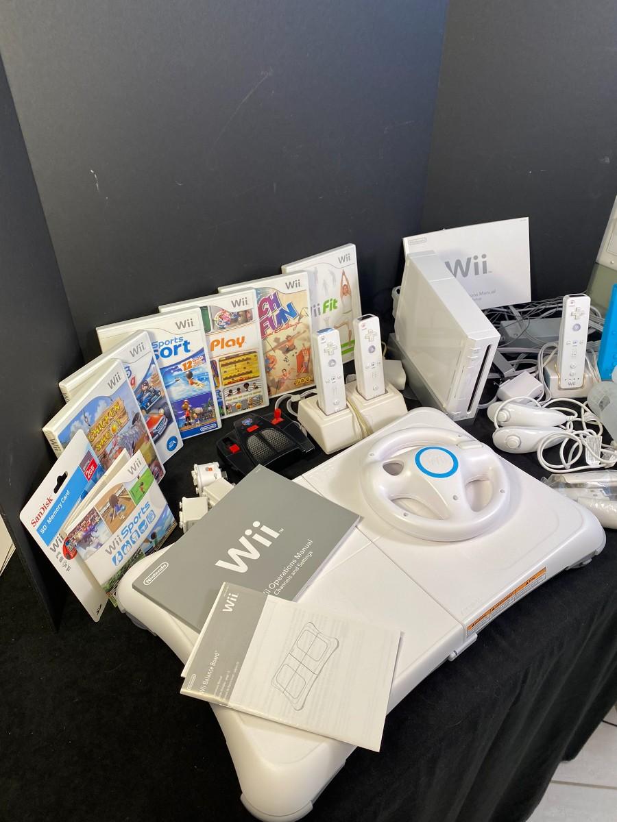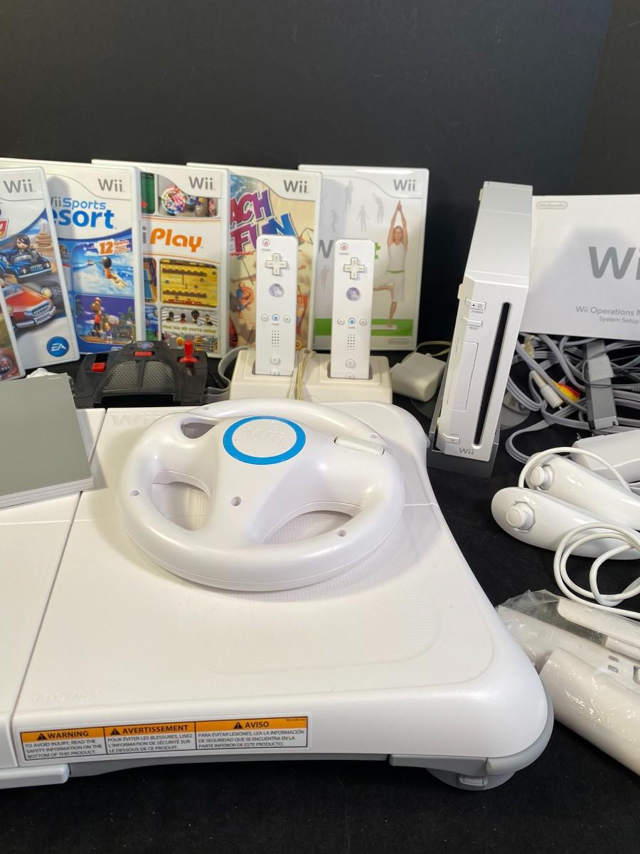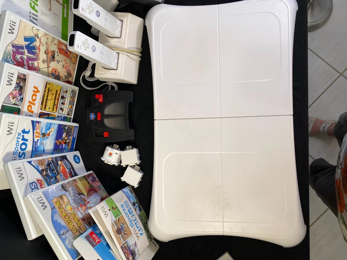 Wii Fit board, console, 4 remotes, 6 games, and various accessories.