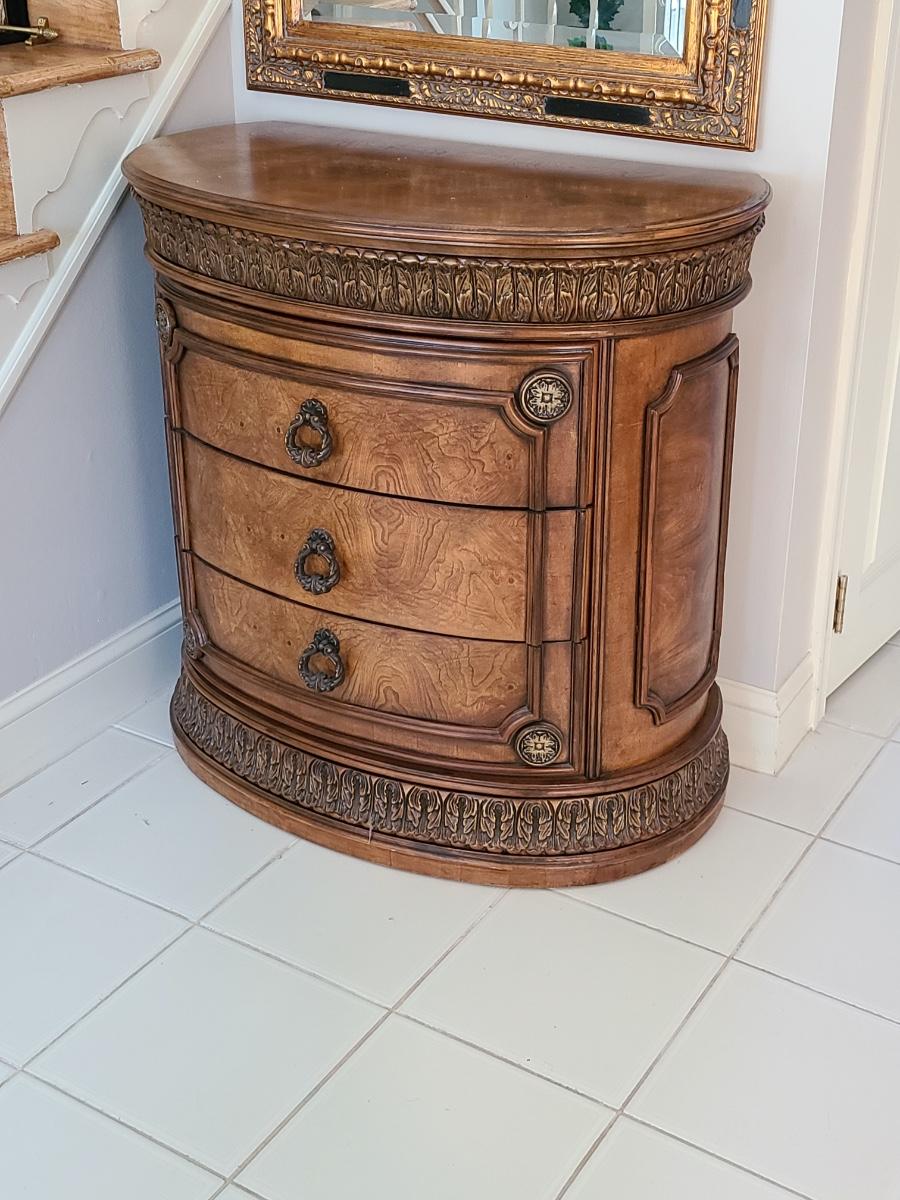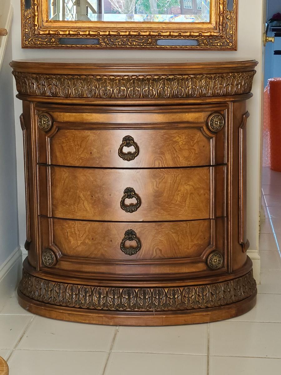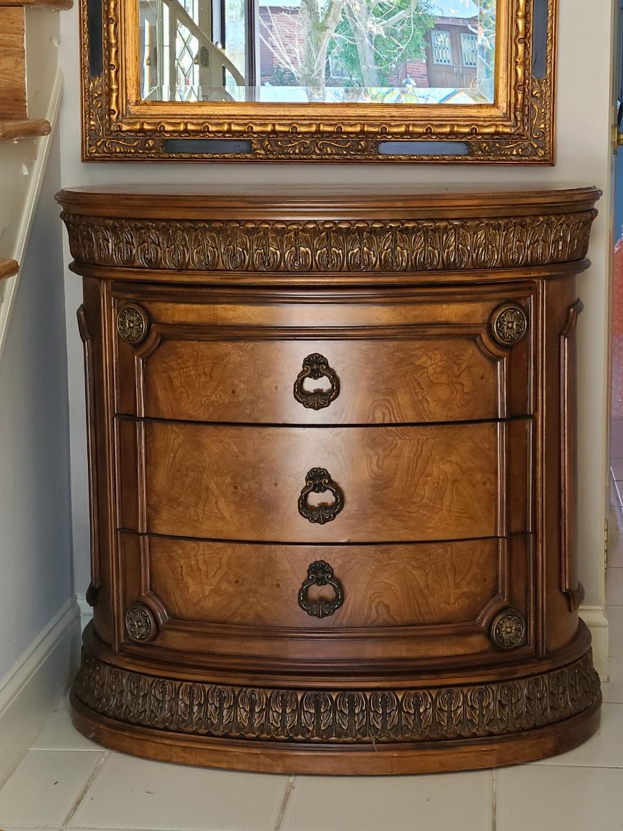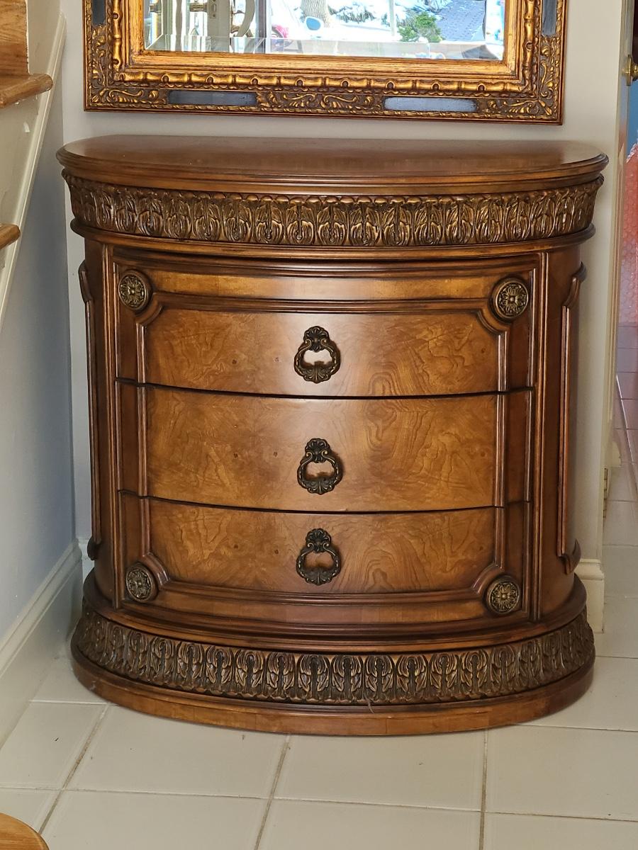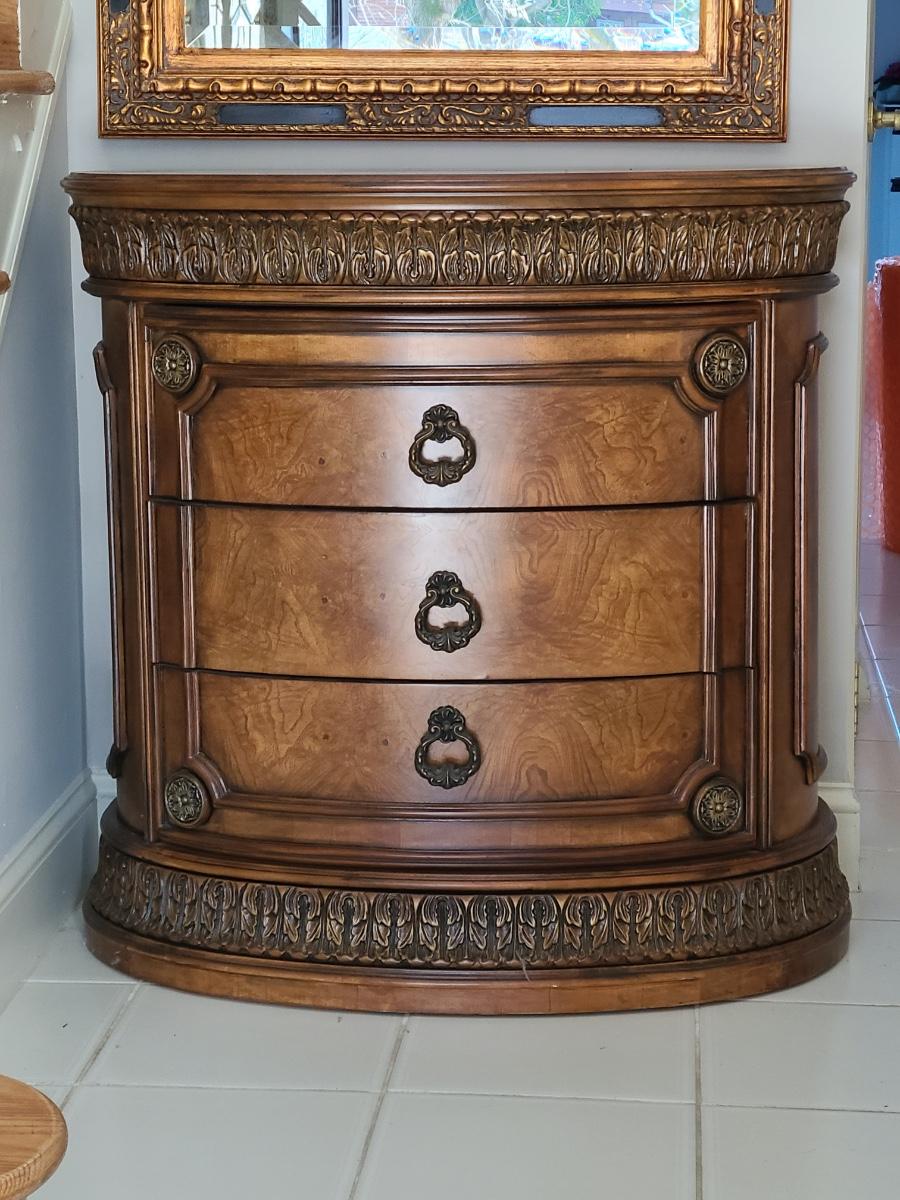 This lovely piece has been used as an entryway hall table and would look amazing in any room. It has three drawers for storage with gold accents on the hardware and carved edges. The front has a burl wood design. 34x19x35 inches tall. Solid piece with functional design. Please see all pictures as they are the best representation of the items. The pictures show condition, measurements if taken, and what is included in the lot. Due to the large amount that we photograph and the time frame, we are not always able to take measurements. All items unless noted, are pre-owned and have been used. If you purchased furniture, you must bring help. We do not allow one person to carry large furniture out on their own. Bring help, tools and a truck for the safety of our client’s homes, and your personal safety. Company policy. Thank you.