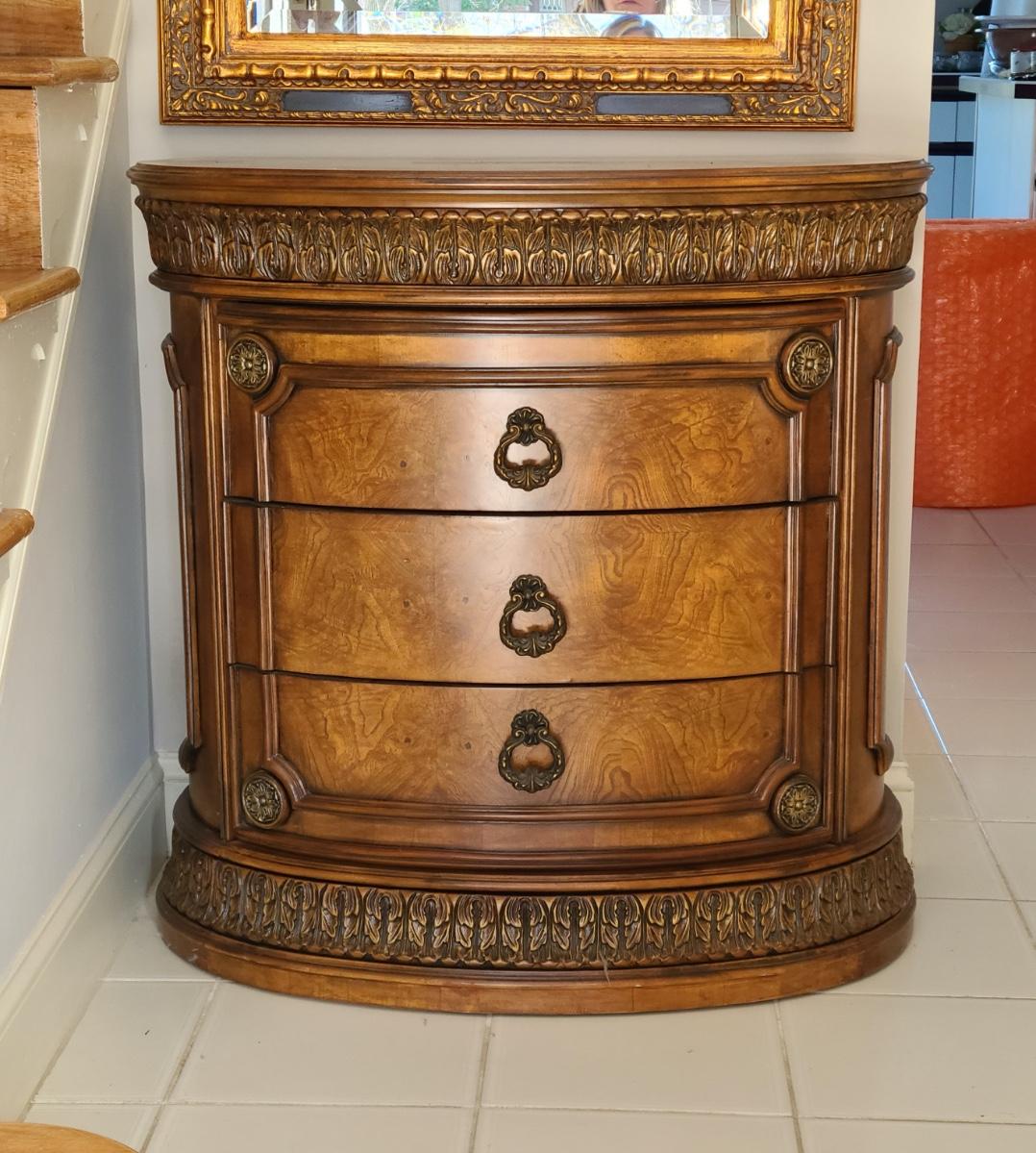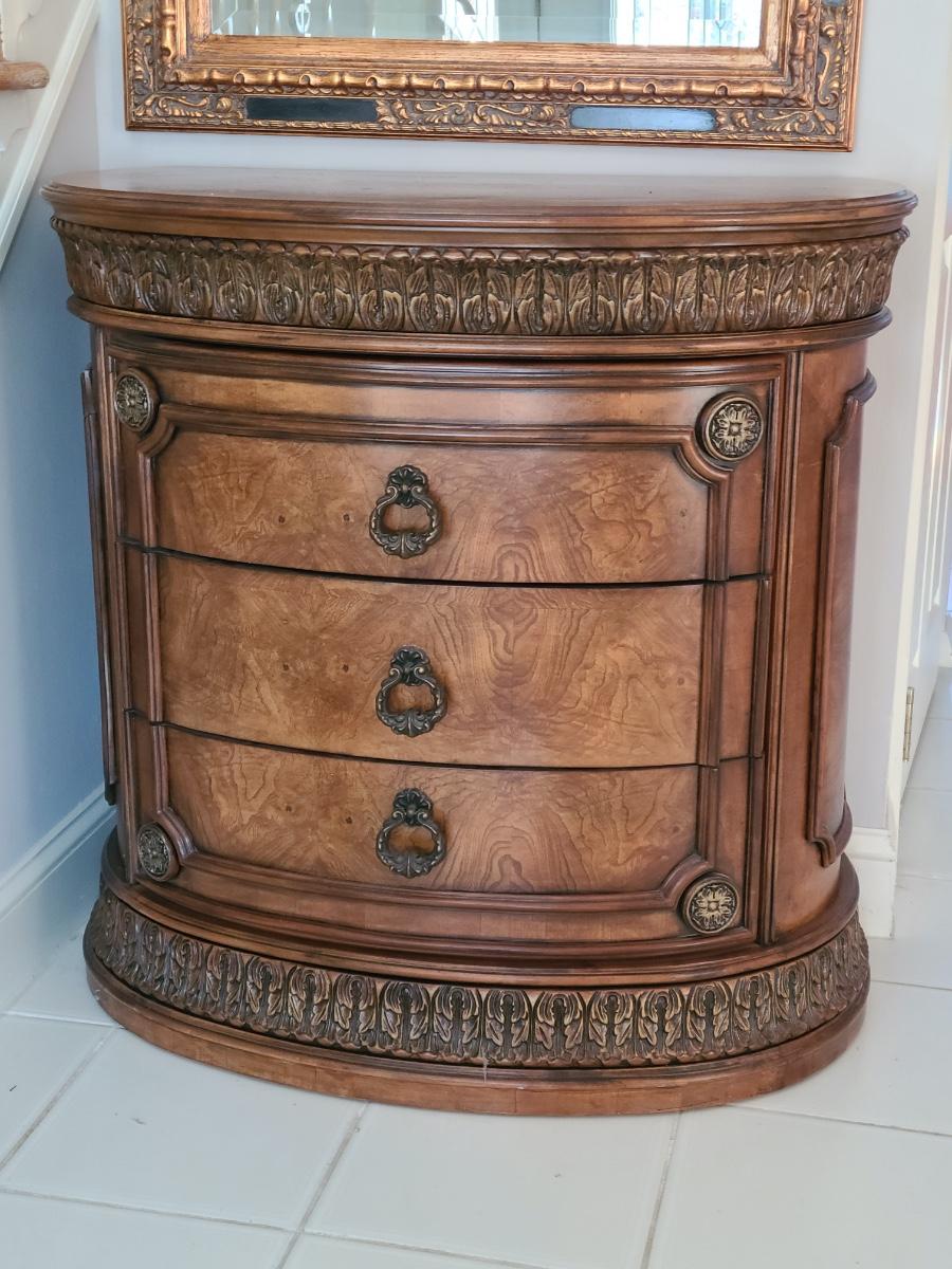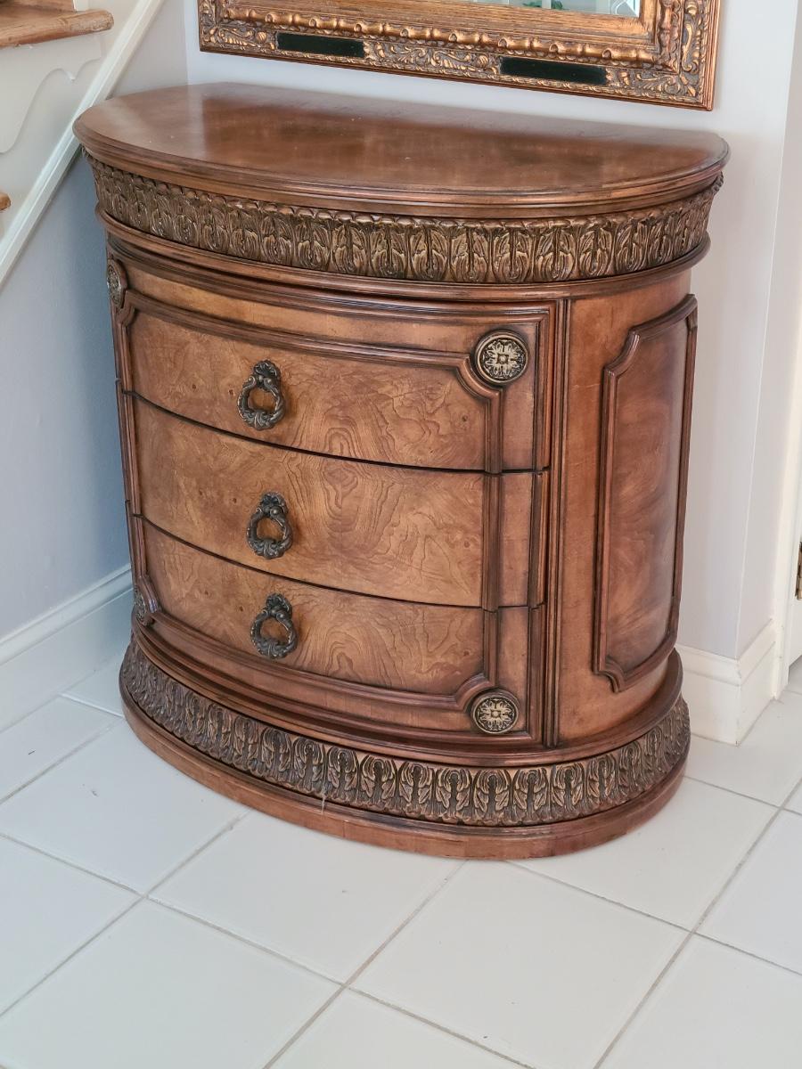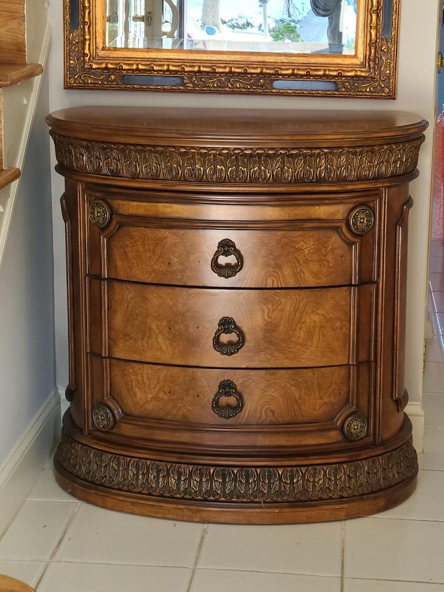 This lovely piece has been used as an entryway hall table and would look amazing in any room. It has three drawers for storage with gold accents on the hardware and carved edges. The front has a burl wood design. 34x19x35 inches tall. Solid piece with functional design. Please see all pictures as they are the best representation of the items. The pictures show condition, measurements if taken, and what is included in the lot. Due to the large amount that we photograph and the time frame, we are not always able to take measurements. All items unless noted, are pre-owned and have been used. If you purchased furniture, you must bring help. We do not allow one person to carry large furniture out on their own. Bring help, tools and a truck for the safety of our client’s homes, and your personal safety. Company policy. Thank you.