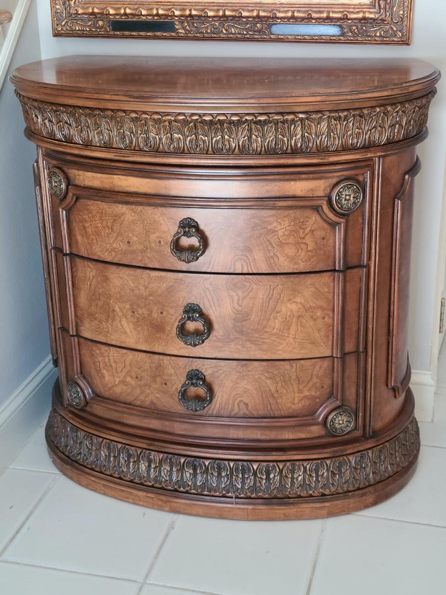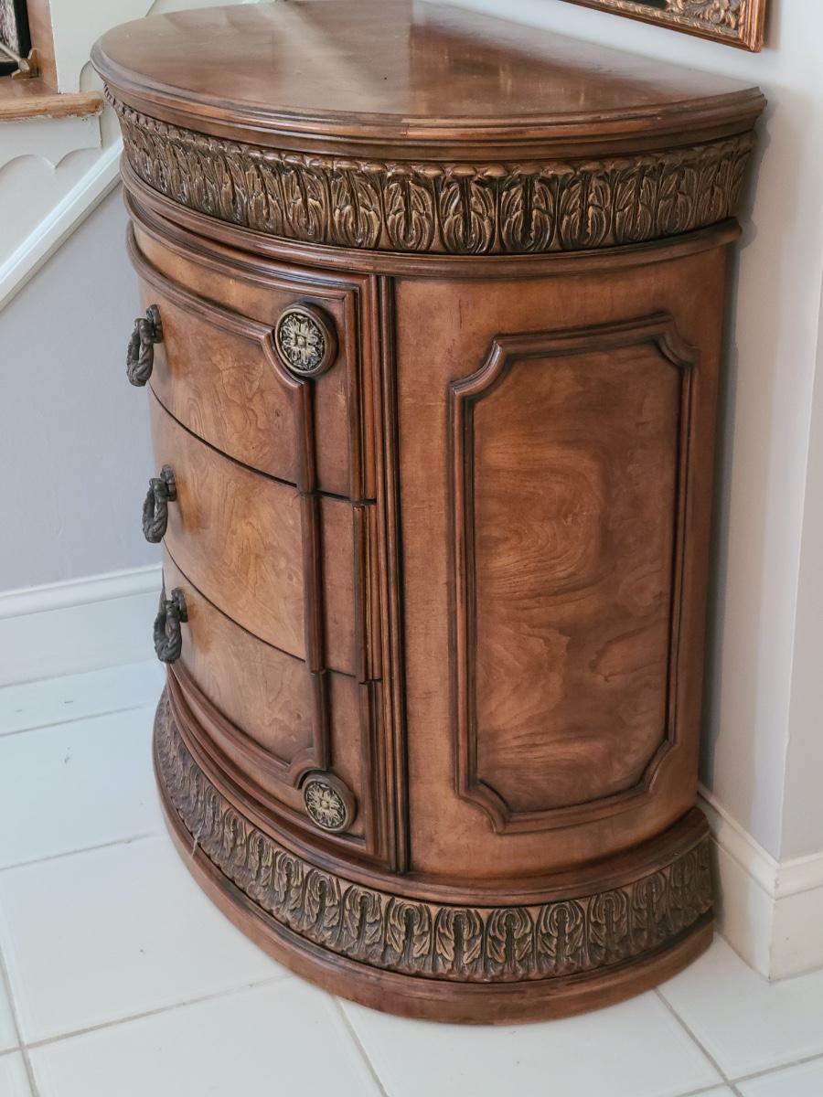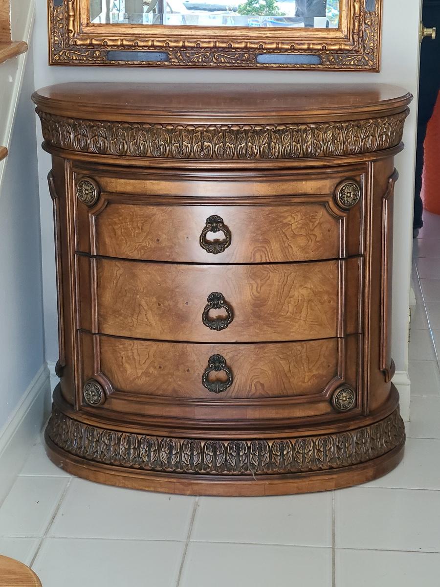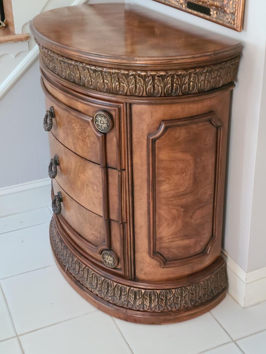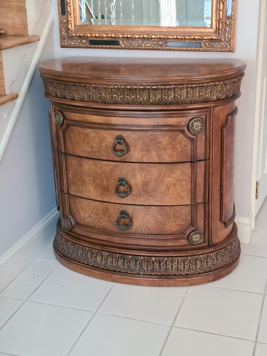 This lovely piece has been used as an entryway hall table and would look amazing in any room. It has three drawers for storage with gold accents on the hardware and carved edges. The front has a burl wood design. 34x19x35 inches tall. Solid piece with functional design. Please see all pictures as they are the best representation of the items. The pictures show condition, measurements if taken, and what is included in the lot. Due to the large amount that we photograph and the time frame, we are not always able to take measurements. All items unless noted, are pre-owned and have been used. If you purchased furniture, you must bring help. We do not allow one person to carry large furniture out on their own. Bring help, tools and a truck for the safety of our client’s homes, and your personal safety. Company policy. Thank you.