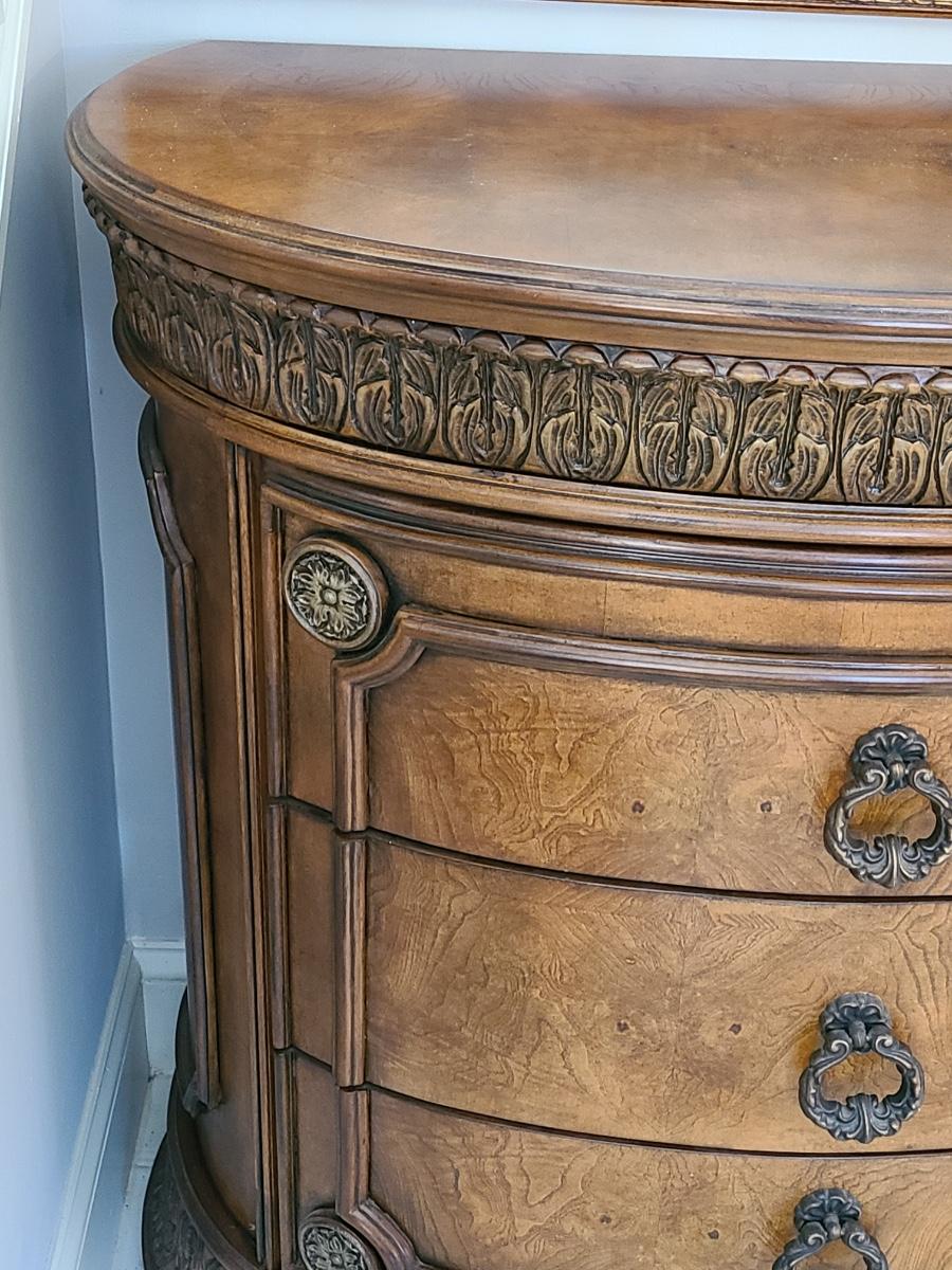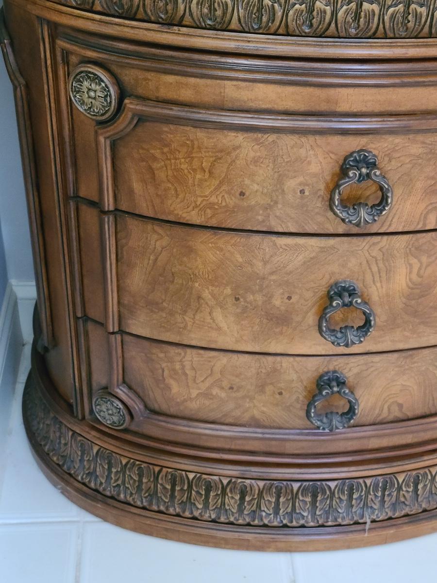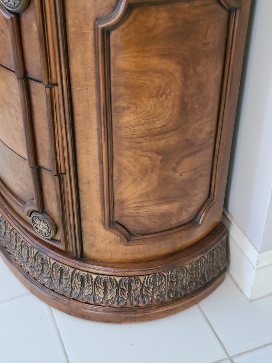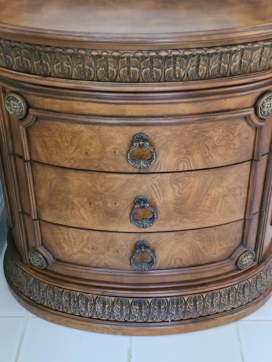 This lovely piece has been used as an entryway hall table and would look amazing in any room. It has three drawers for storage with gold accents on the hardware and carved edges. The front has a burl wood design. 34x19x35 inches tall. Solid piece with functional design. Please see all pictures as they are the best representation of the items. The pictures show condition, measurements if taken, and what is included in the lot. Due to the large amount that we photograph and the time frame, we are not always able to take measurements. All items unless noted, are pre-owned and have been used. If you purchased furniture, you must bring help. We do not allow one person to carry large furniture out on their own. Bring help, tools and a truck for the safety of our client’s homes, and your personal safety. Company policy. Thank you.