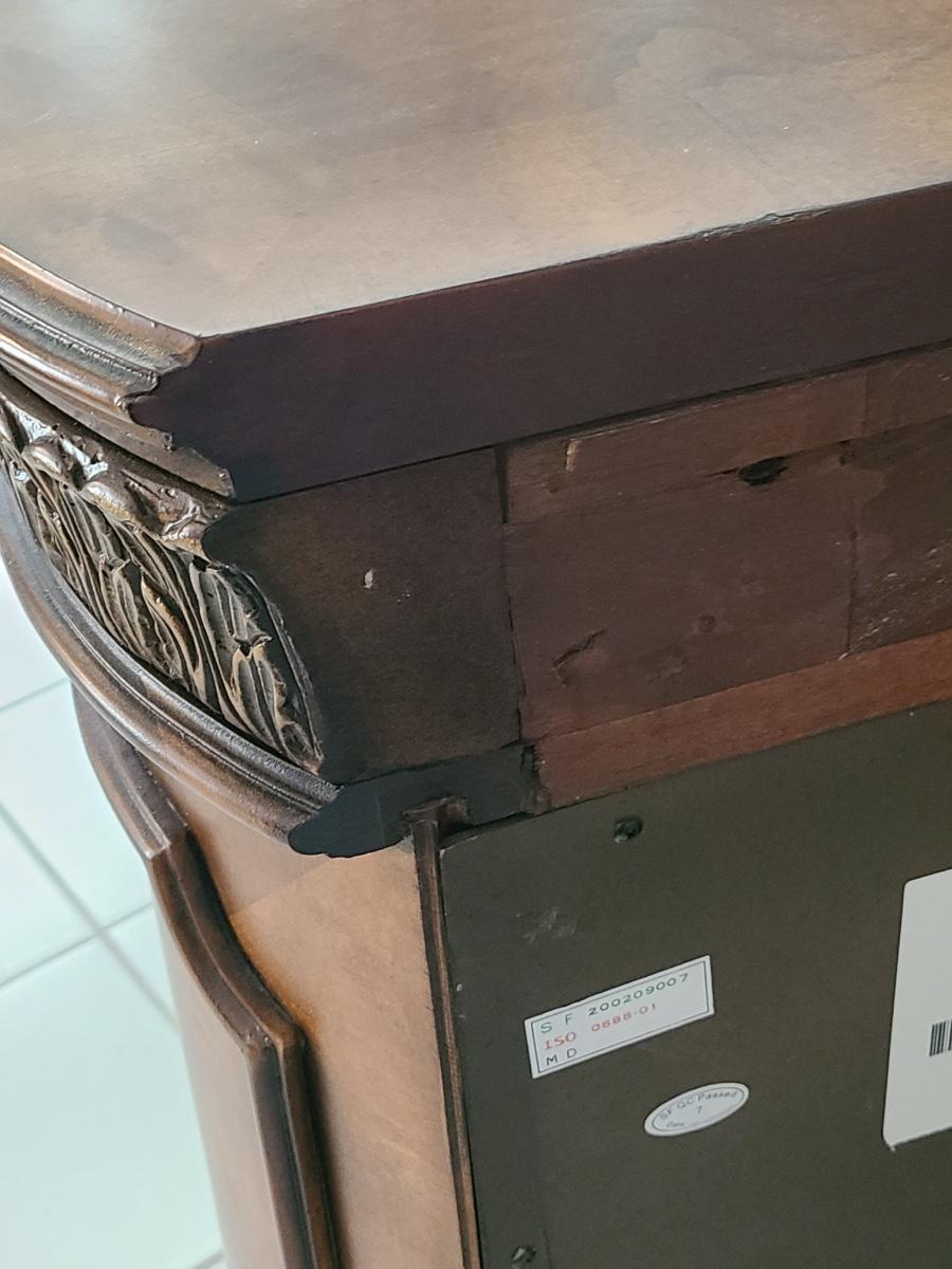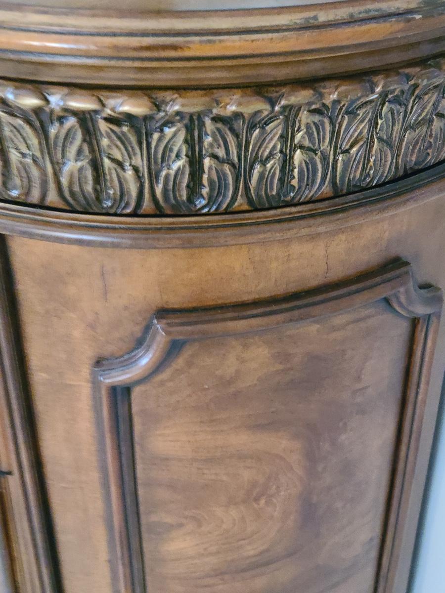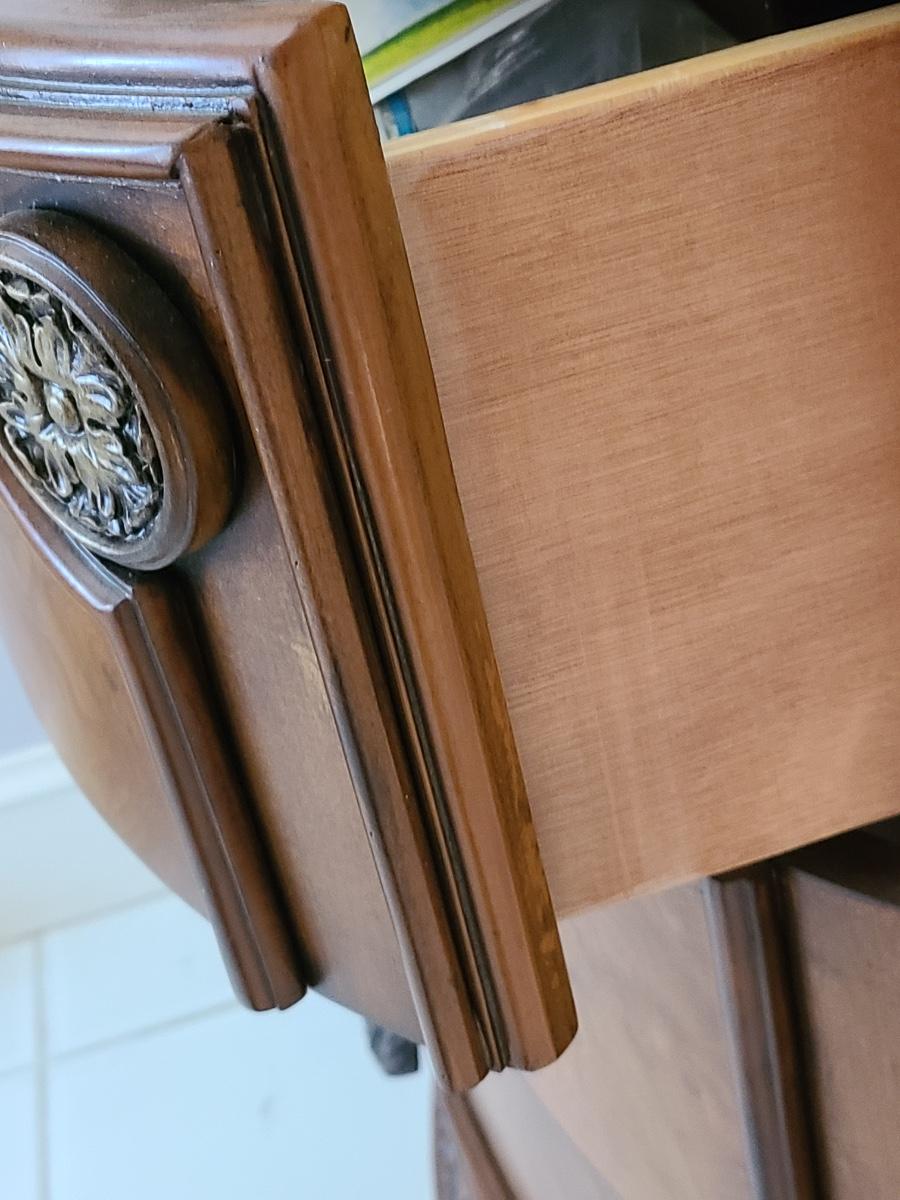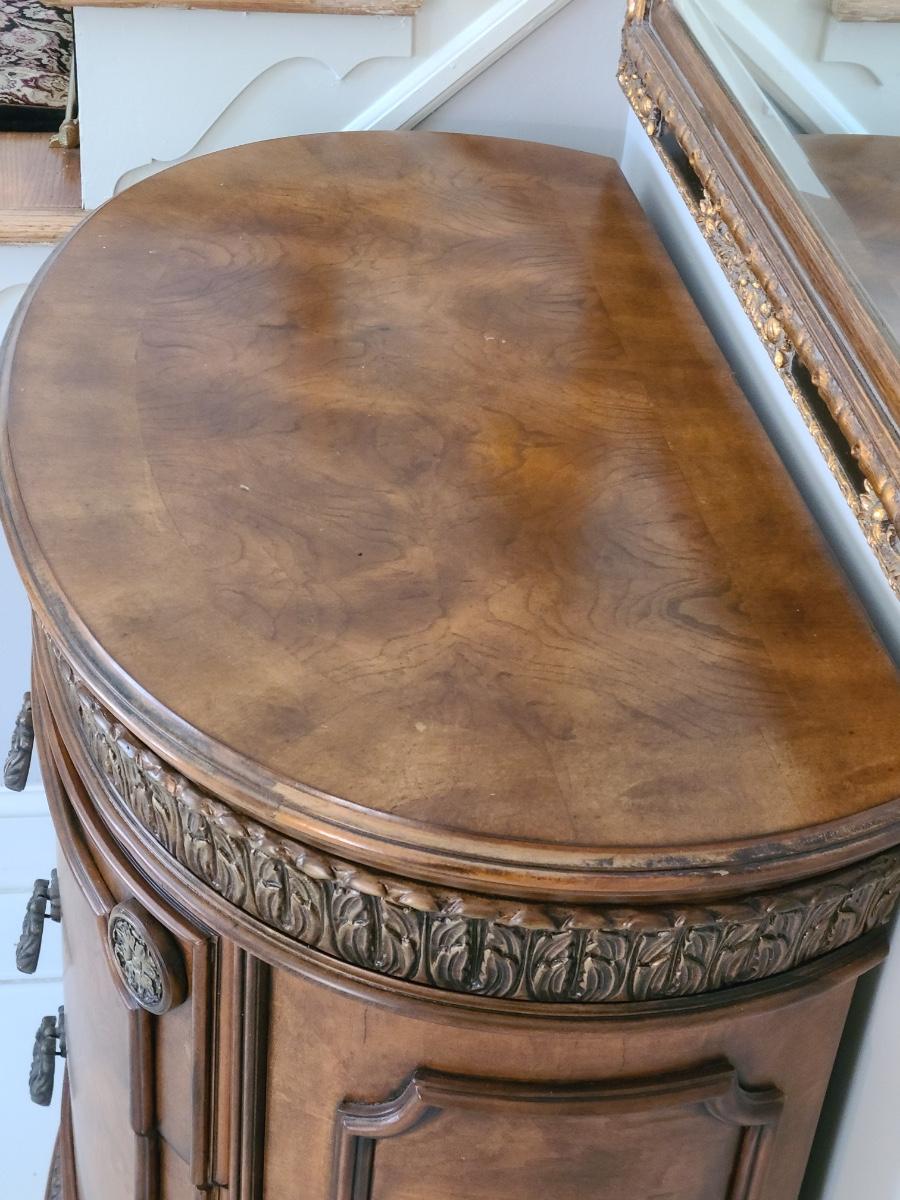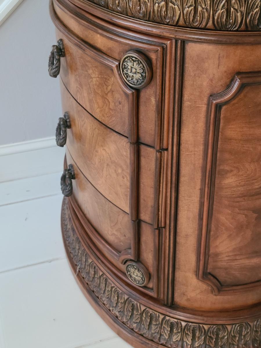 This lovely piece has been used as an entryway hall table and would look amazing in any room. It has three drawers for storage with gold accents on the hardware and carved edges. The front has a burl wood design. 34x19x35 inches tall. Solid piece with functional design. Please see all pictures as they are the best representation of the items. The pictures show condition, measurements if taken, and what is included in the lot. Due to the large amount that we photograph and the time frame, we are not always able to take measurements. All items unless noted, are pre-owned and have been used. If you purchased furniture, you must bring help. We do not allow one person to carry large furniture out on their own. Bring help, tools and a truck for the safety of our client’s homes, and your personal safety. Company policy. Thank you.