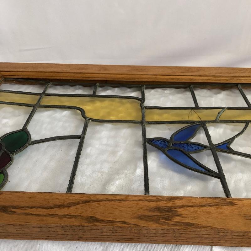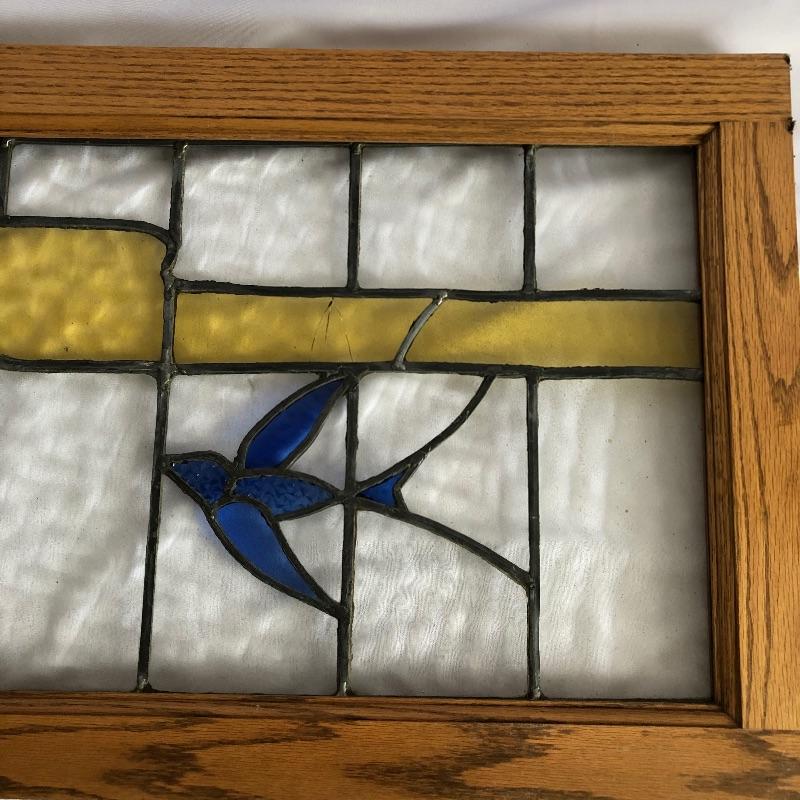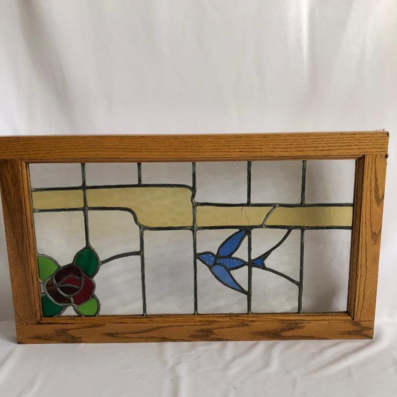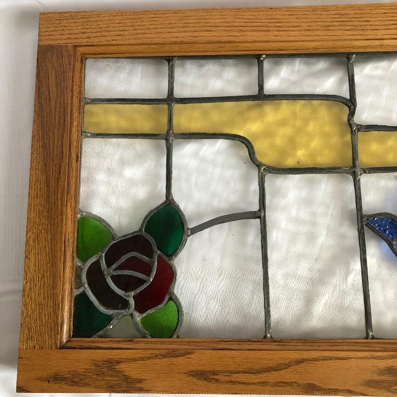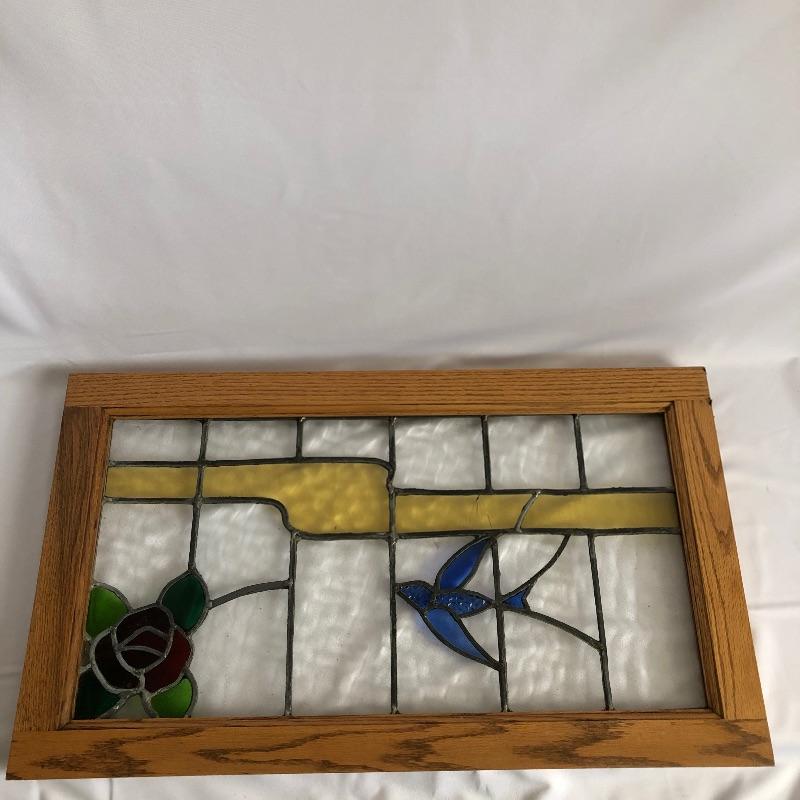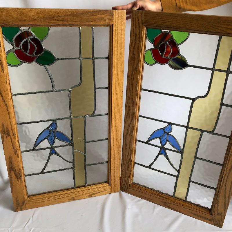 These 2 bird and Glasgow rose framed stained and leaded glass pieces measure approximately 35.75” x 2” x 20.75”.