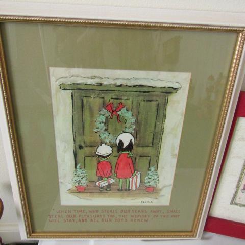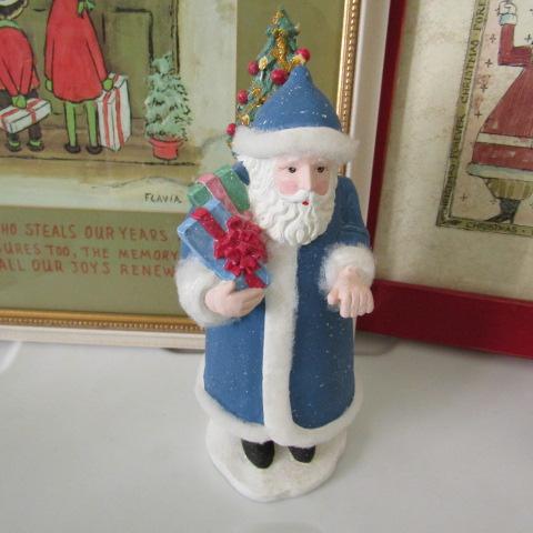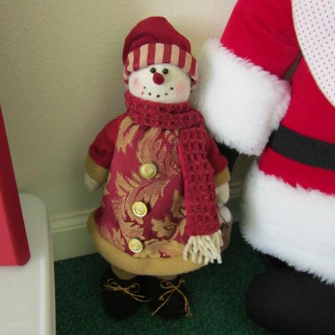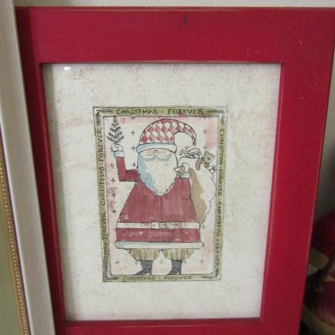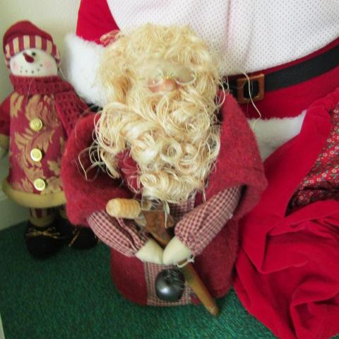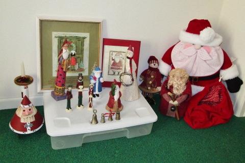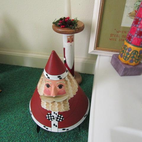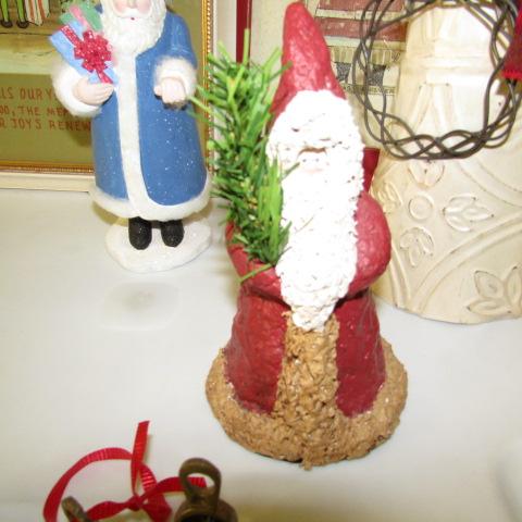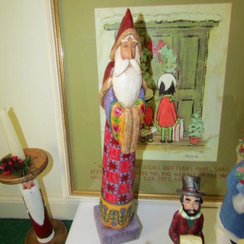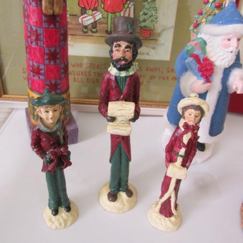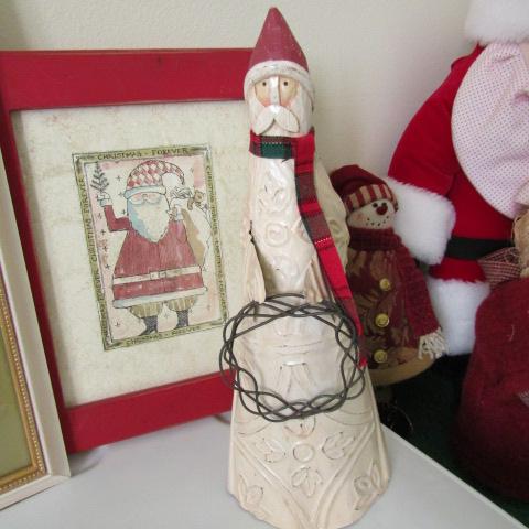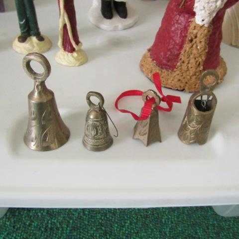 SANTA'S, SNOWMEN, CAROLERS AND A PICTURE OF SANTA. BRASS BELLS TOO