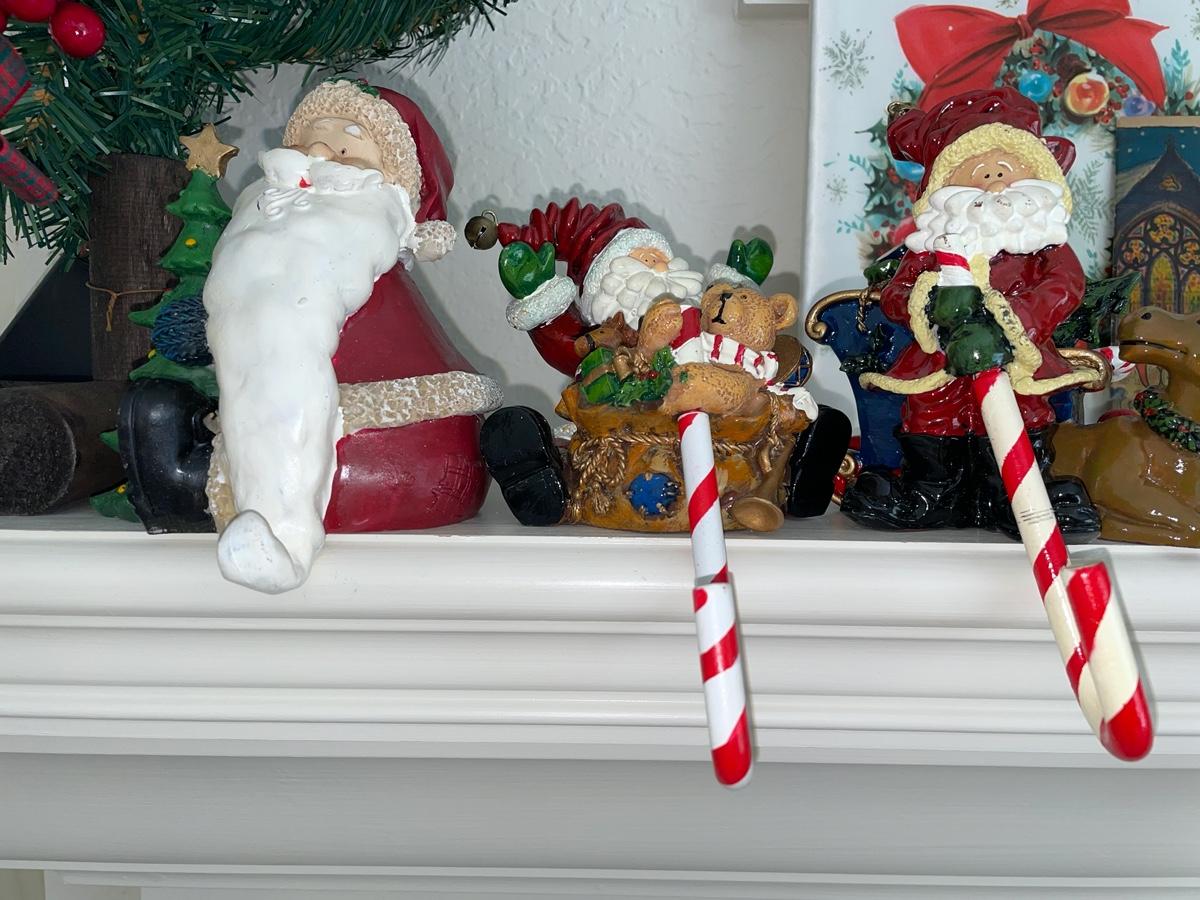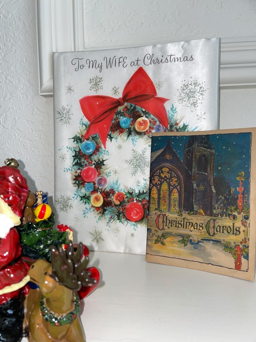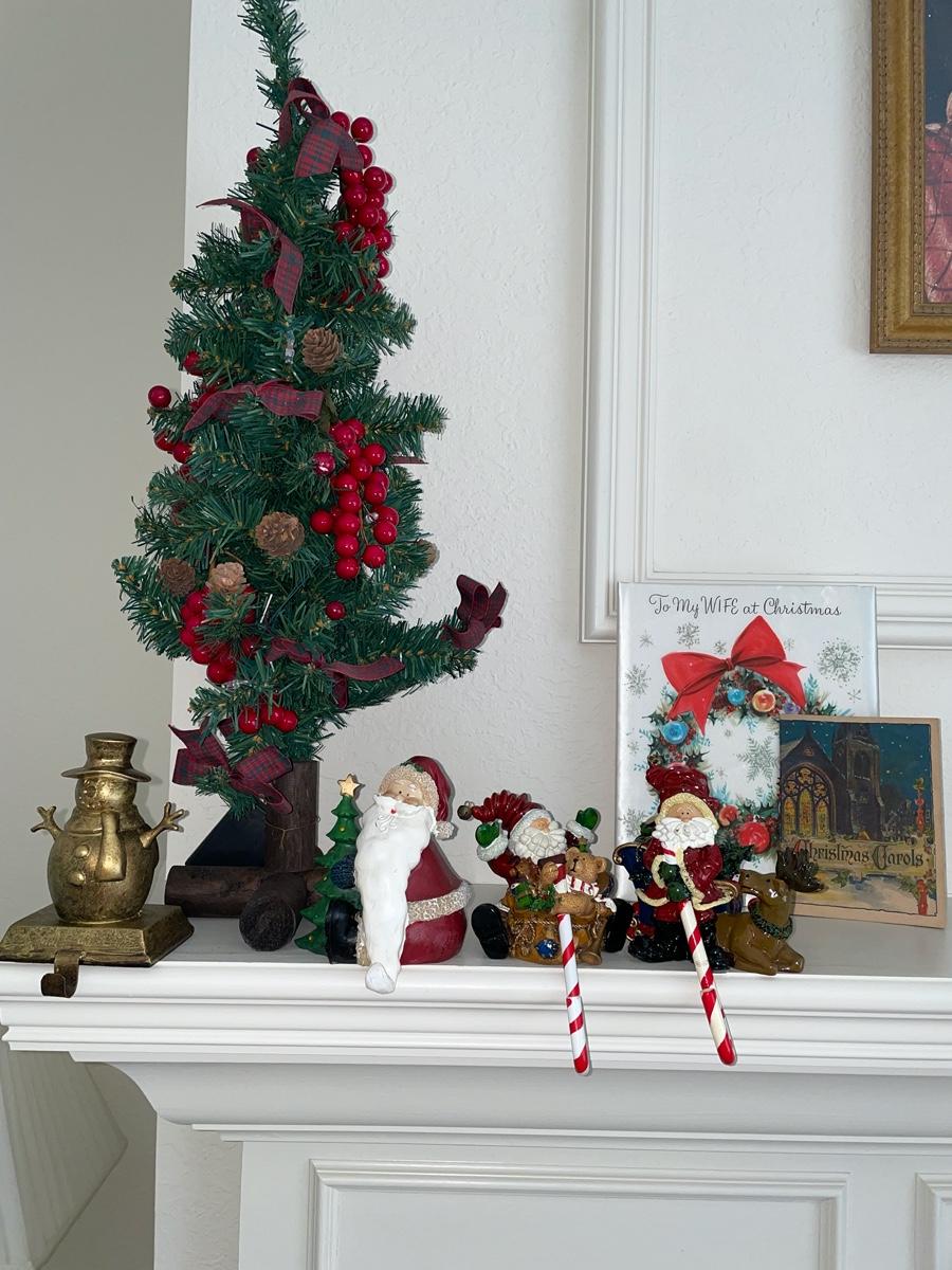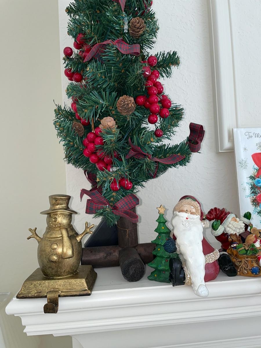 four different stocking angers, a miniature artificial Christmas tree and vintage card and an antique carol pamphlet