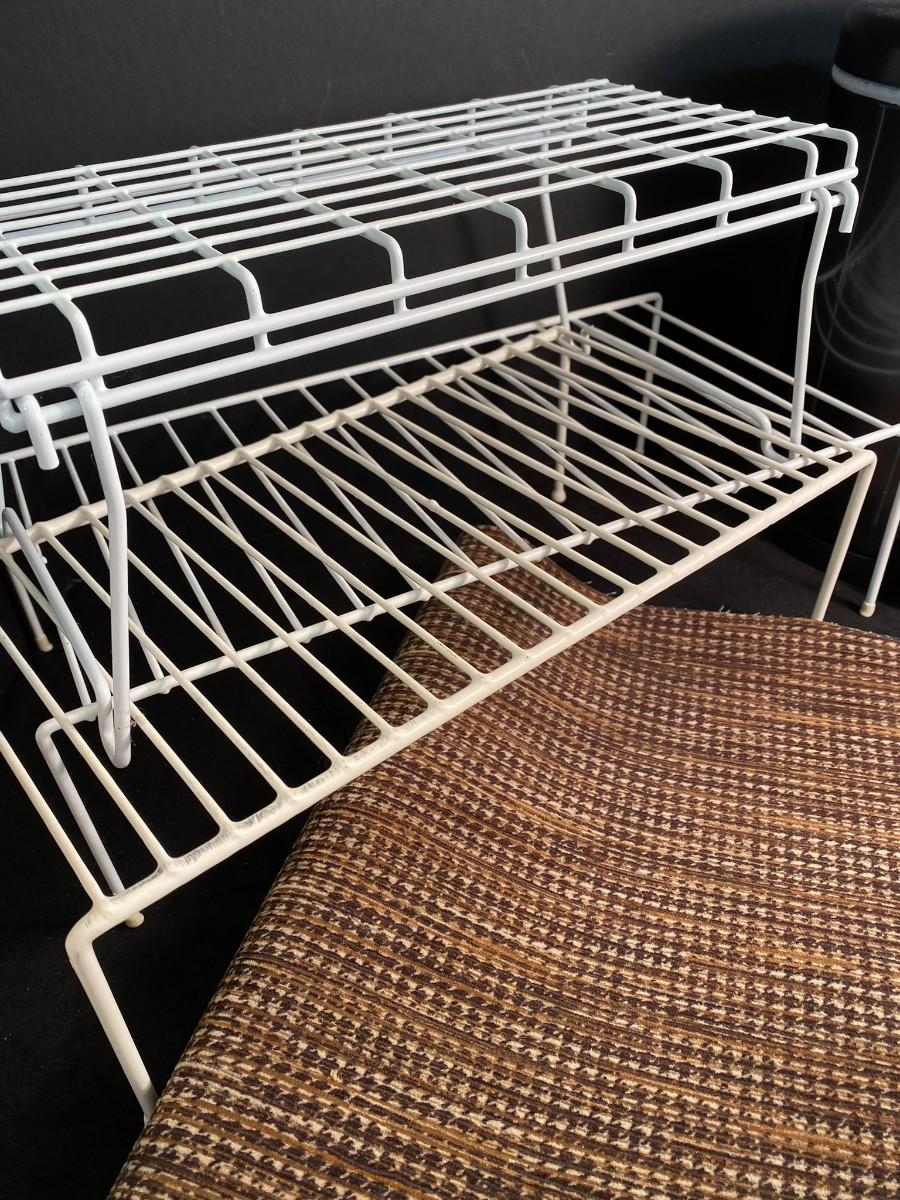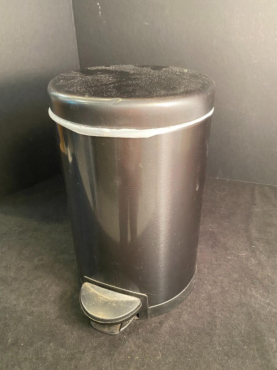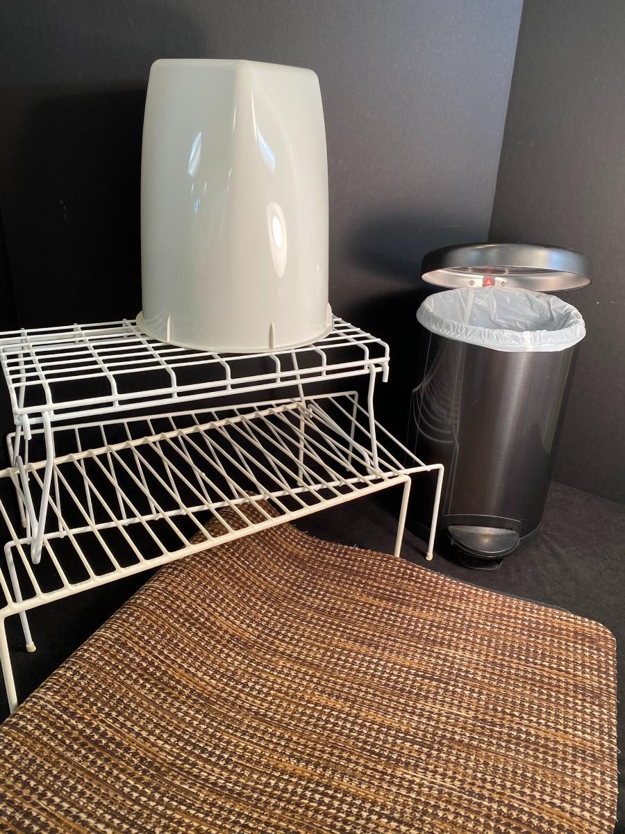 Step open small nice waste basket, plastic wastebasket, plastic wire shelf/cabinet inserts, and small door/area mat.